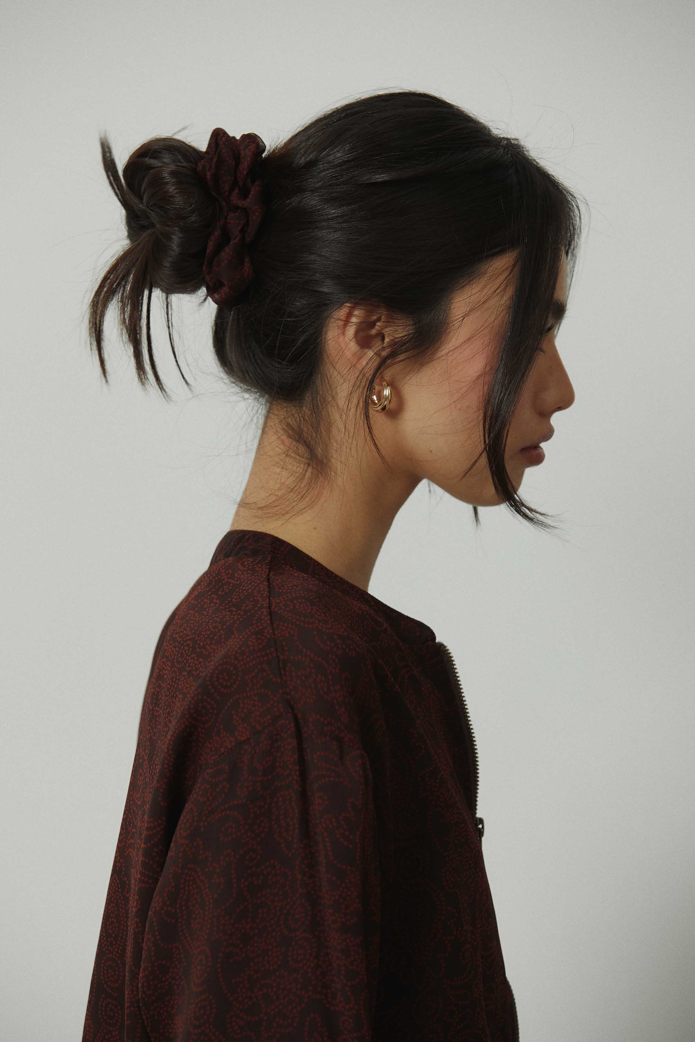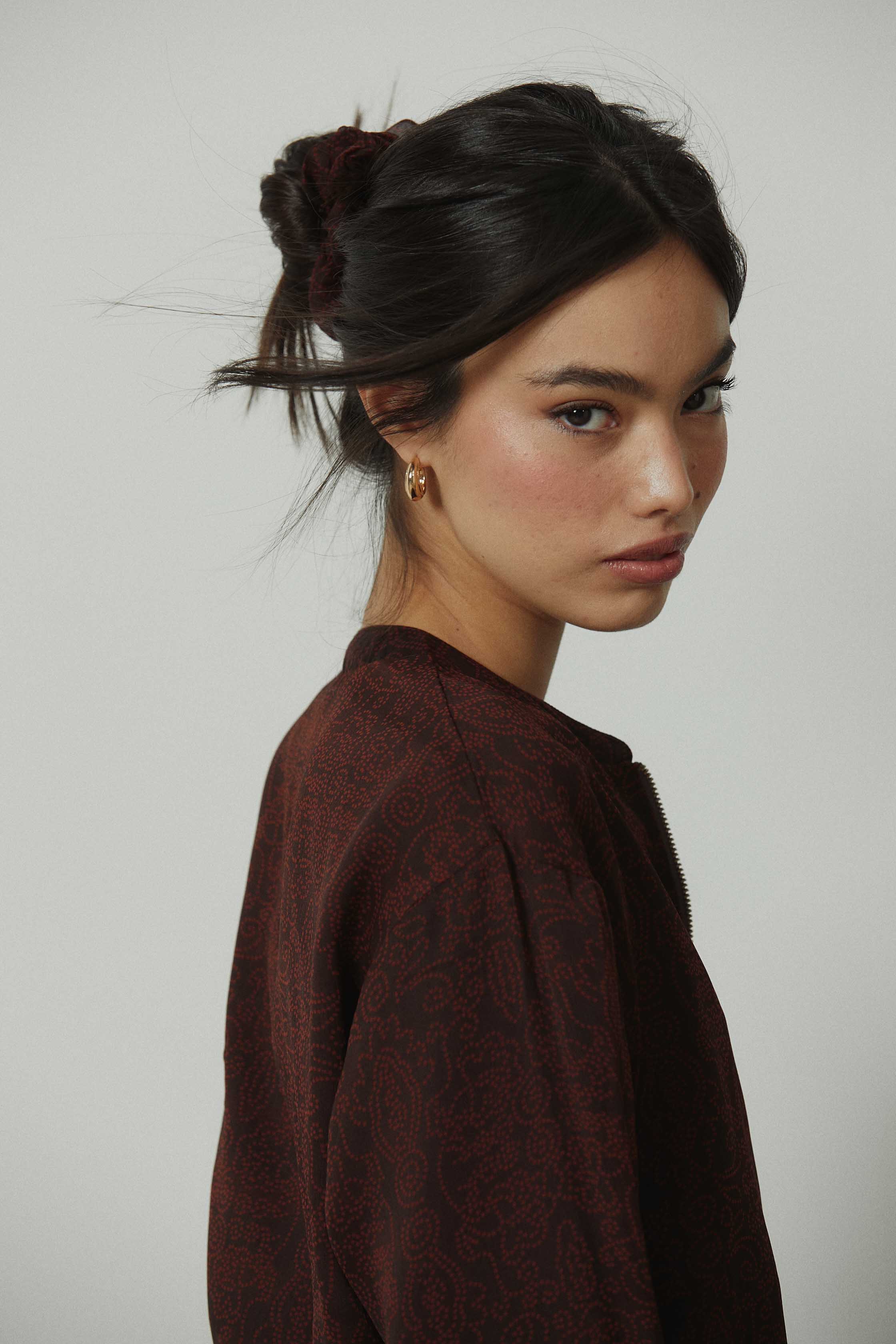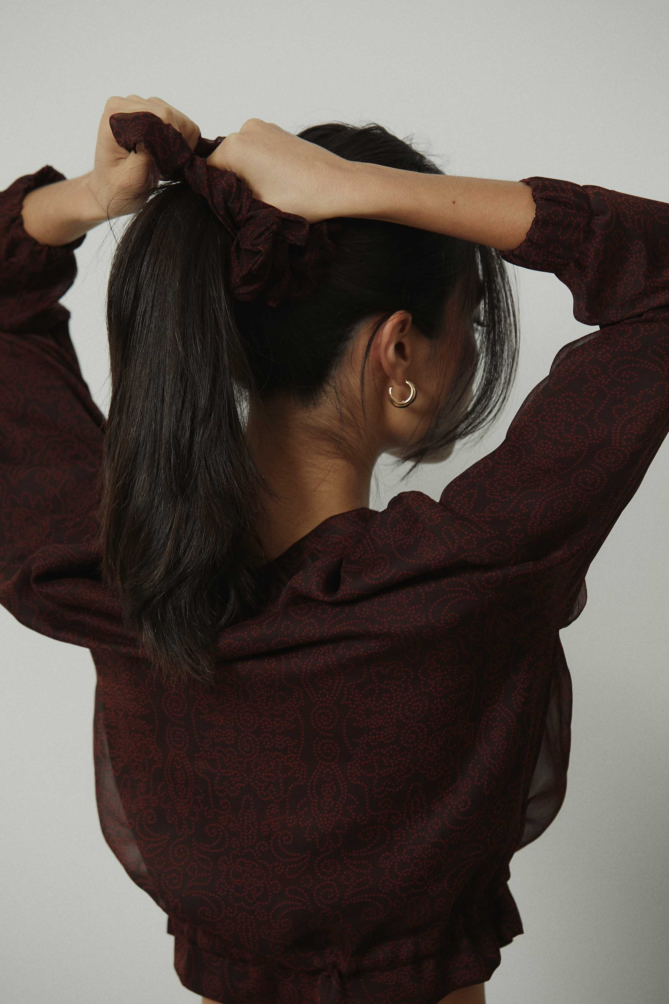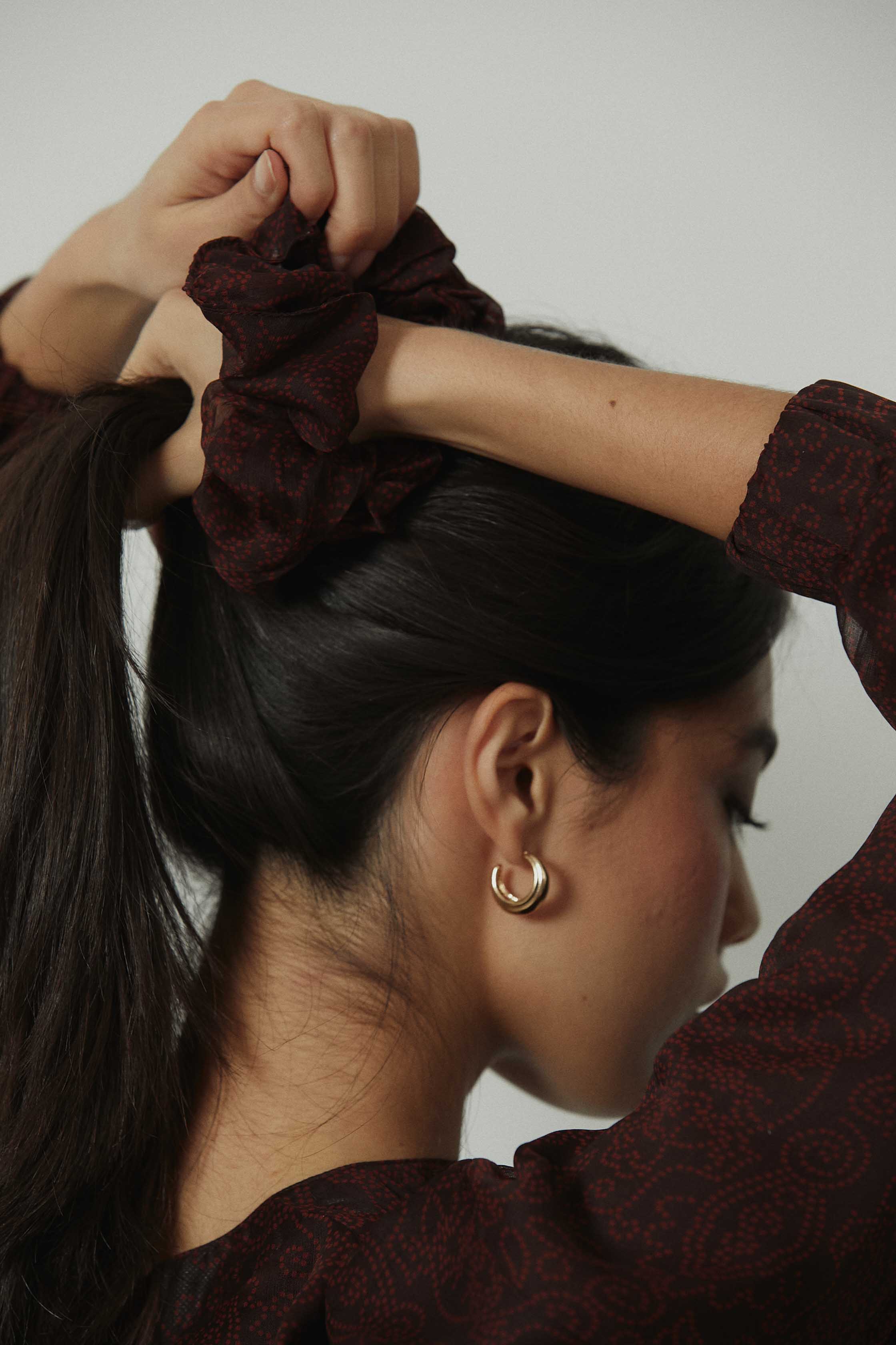 Coletero de tela con estampado paisley en tonos marrón y granate. Diseño fruncido, suave y con buena sujeción, pensado para recoger el cabello sin marcar ni tirar. Un accesorio pequeño que suma coherencia al look y conecta con las prendas de la misma línea de estampado.