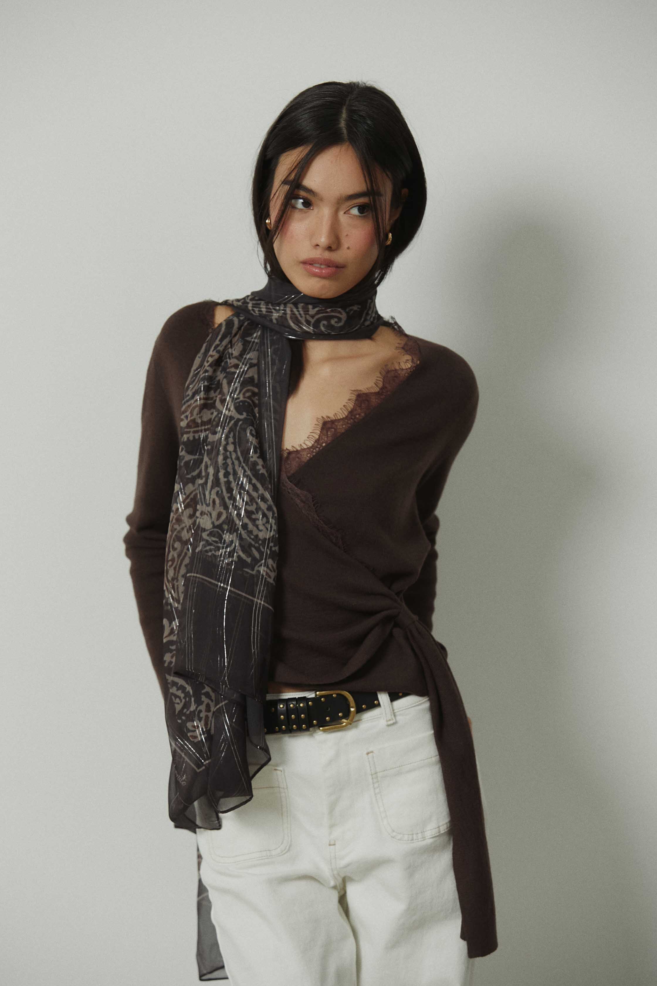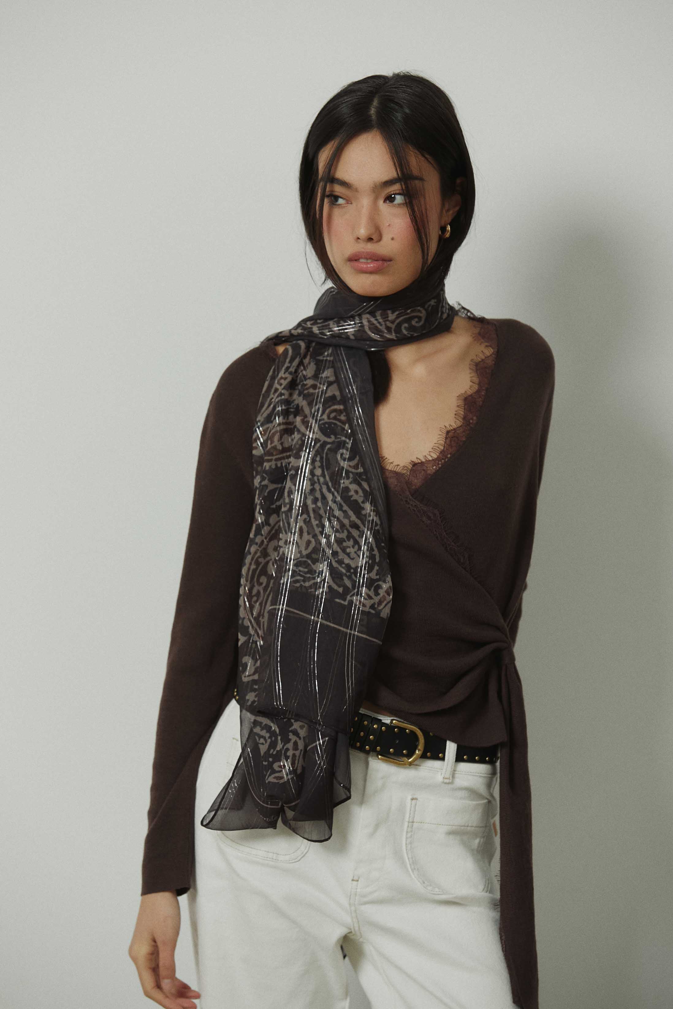 Foulard de formato grande en tono marrón con estampado de inspiración ornamental. Diseño ligero y fluido, con acabado ligeramente brillante que aporta un punto de luz al conjunto. Medidas amplias que permiten llevarlo al cuello, sobre los hombros o como complemento en bolsos.