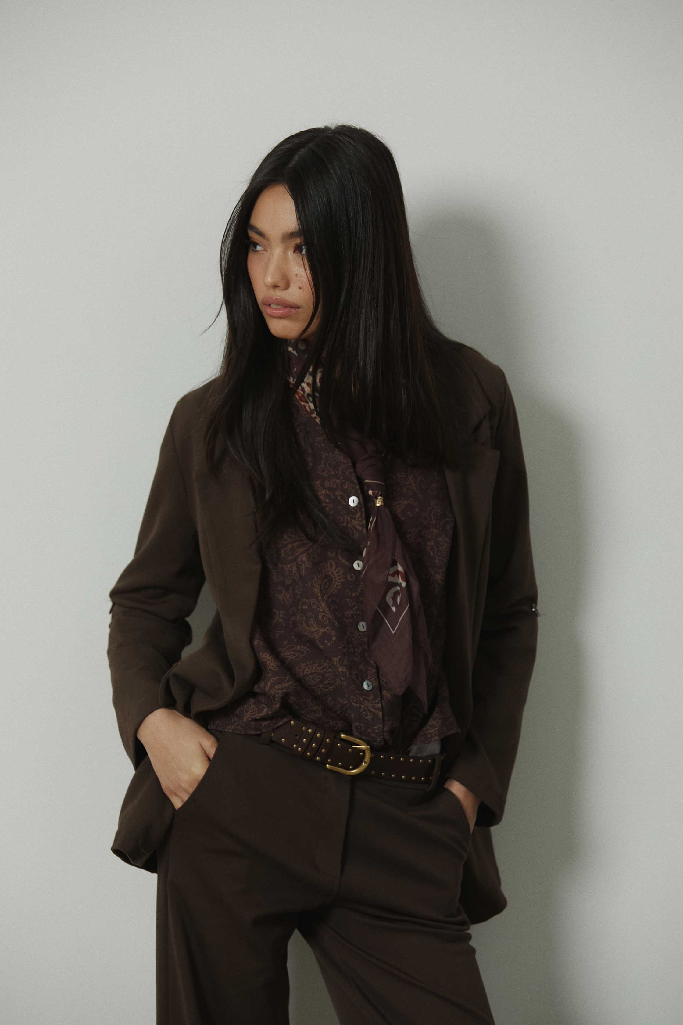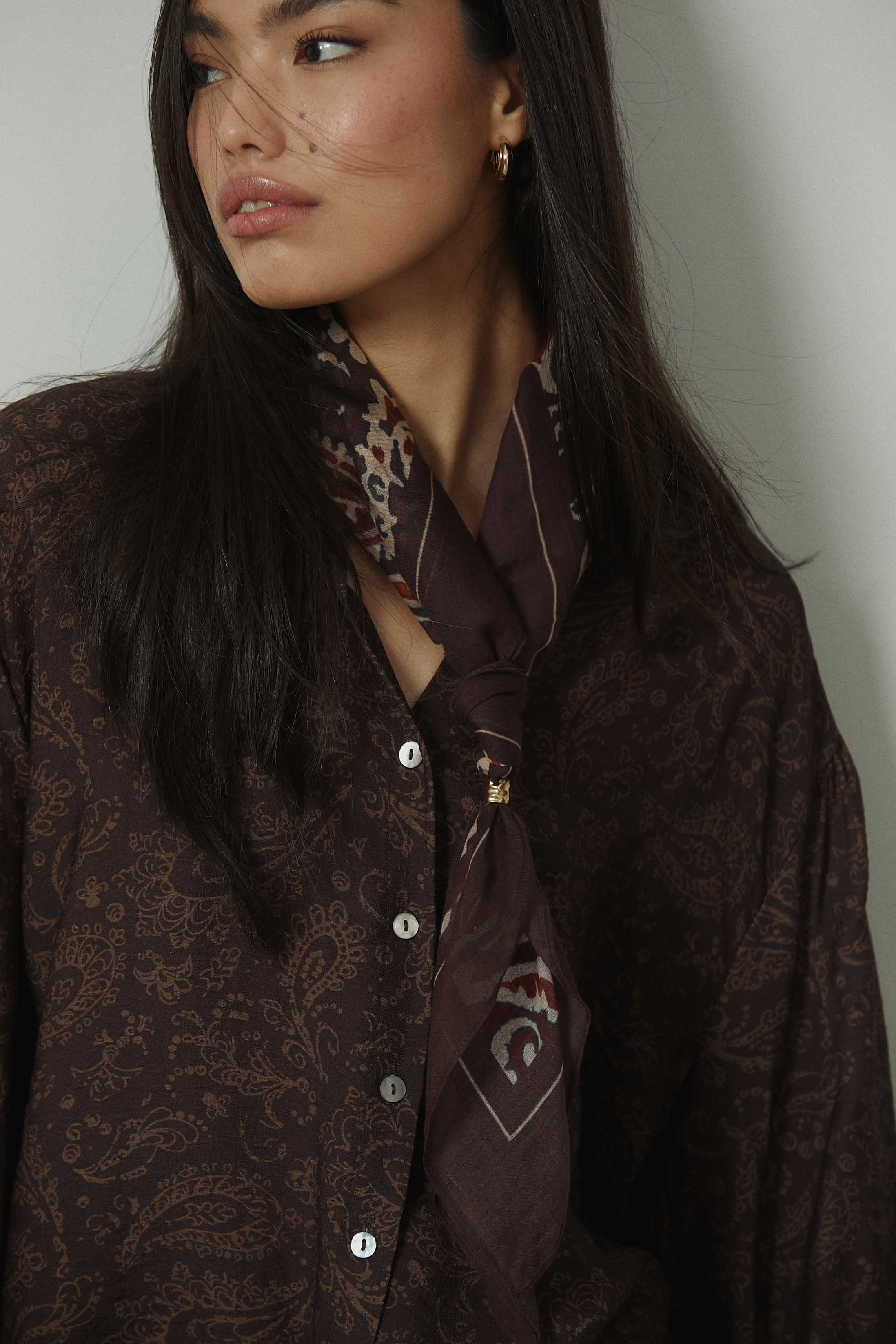 Pañuelo pequeño con estampado paisley en tonos marrones y crudos. Formato ligero y versátil, pensado para llevar al cuello, en el pelo o como detalle en bolsos y cinturones. Diseño cuidado que aporta un punto de contraste sin recargar el conjunto.