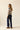 Vaquero azul de tiro medio-alto con corte recto y ligeramente acampanado. Presenta costuras marcadas en delantero y trasero que estilizan la silueta, bolsillos clásicos y cierre con botón y cremallera. Detalle de etiqueta de la marca en la parte trasera.