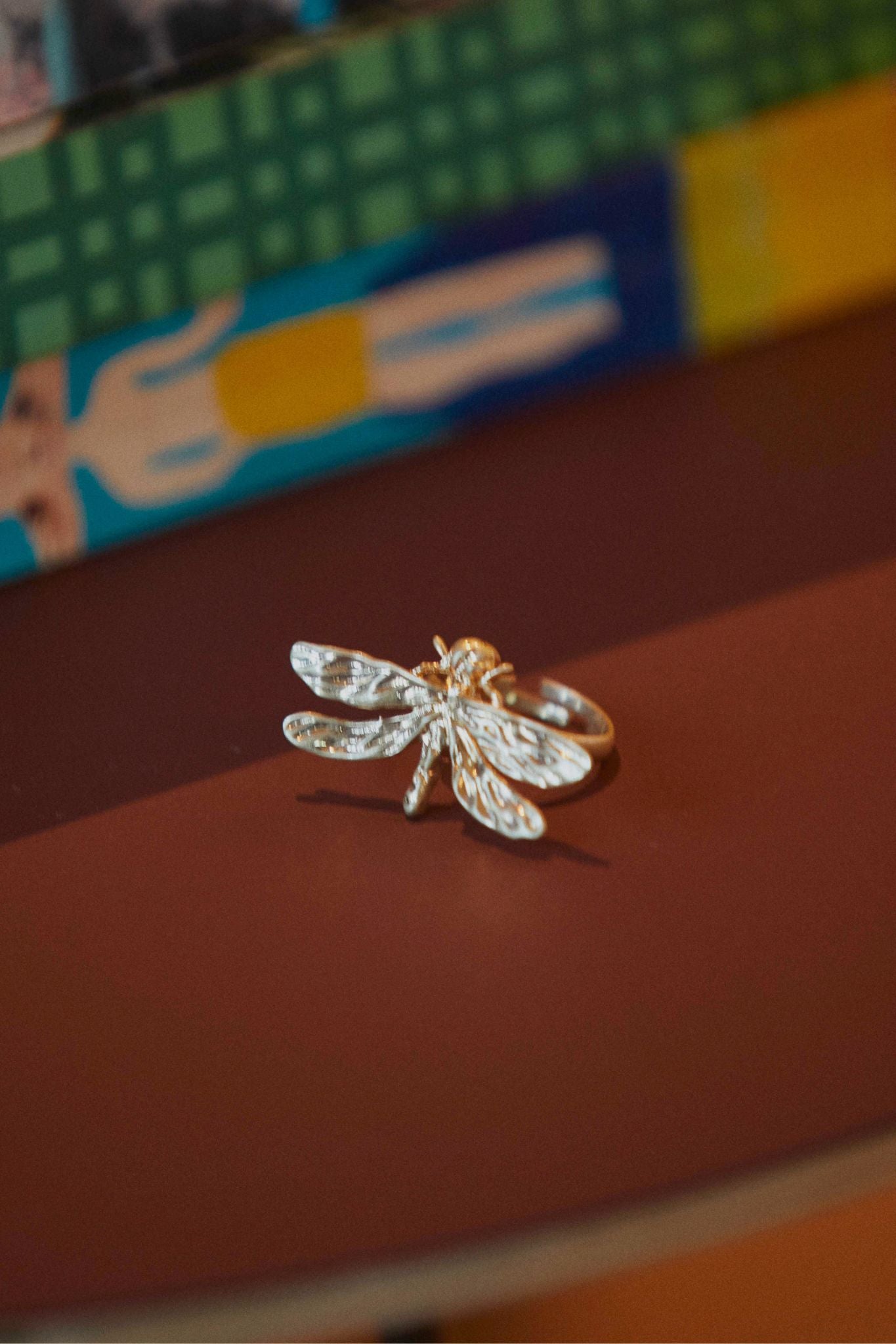 Anillo metálico con diseño de libélula en relieve. Presenta alas detalladas con textura grabada que aportan volumen y carácter a la pieza. Su acabado dorado aporta un brillo suave.