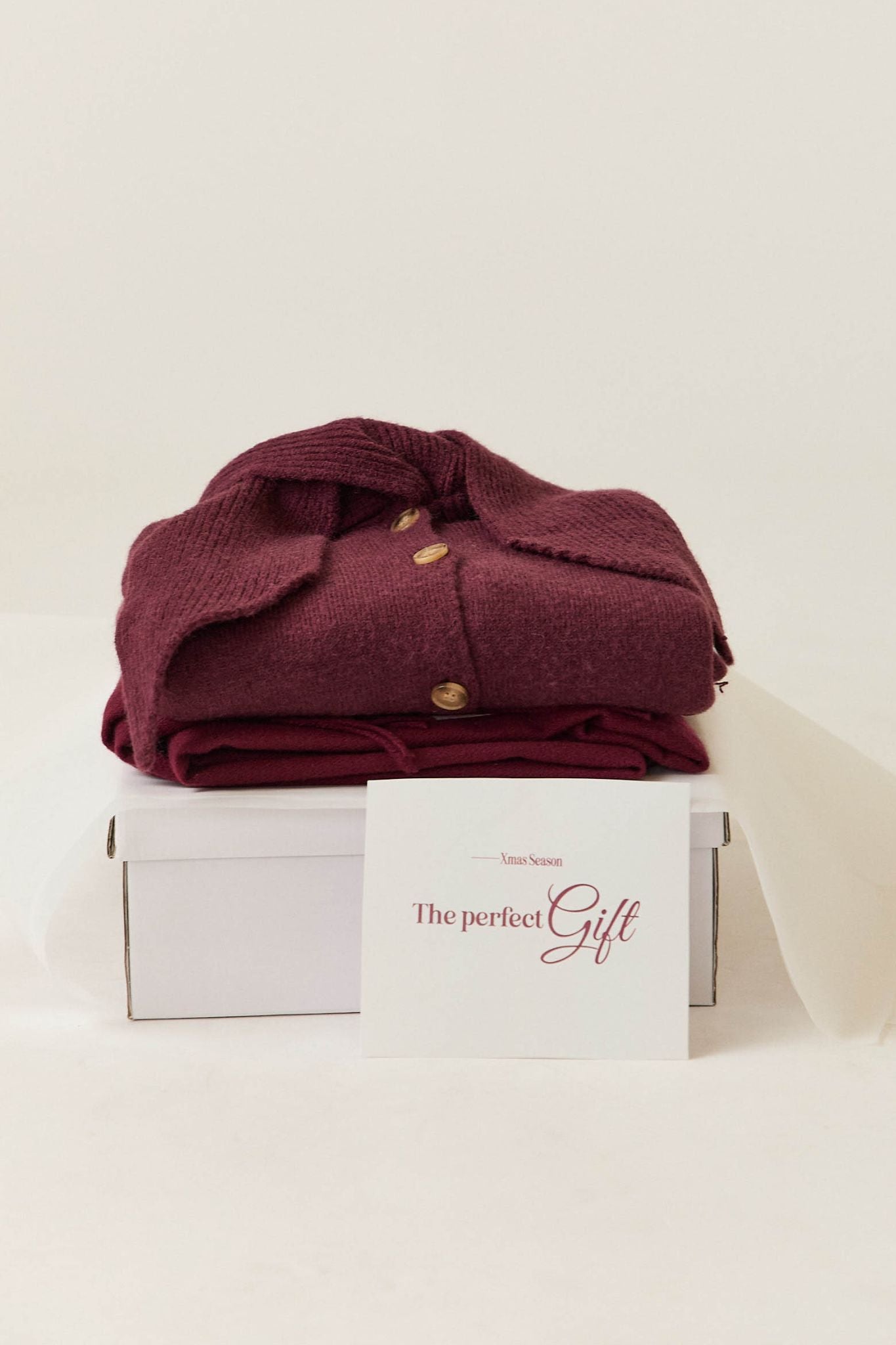 Cárdigan de punto suave en tono berenjena con escote en pico y detalle de lazada en el cuello del mismo tejido. Presenta cierre frontal con botones y un corte recto que aporta comodidad sin perder estilo. Su diseño combina un aire clásico con un toque romántico y femenino.