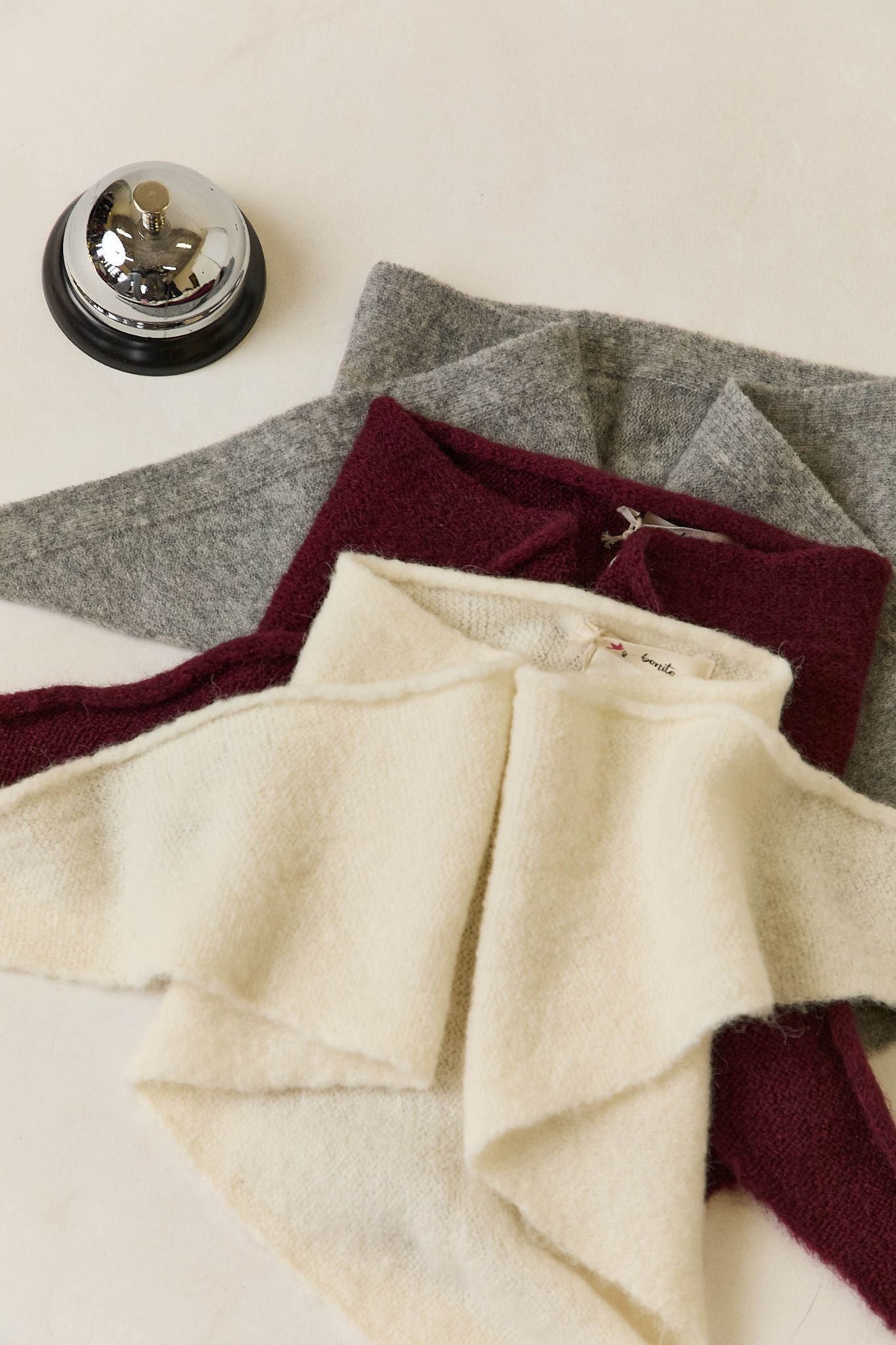 Pañuelo de lana suave en tono crudo. Presenta forma triangular con terminación en pico y se anuda fácilmente al cuello, aportando calidez y un acabado envolvente al look. Su textura mullida y ligera lo convierte en un accesorio cómodo y versátil.