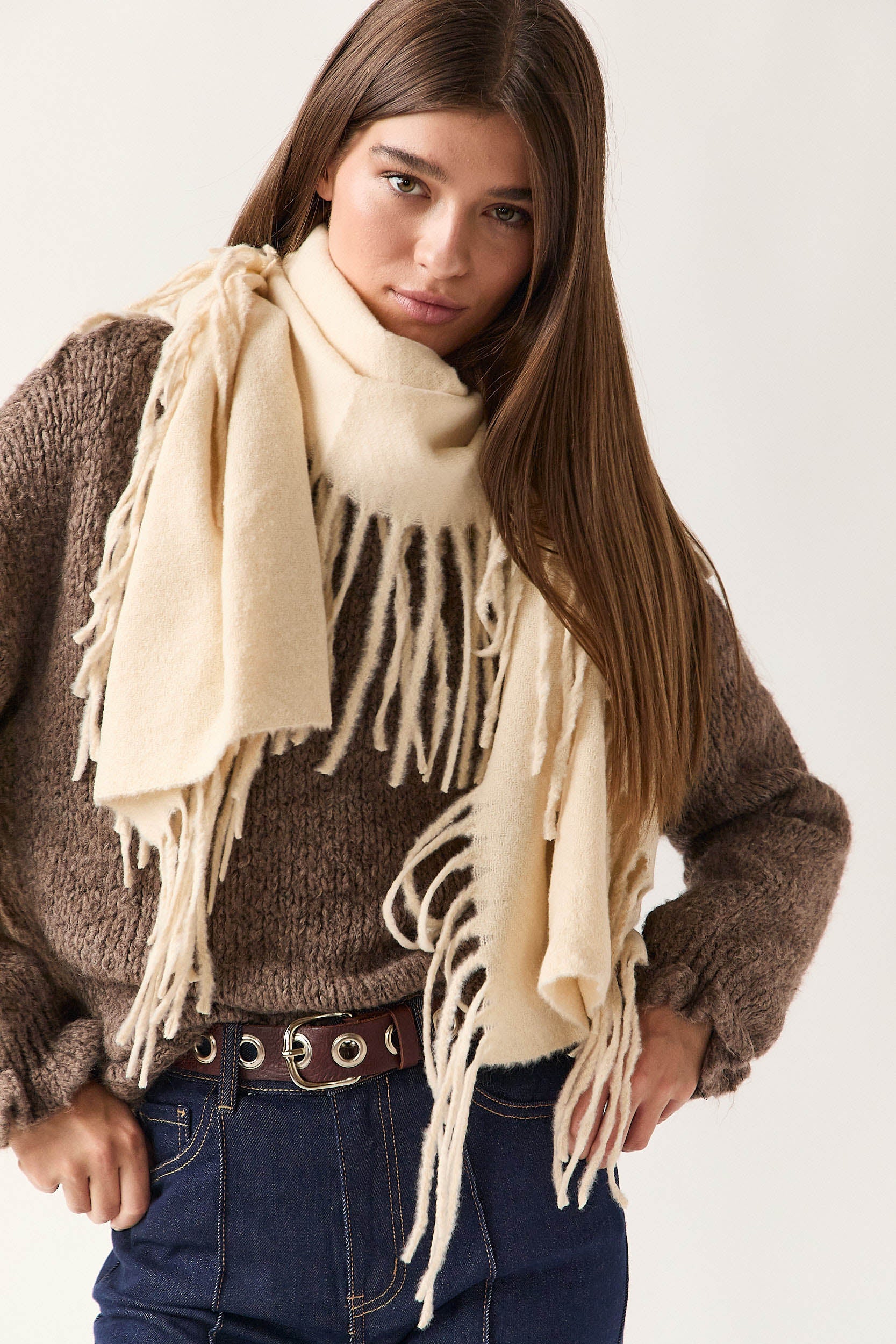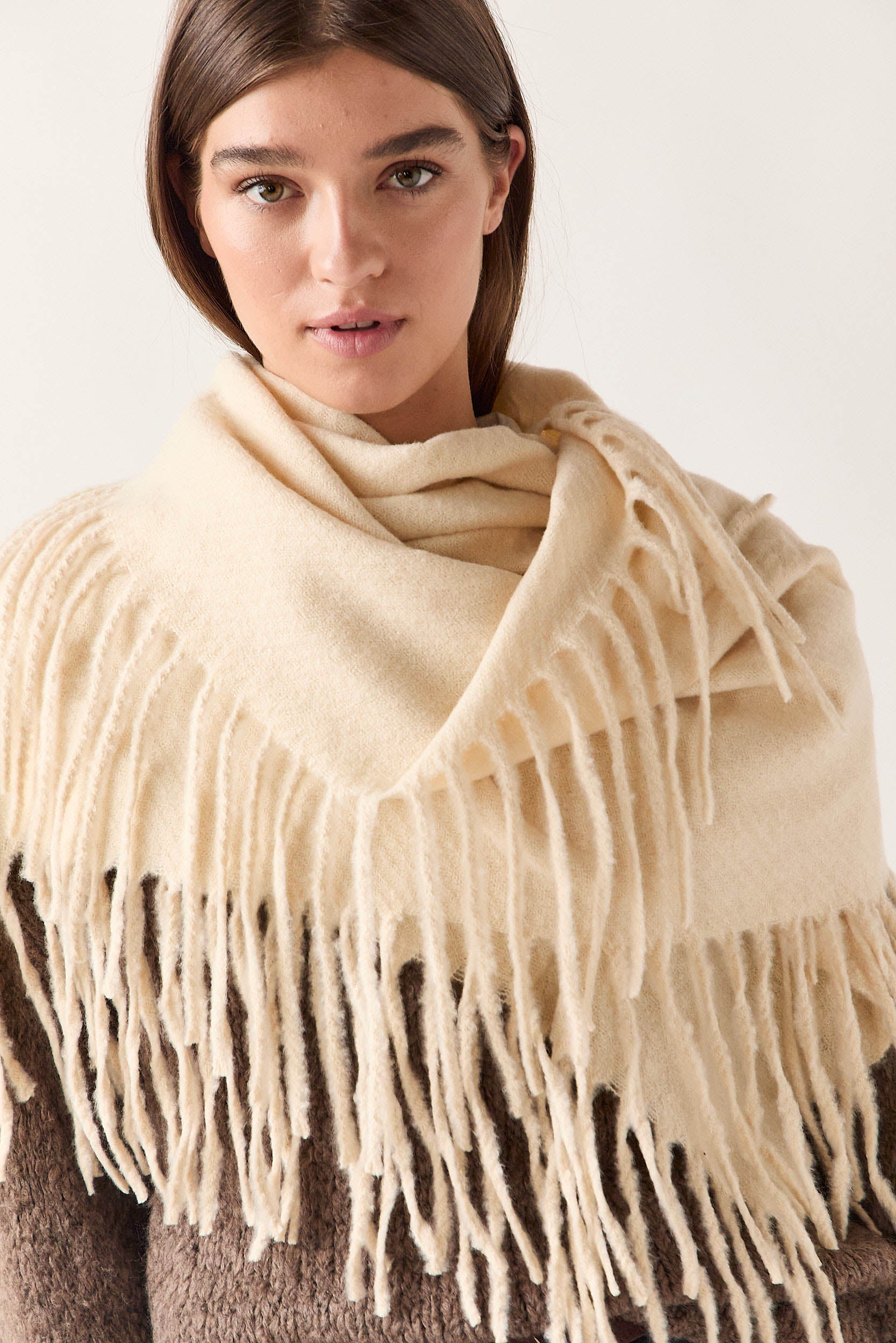 Bufanda amplia en tono crema con diseño liso y largos flecos decorativos en los laterales. De textura suave y ligera, envuelve con calidez aportando volumen y movimiento al look. Su formato envolvente permite llevarla tanto al cuello como sobre los hombros, a modo de chal.