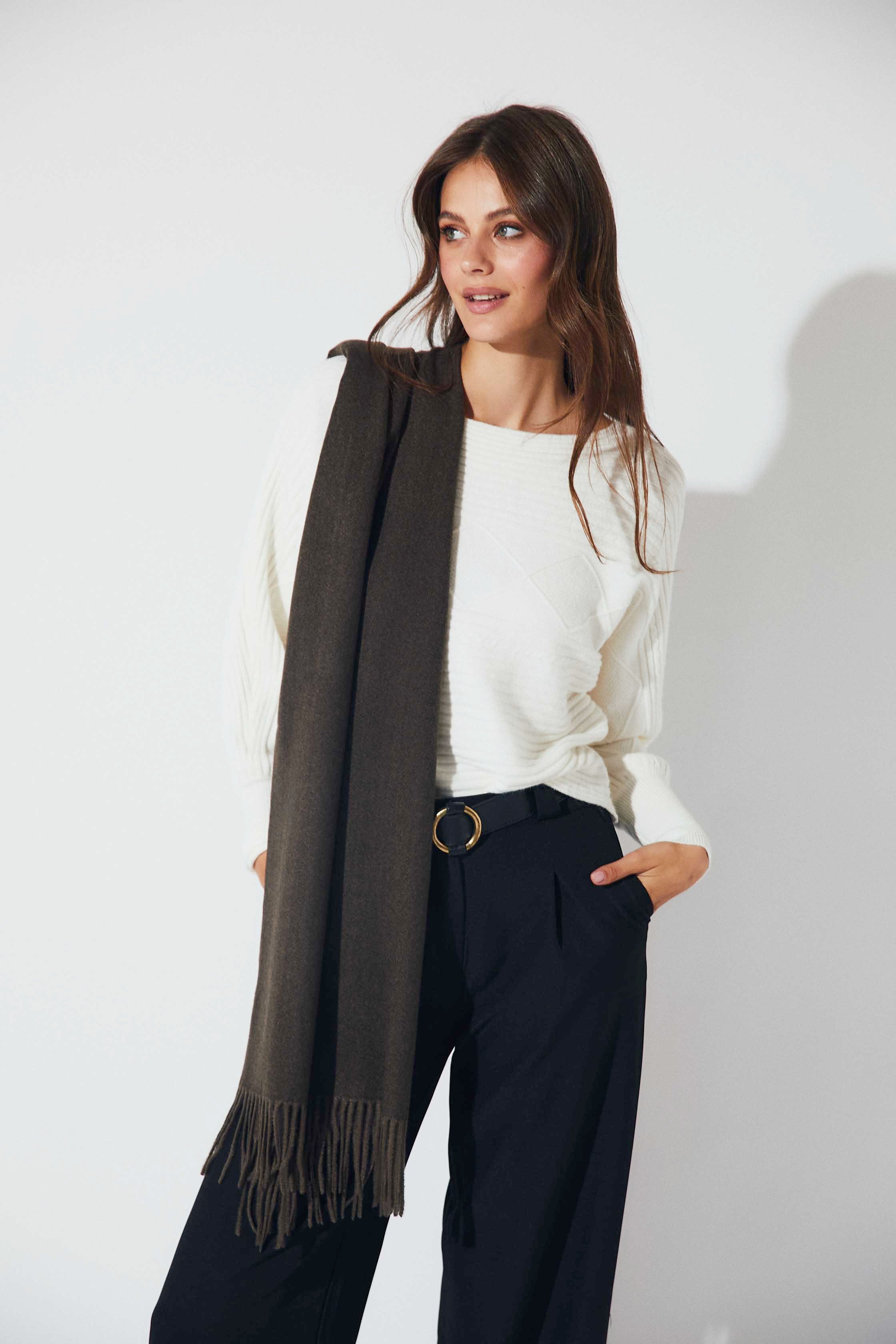 Bufanda lisa en tono marrón, de tacto suave y acabado con flecos en los extremos. Su diseño sencillo y alargado la convierte en un básico imprescindible para completar los looks de invierno con un toque cálido y elegante.
