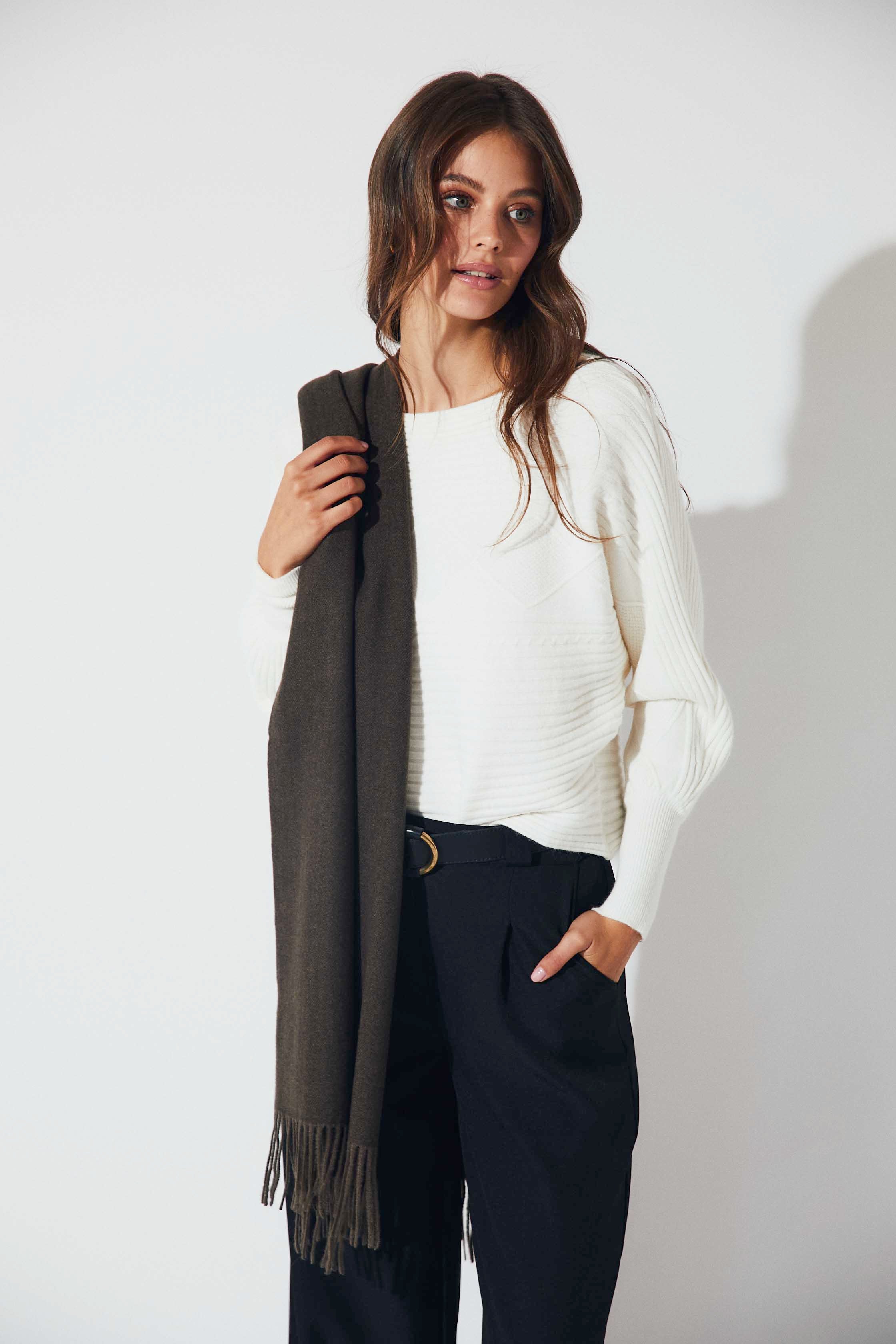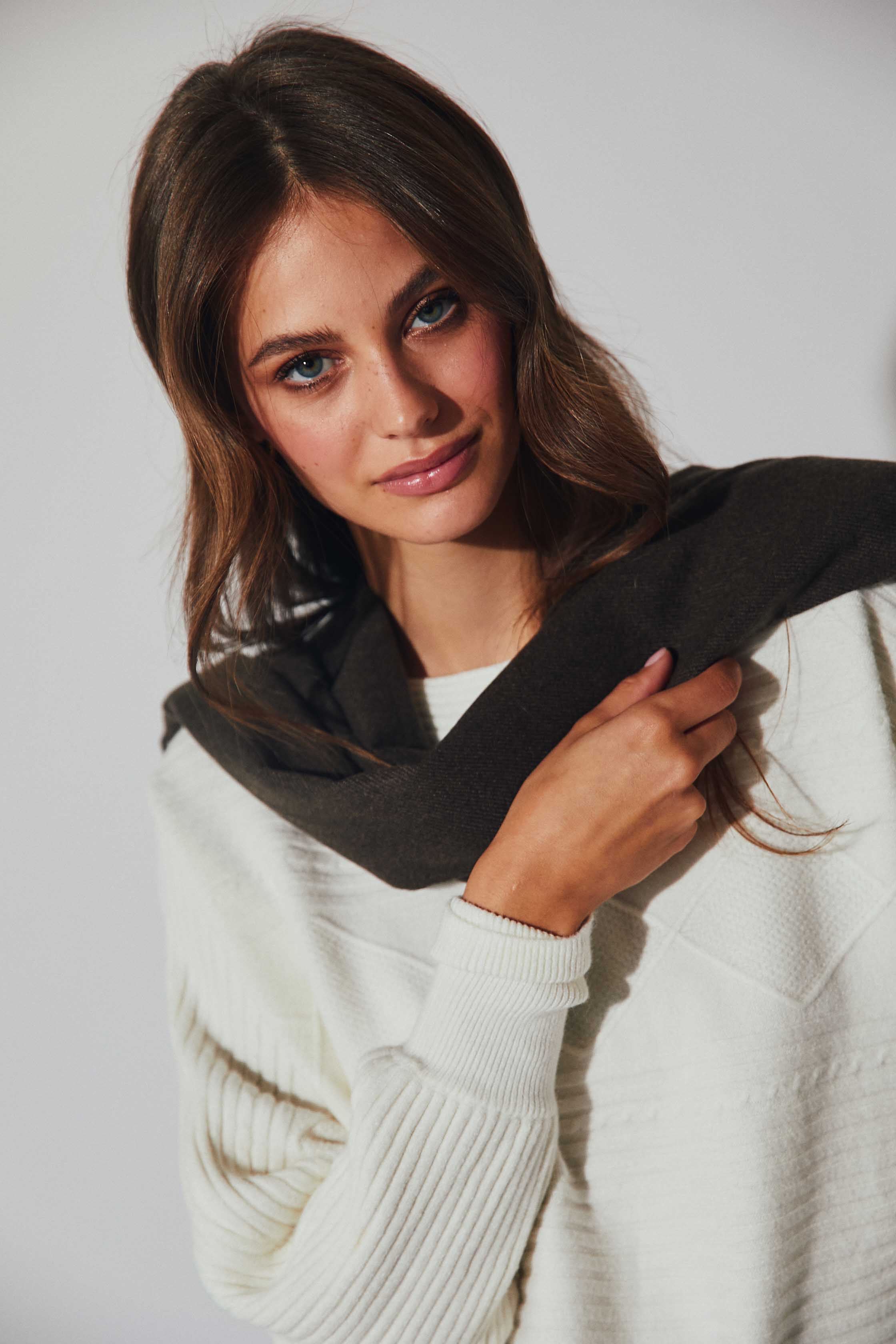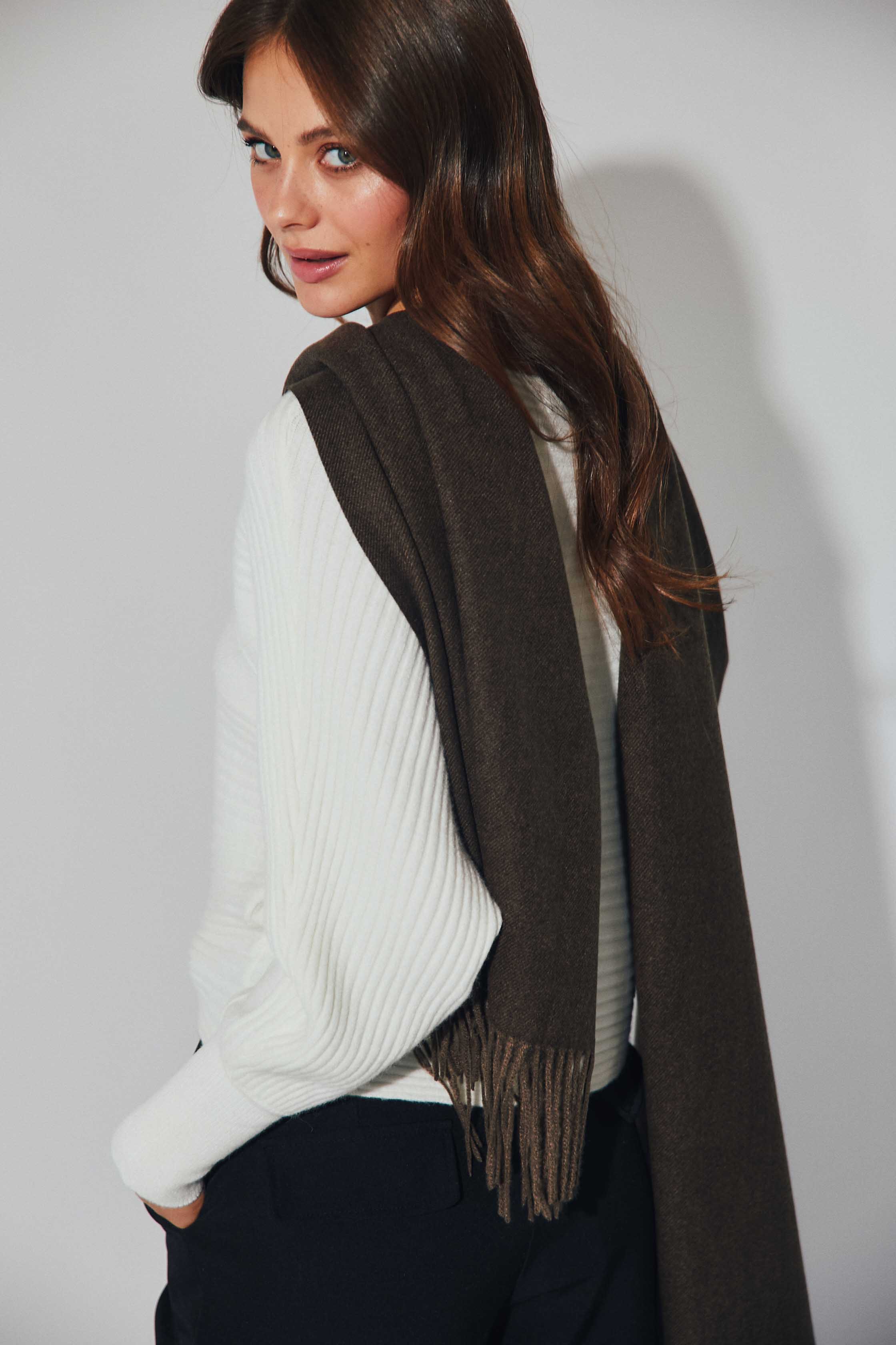 Perfecta para combinar con abrigos de paño o plumíferos, aporta contraste a tonos neutros o complementa gamas terrosas. Se puede llevar doblada al cuello o suelta sobre los hombros para un aire más desenfadado.