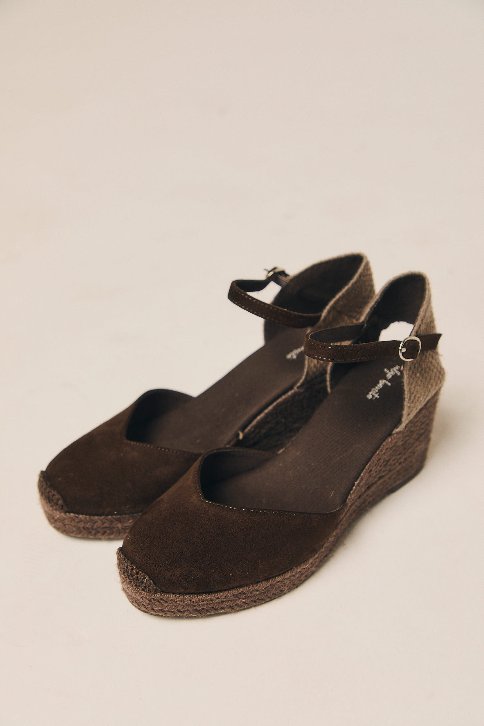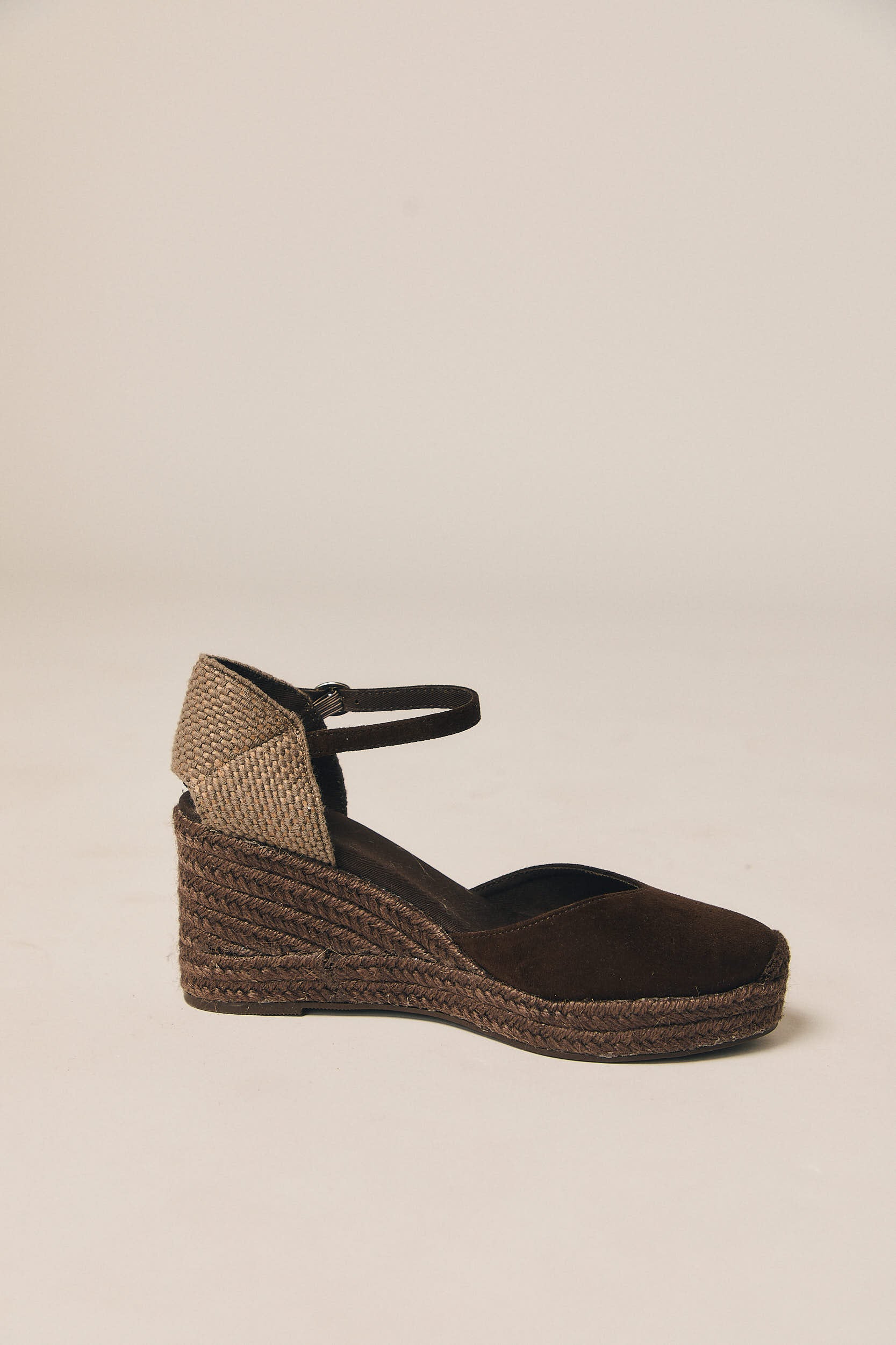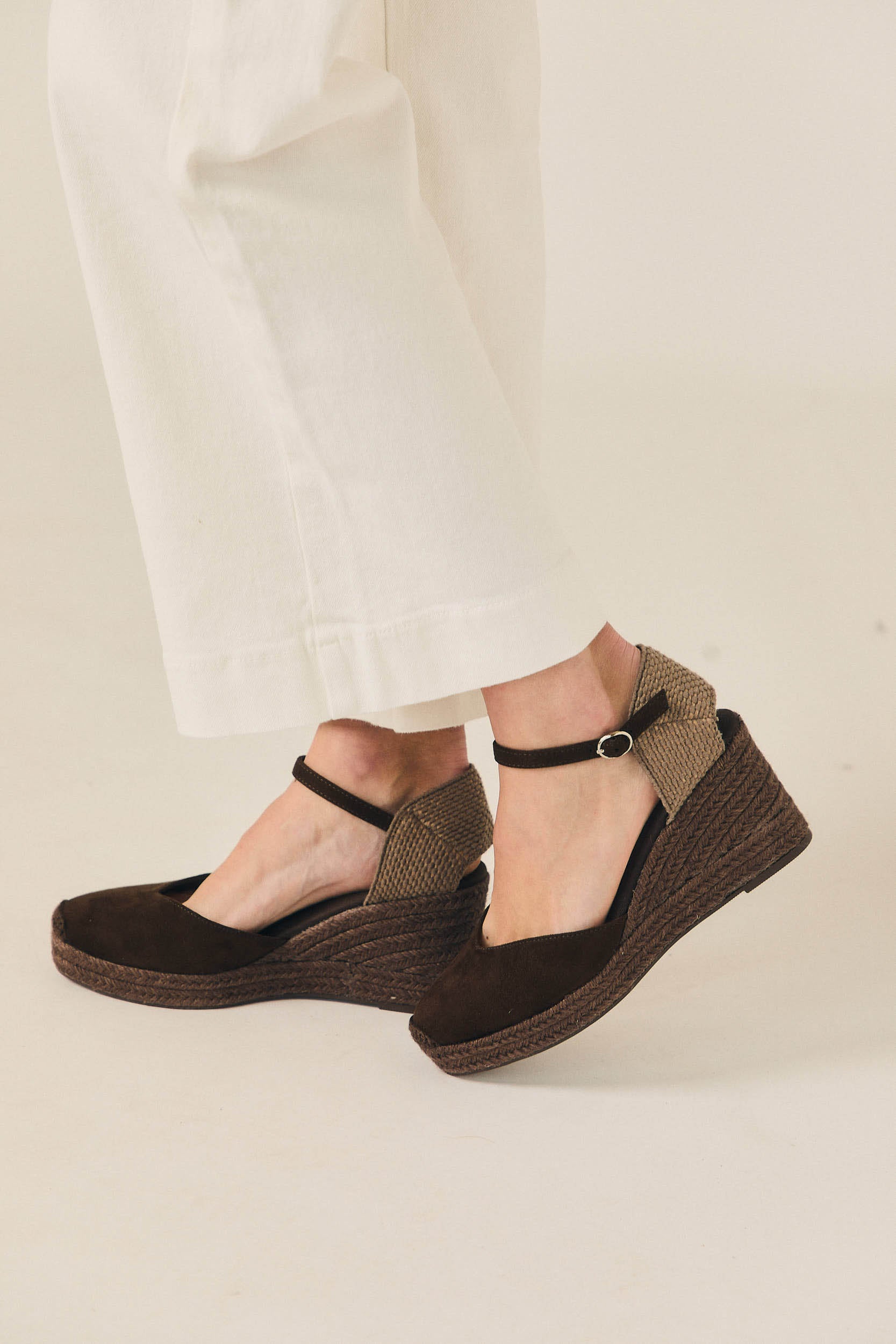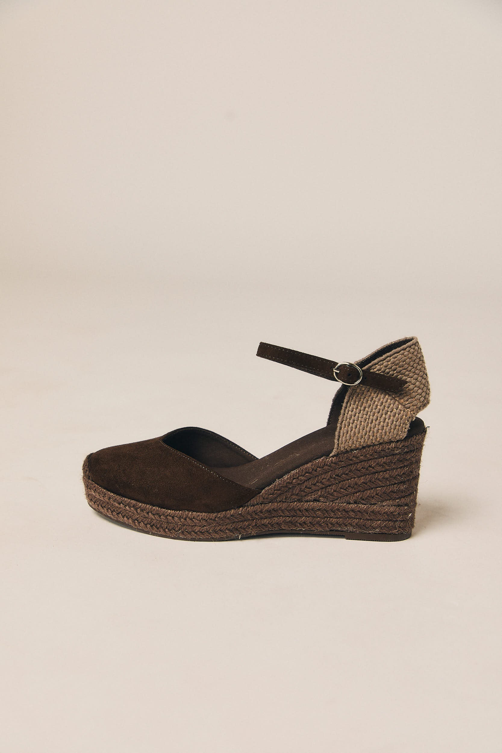 Alpargata de cuña en tono marrón con diseño cerrado en la parte delantera y pulsera al tobillo con hebilla. Cuña forrada en yute y talonera con textura trenzada que aporta un acabado natural.