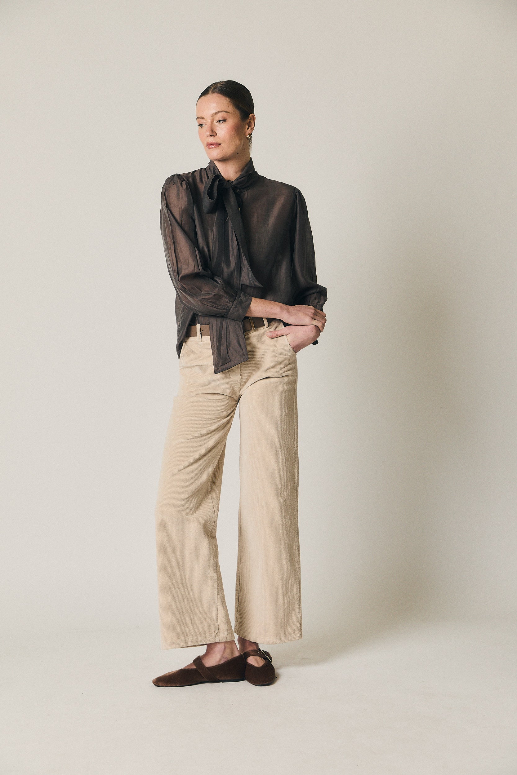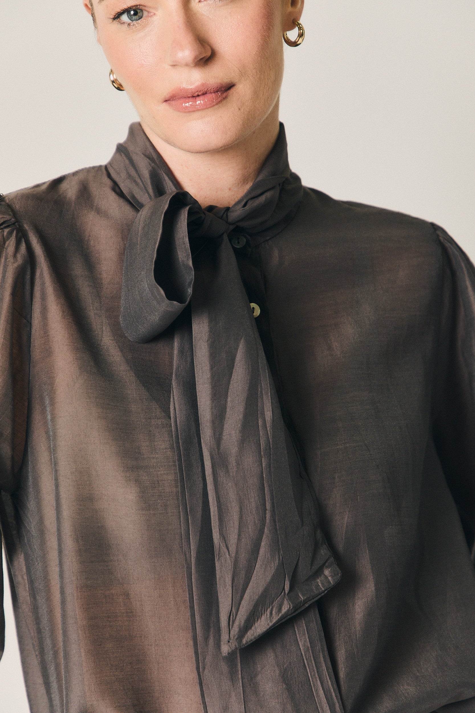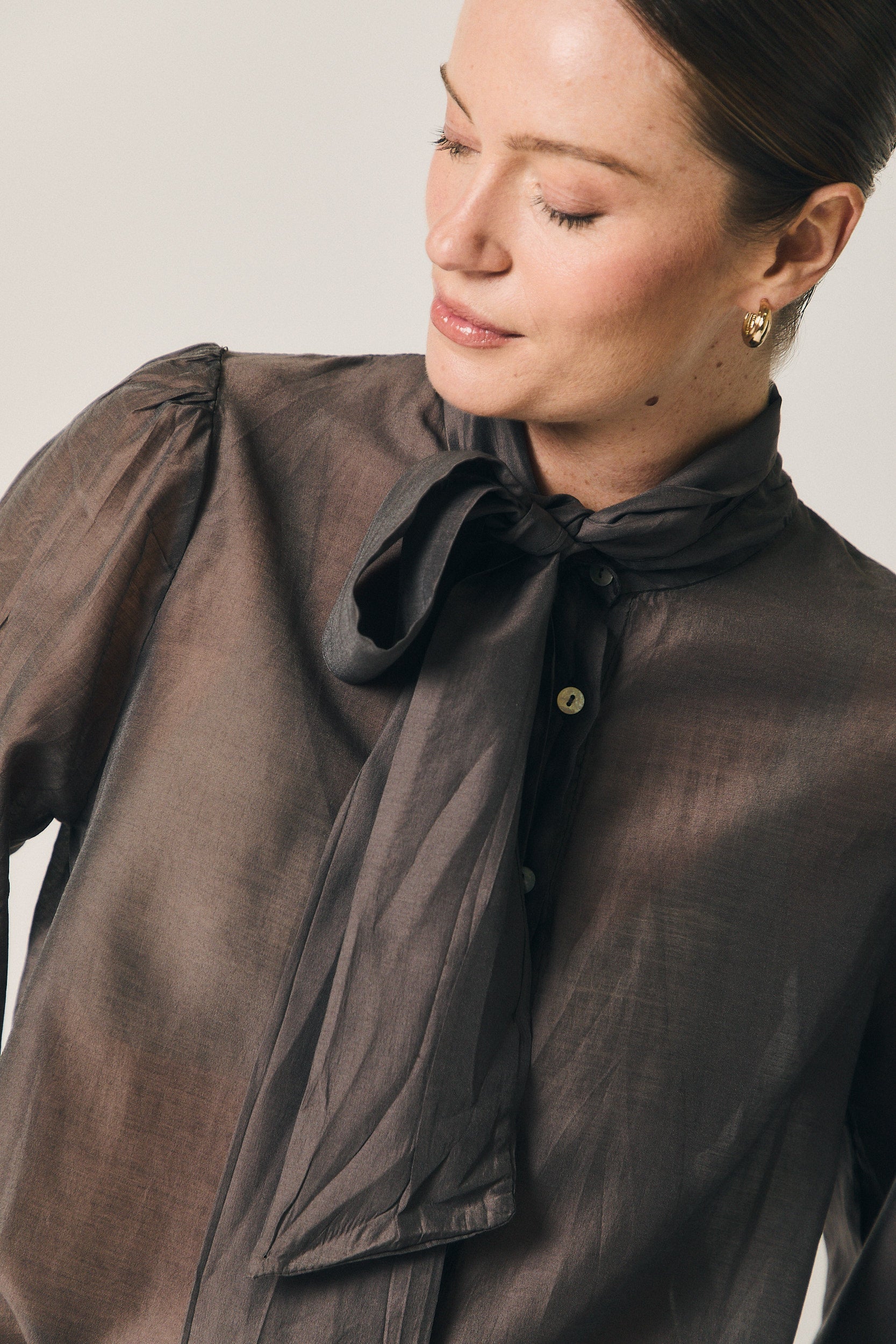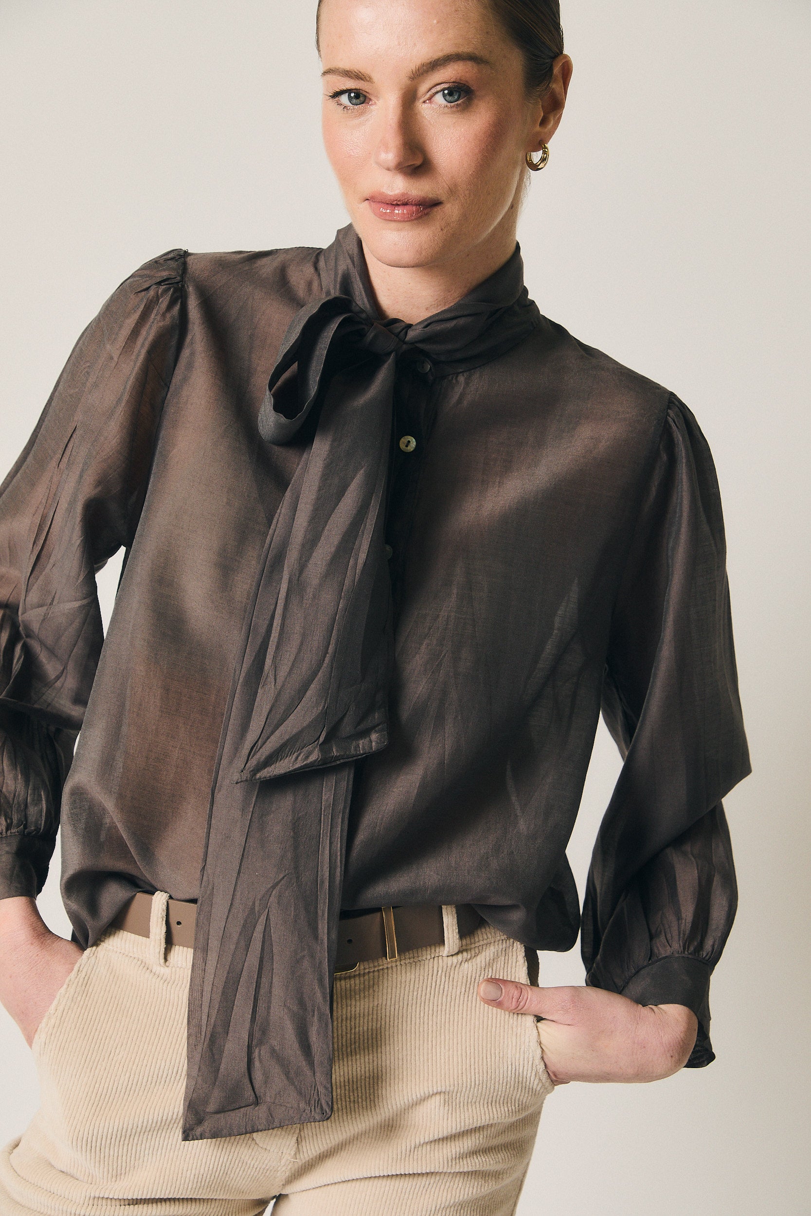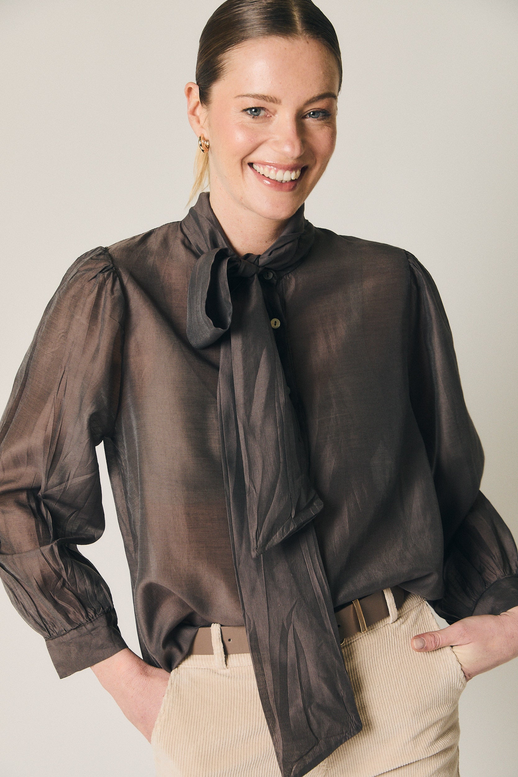 Blusa fina en tono marrón con lazo largo integrado al cuello, que permite llevarlo suelto o anudado. Diseño de corte recto, cierre frontal con botones y manga larga con ligero volumen en el hombro y puño. La caída suave y el acabado delicado aportan ligereza visual sin marcar la silueta.