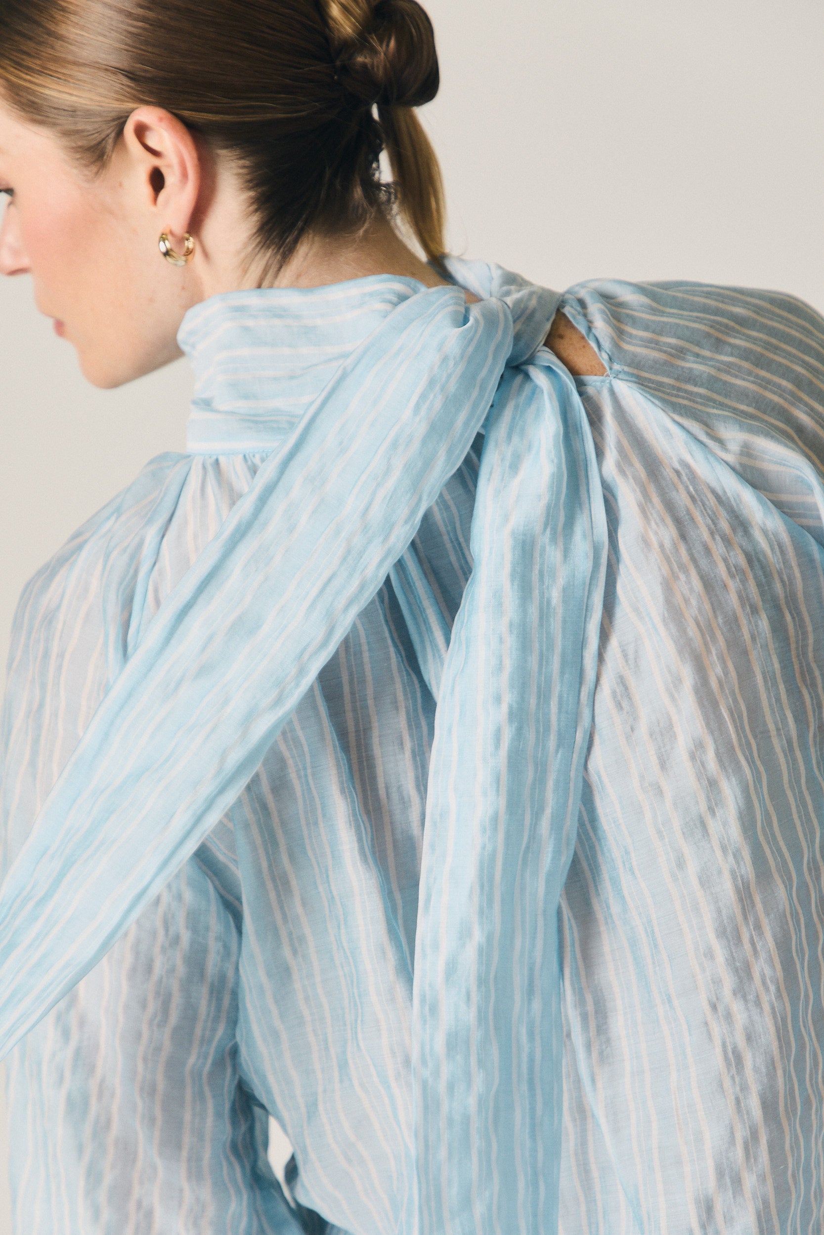 Blusa en tono celeste con estampado de rayas verticales y efecto ligeramente translúcido. Diseño de cuello cerrado con lazada larga integrada, que permite llevarla anudada o suelta según el estilo. Presenta manga larga con volumen suave y puño elástico, y un fruncido ligero en el escote que aporta movimiento y caída fluida.
