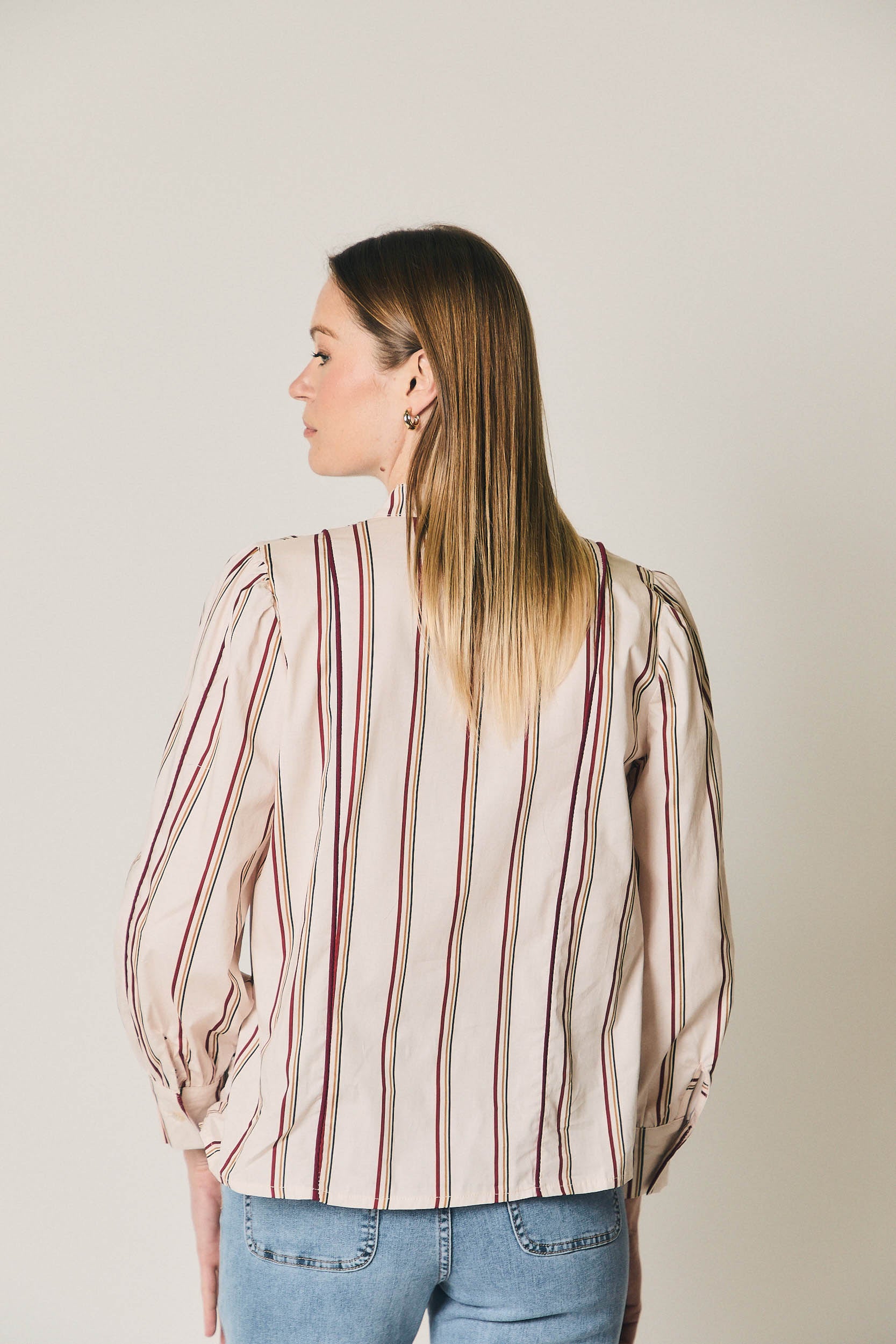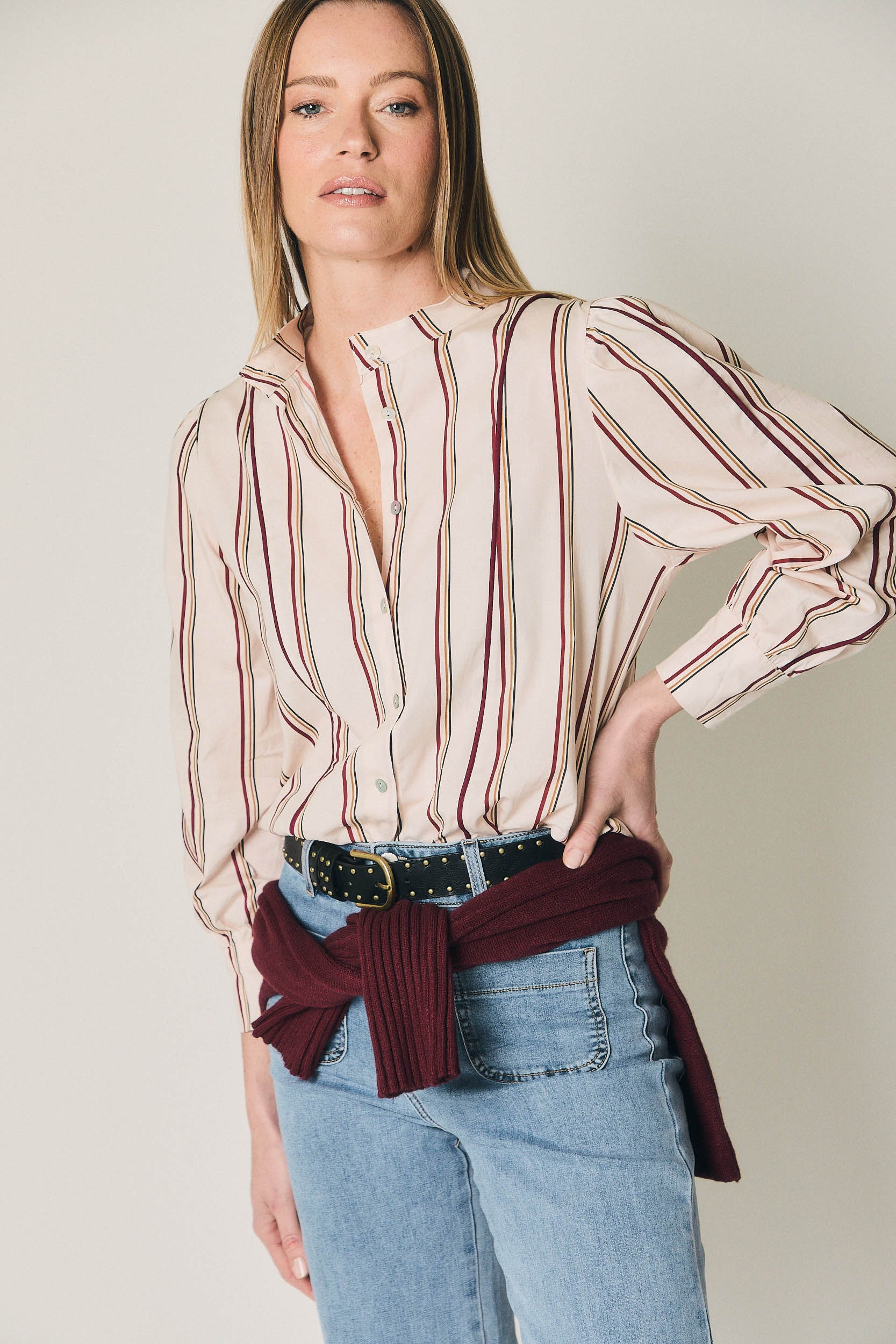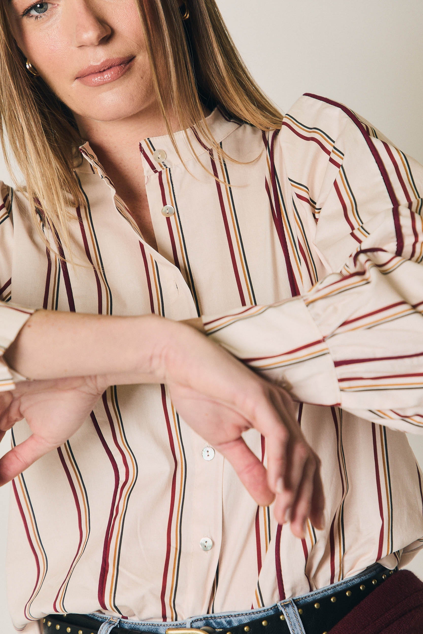 Camisa de fondo crudo con estampado de rayas verticales en tonos contrastados. Diseño de cuello mao con apertura frontal y cierre de botones, que aporta una línea limpia y actual. Presenta manga larga ligeramente abullonada con puño cerrado y hombro suavemente estructurado, manteniendo una silueta recta y cómoda.