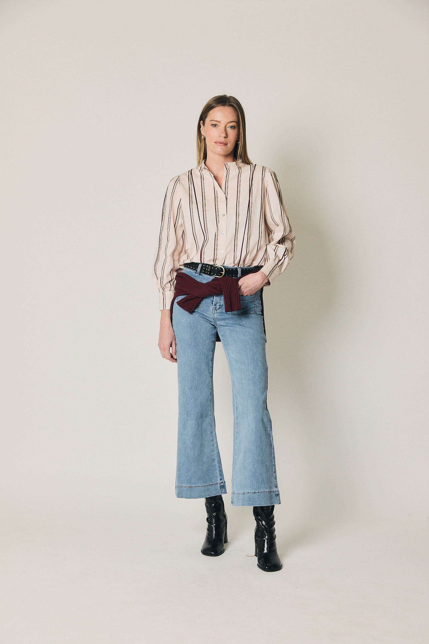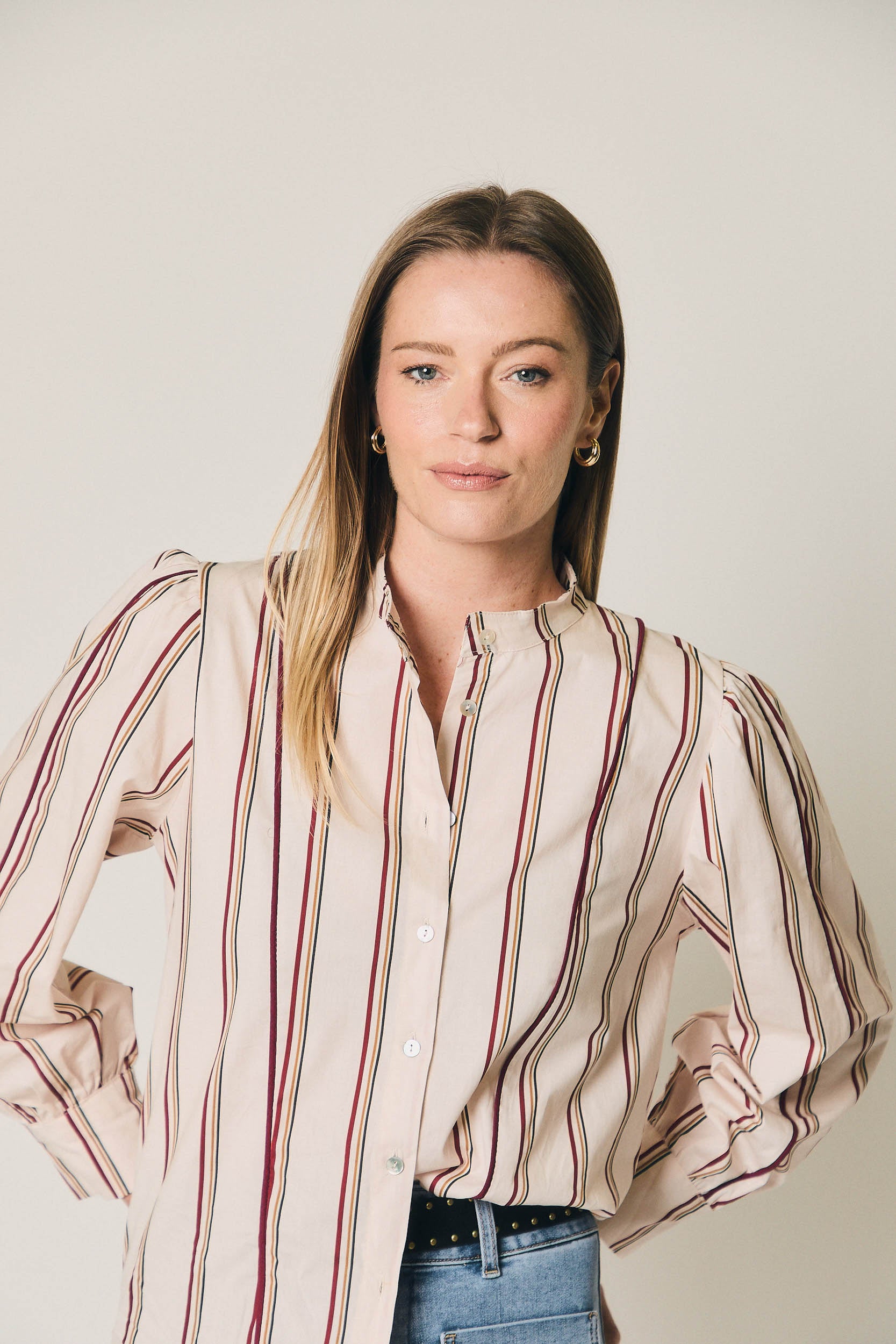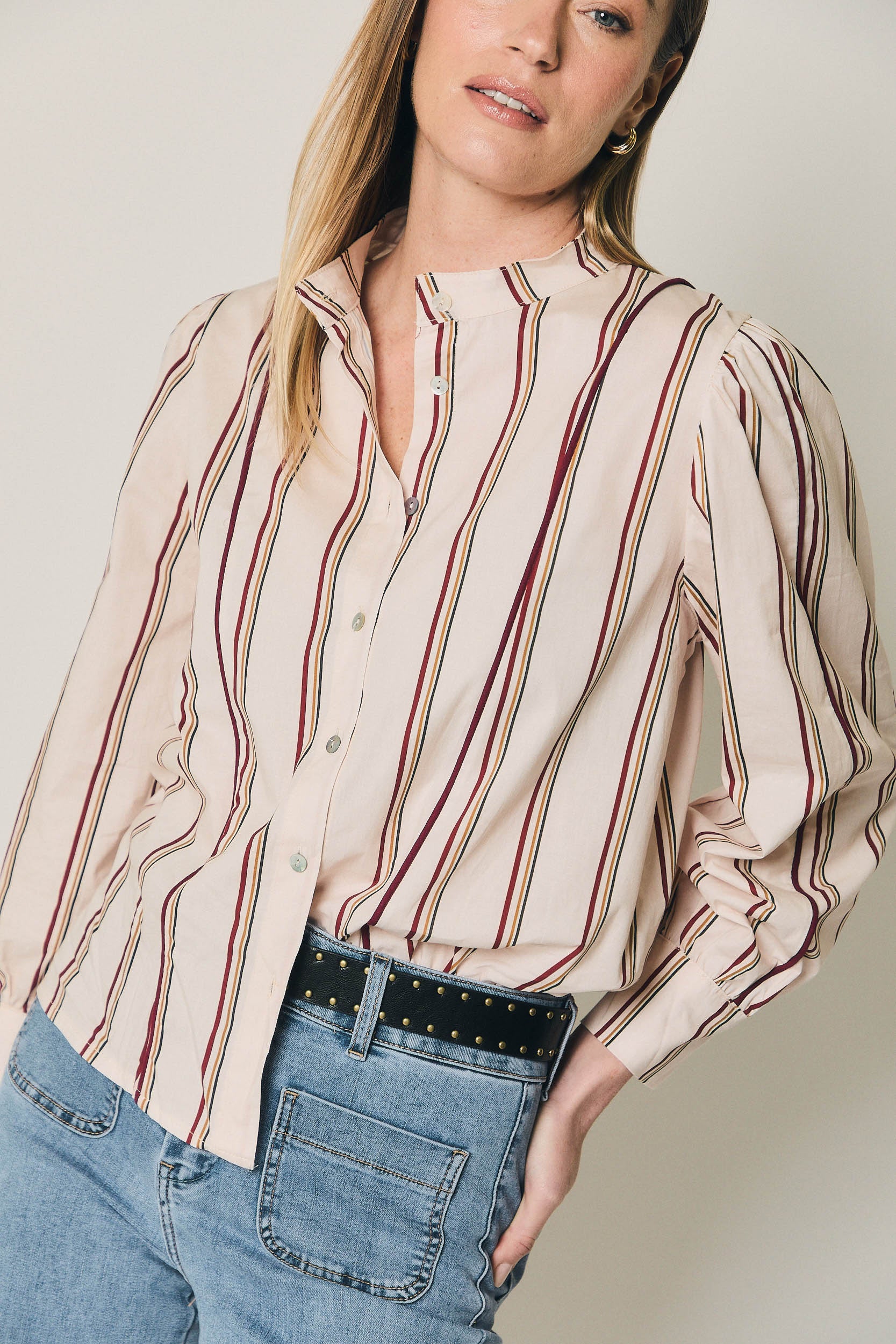 Camisa de fondo crudo con estampado de rayas verticales en tonos contrastados. Diseño de cuello mao con apertura frontal y cierre de botones, que aporta una línea limpia y actual. Presenta manga larga ligeramente abullonada con puño cerrado y hombro suavemente estructurado, manteniendo una silueta recta y cómoda.