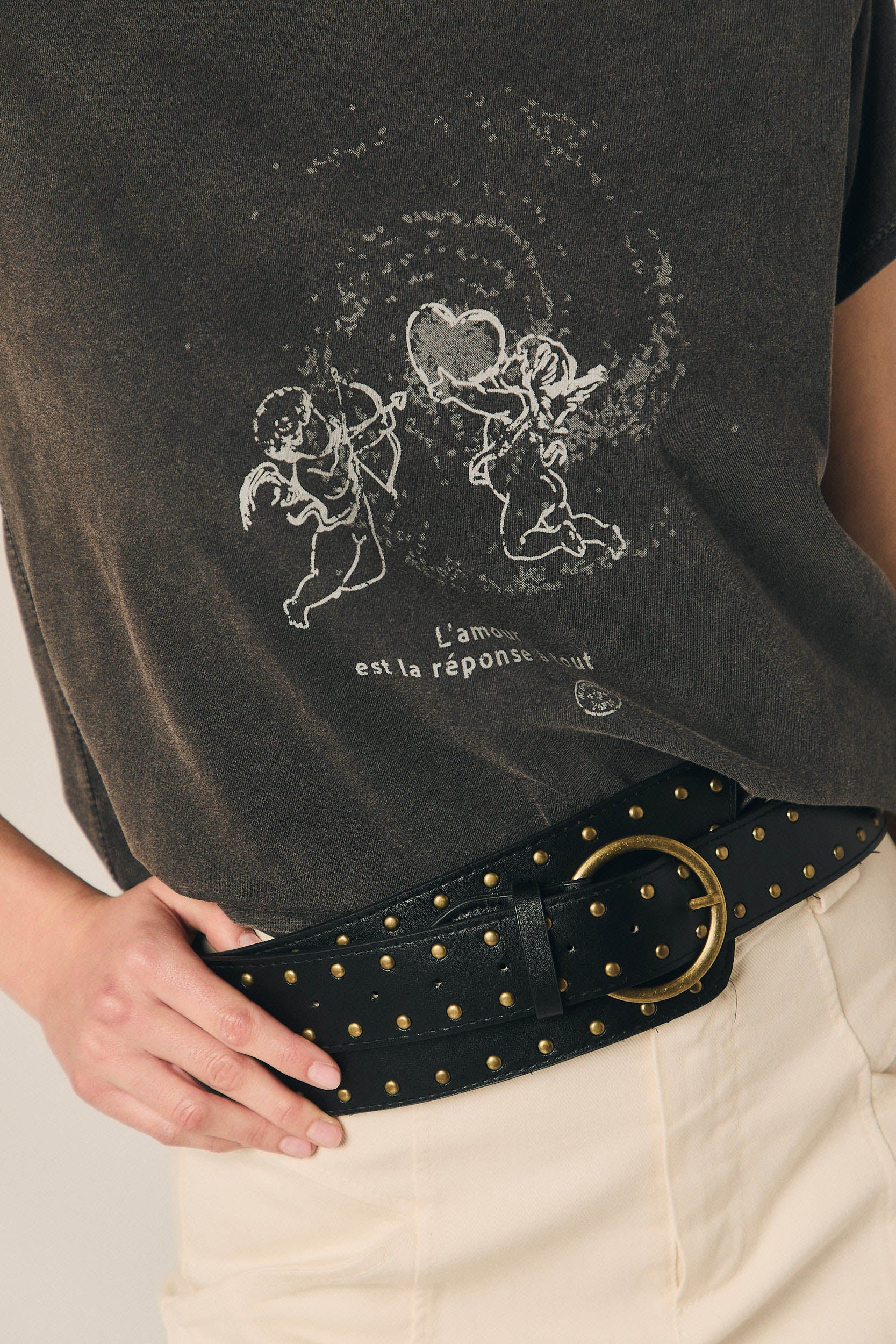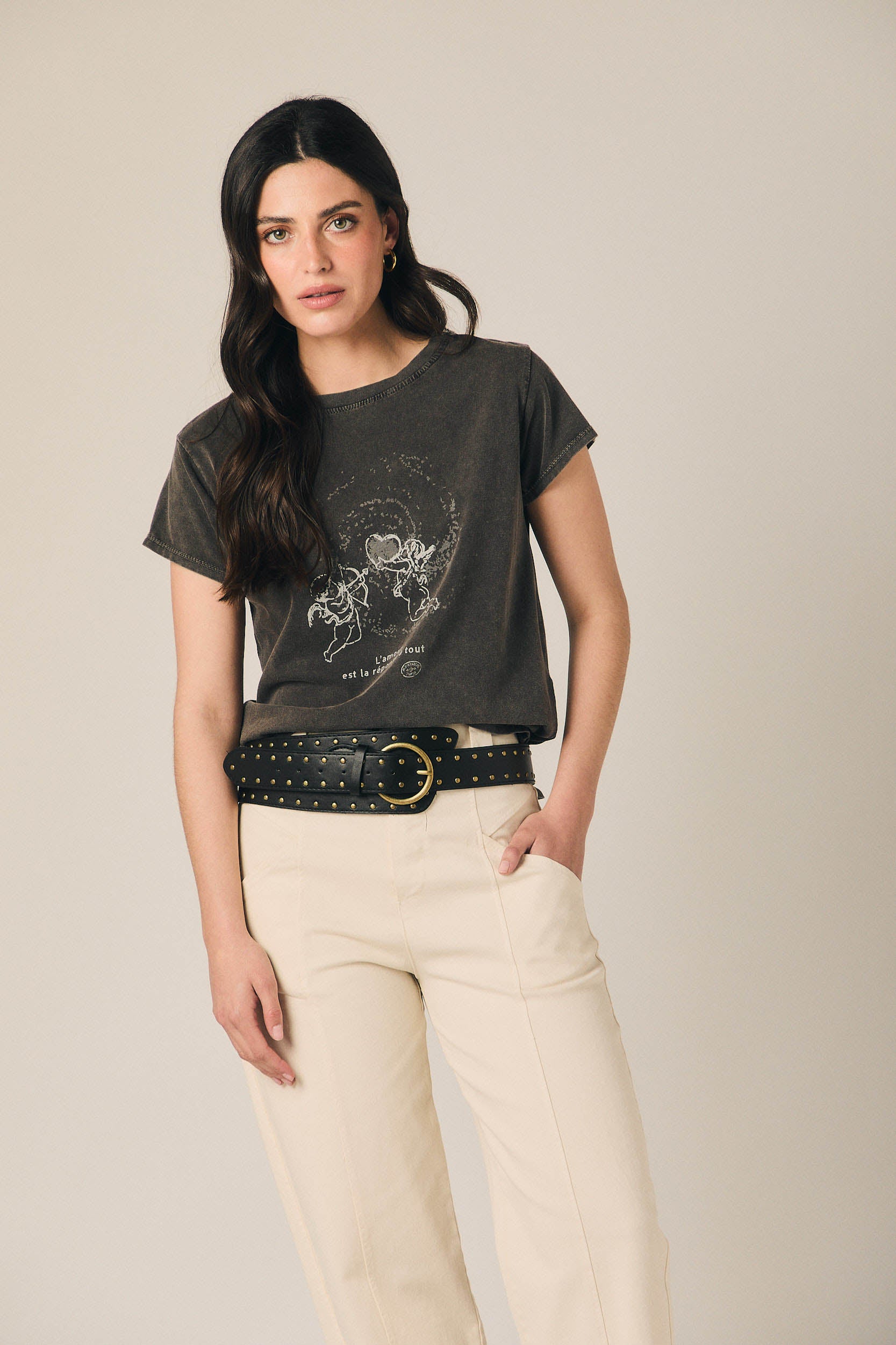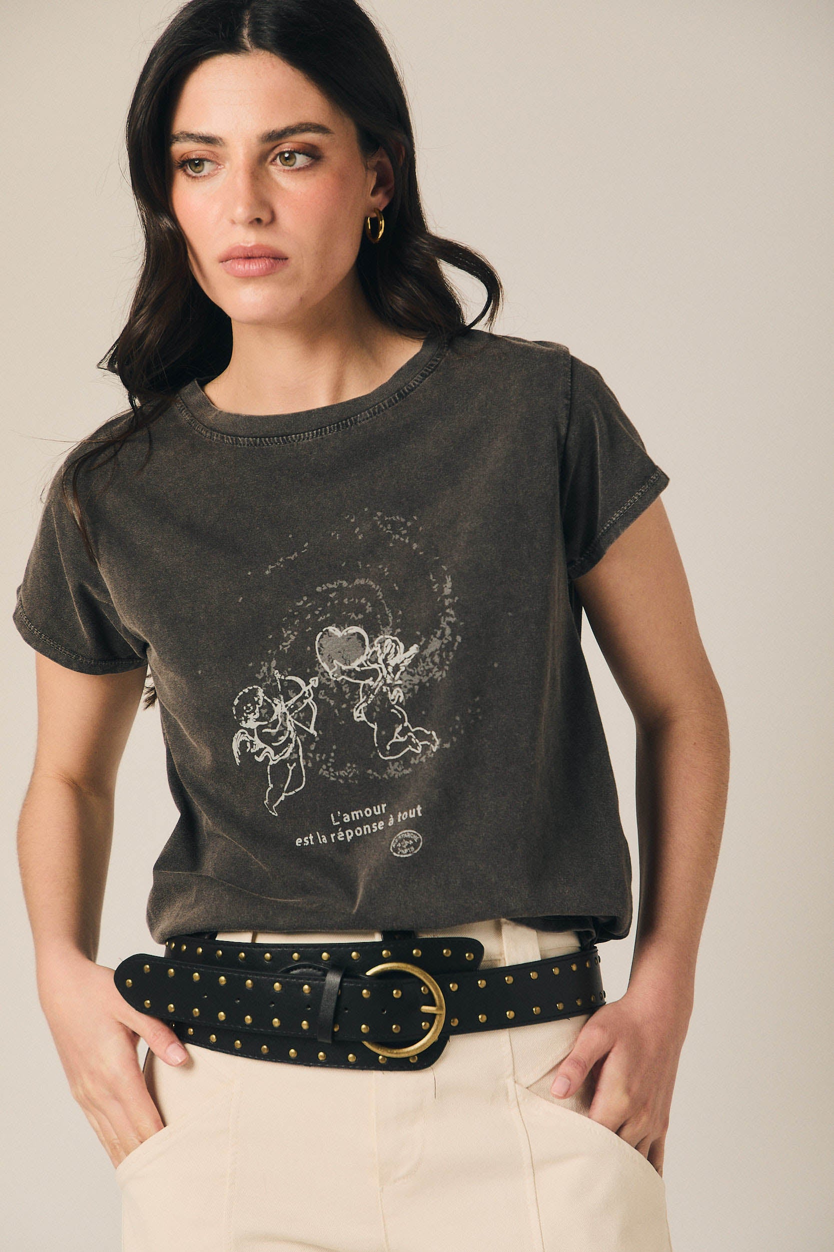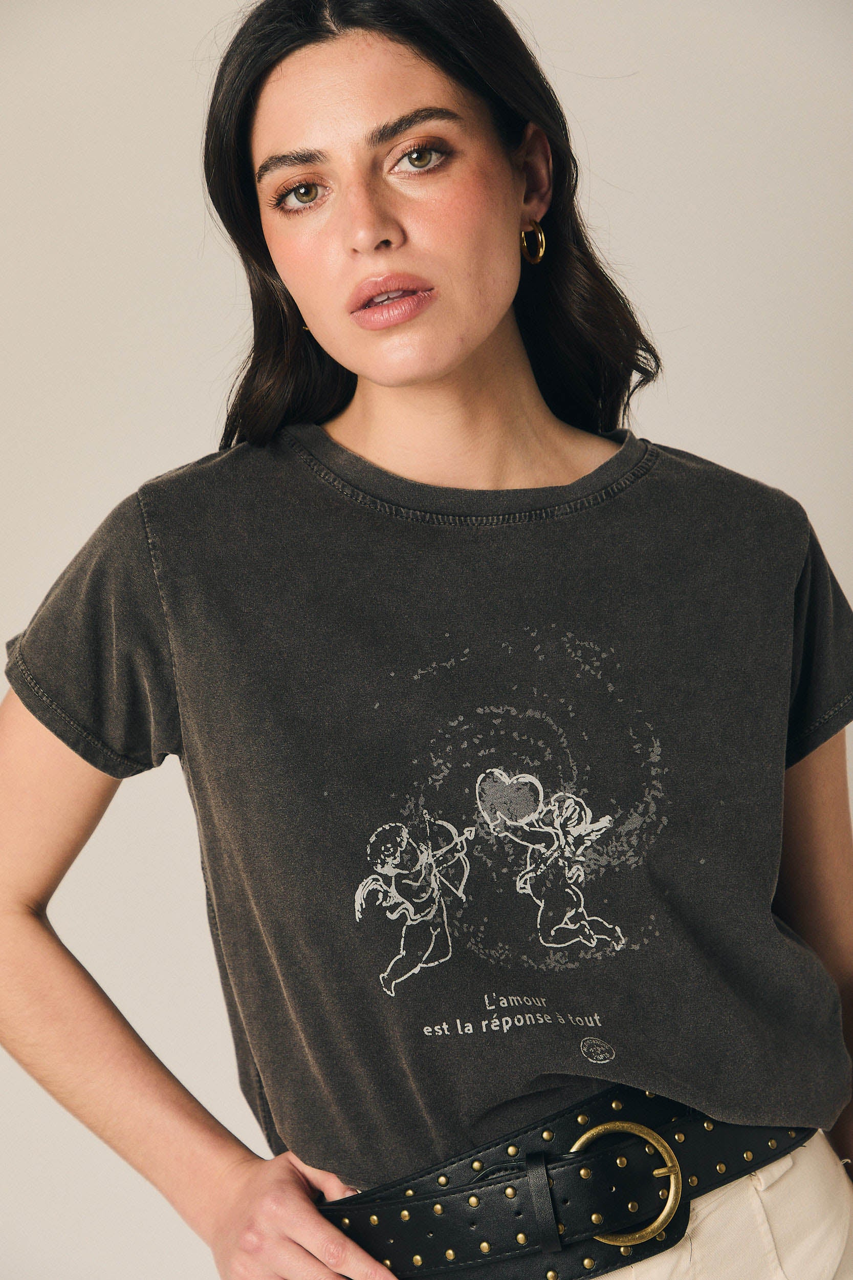 Camiseta de mujer en color gris efecto lavado con estampado frontal de ángeles y mensaje “L’amour est la réponse à tout”. Diseño de manga corta y cuello redondo, con corte recto y acabado ligeramente desgastado que aporta un aire vintage.