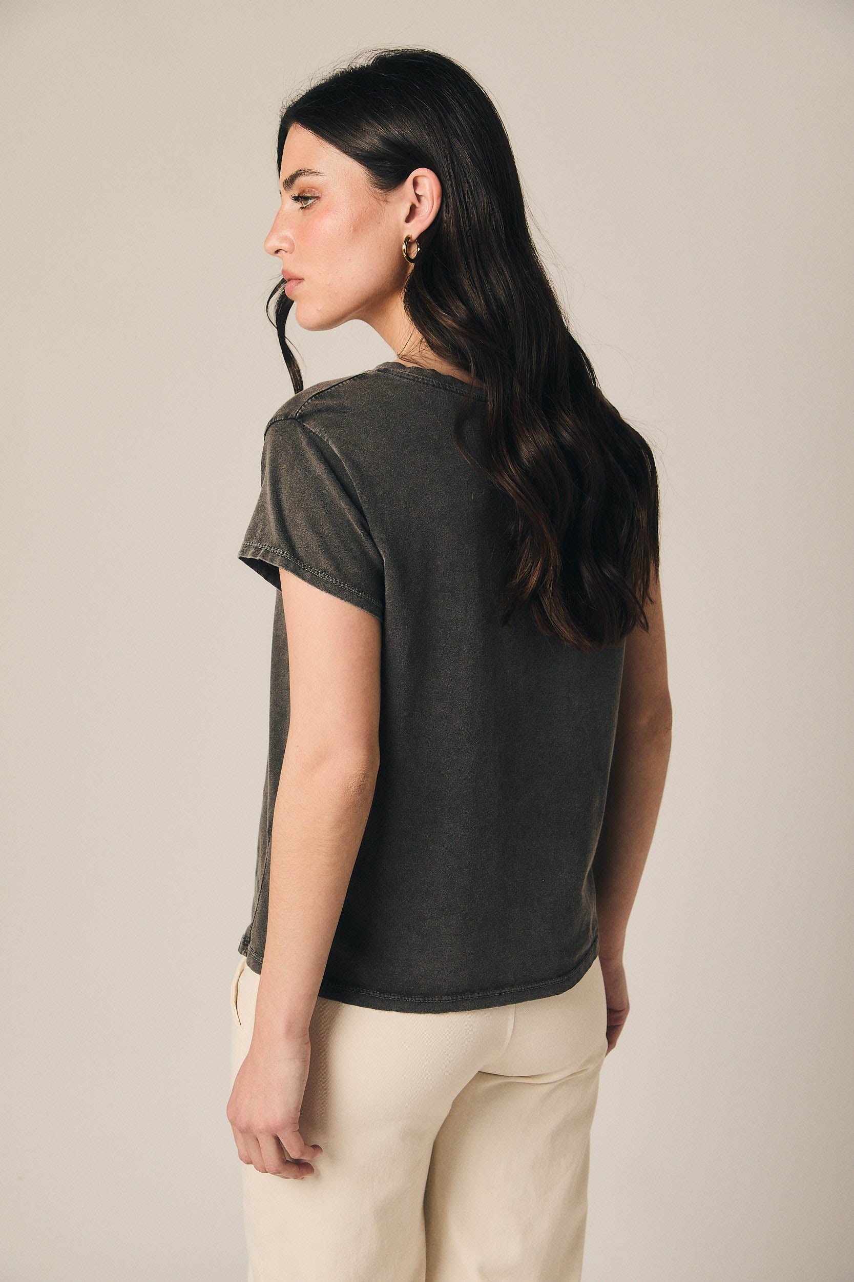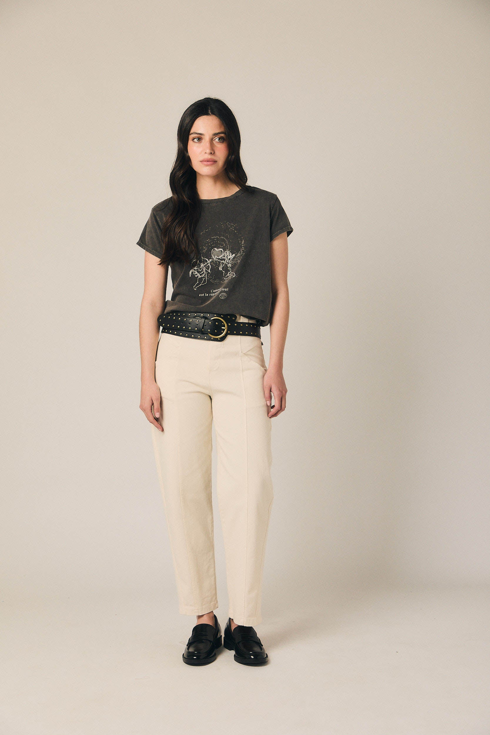 Perfecta para combinar con jeans rectos, pantalones wide leg o faldas midi. Llévala bajo una americana o con chaqueta vaquera para un look casual con personalidad. Una camiseta estampada que suma carácter a tus básicos de diario.