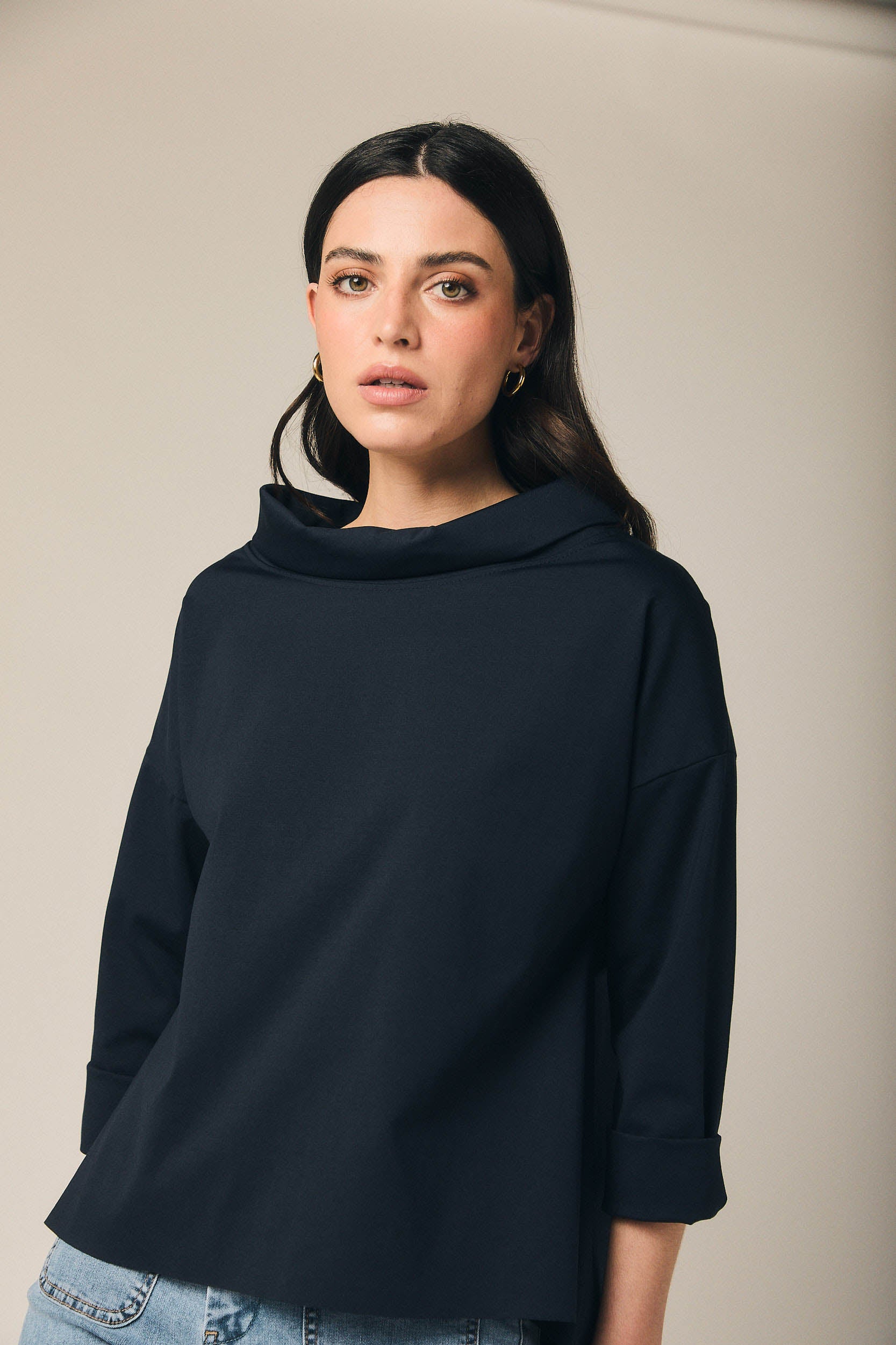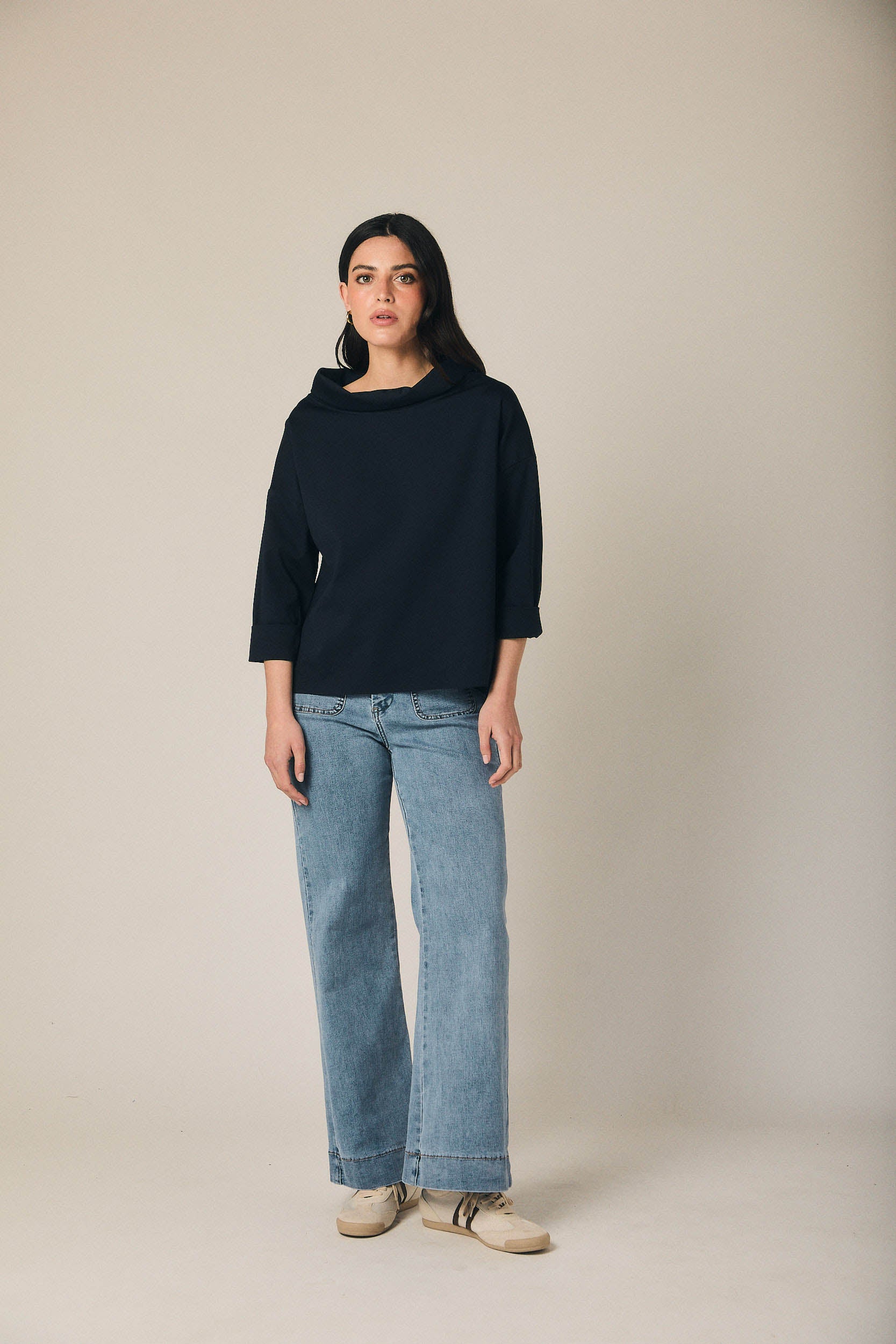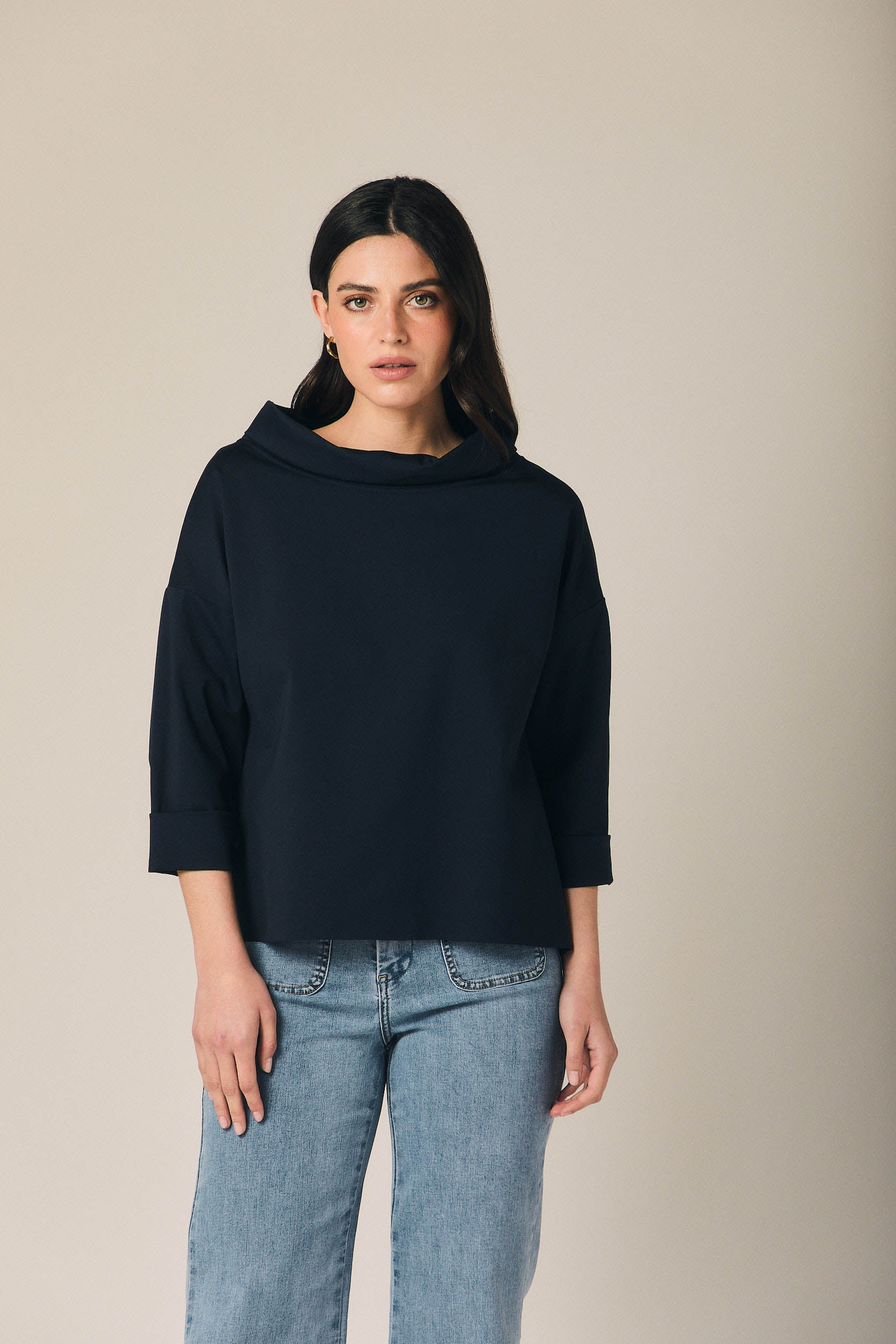 Camiseta de tejido fluido en tono azul marino, con cuello amplio tipo drapeado que aporta suavidad y un acabado elegante al diseño. Presenta manga tres cuartos con vuelta y un bajo ligeramente asimétrico, creando una silueta relajada y favorecedora. Corte amplio y caída ligera, pensada para aportar comodidad sin perder estilo.