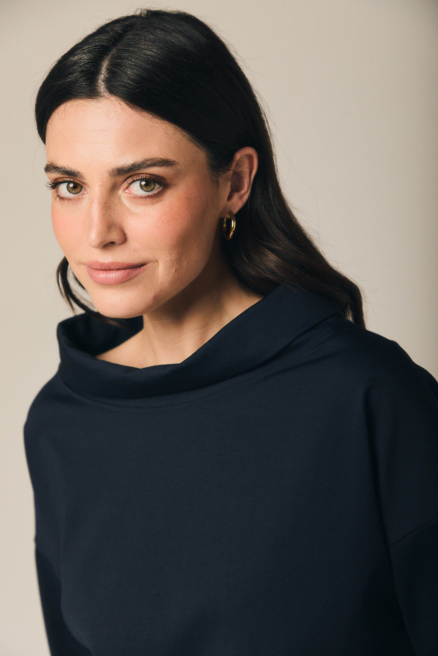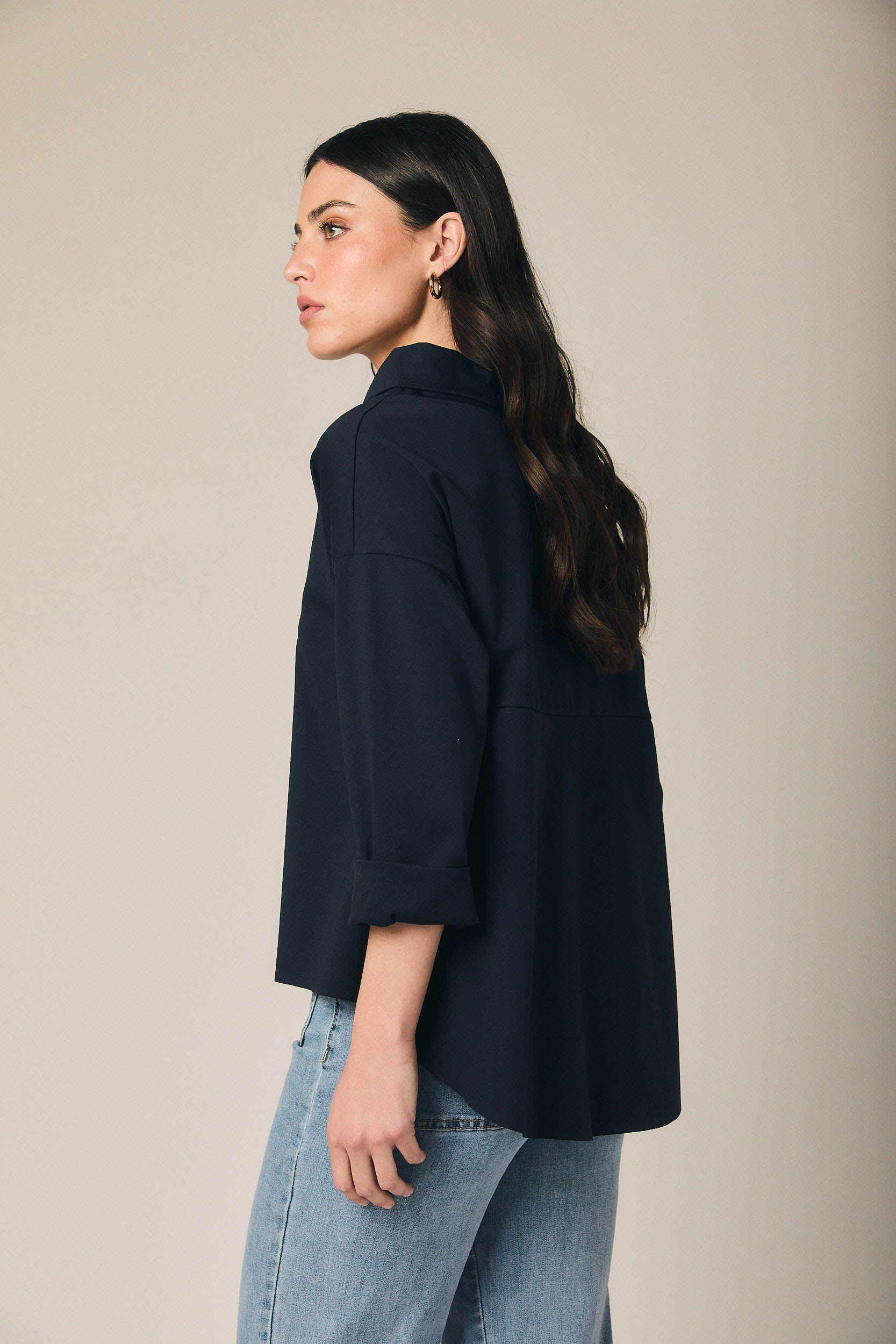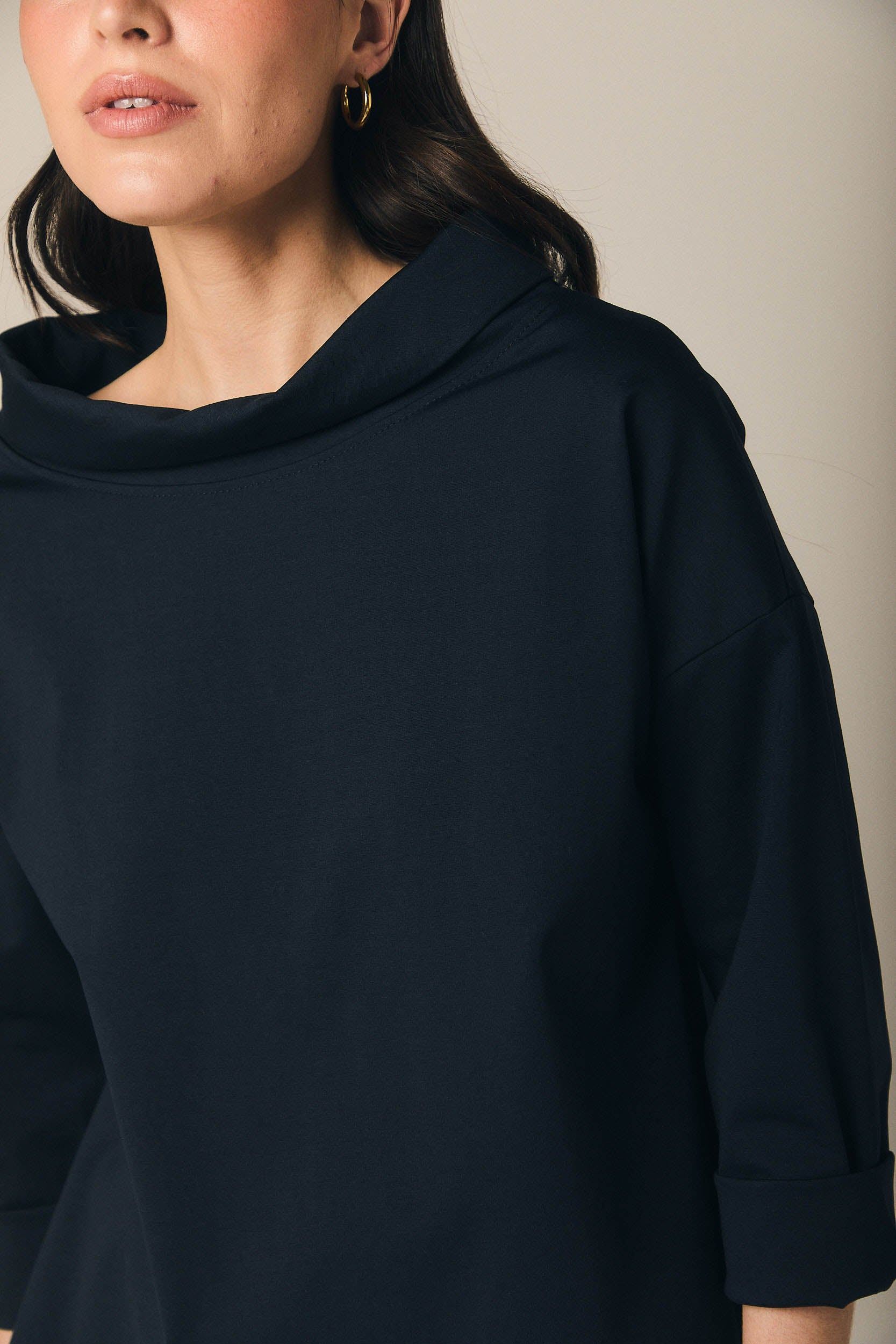Camiseta de tejido fluido en tono azul marino, con cuello amplio tipo drapeado que aporta suavidad y un acabado elegante al diseño. Presenta manga tres cuartos con vuelta y un bajo ligeramente asimétrico, creando una silueta relajada y favorecedora. Corte amplio y caída ligera, pensada para aportar comodidad sin perder estilo.