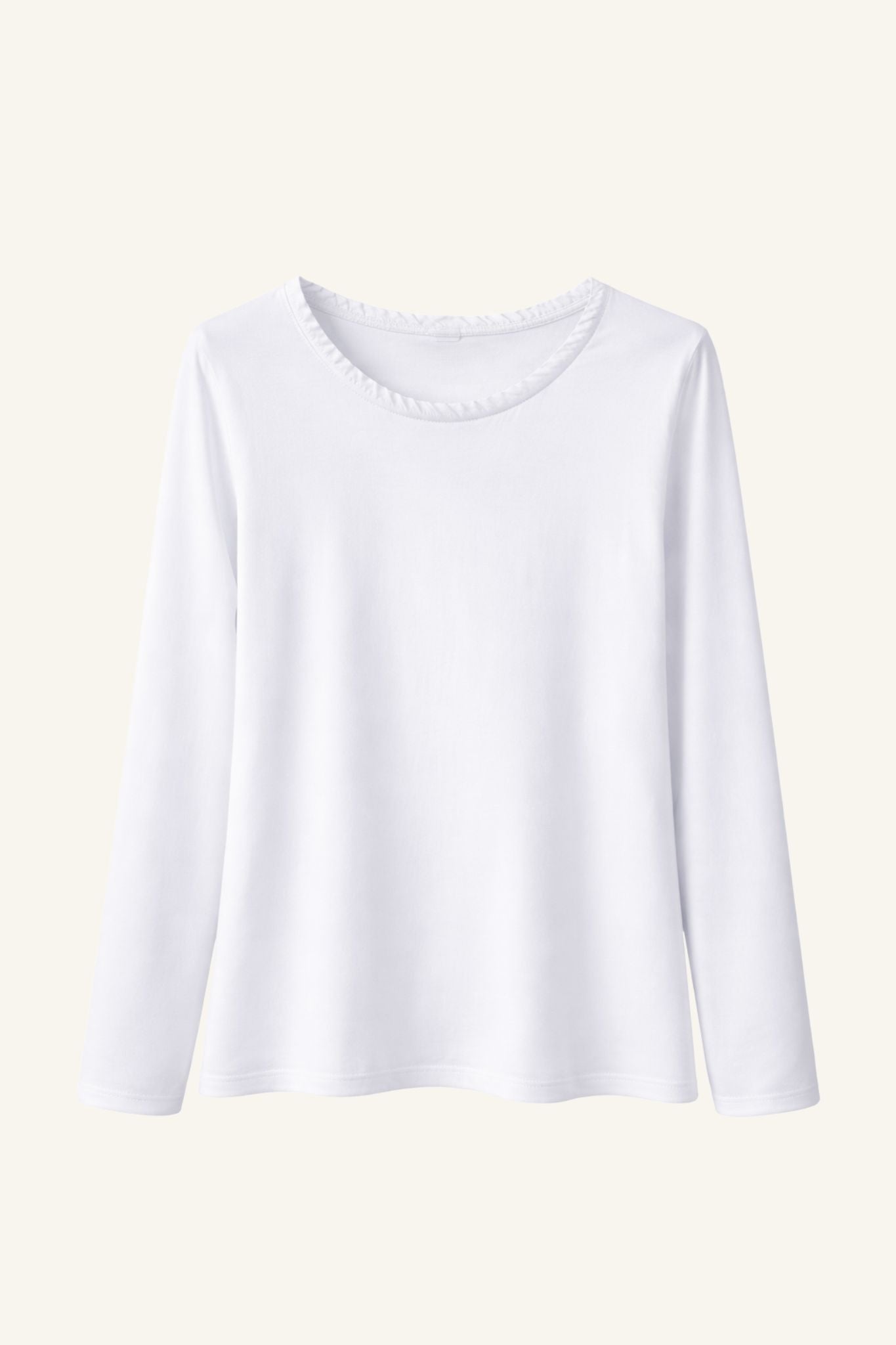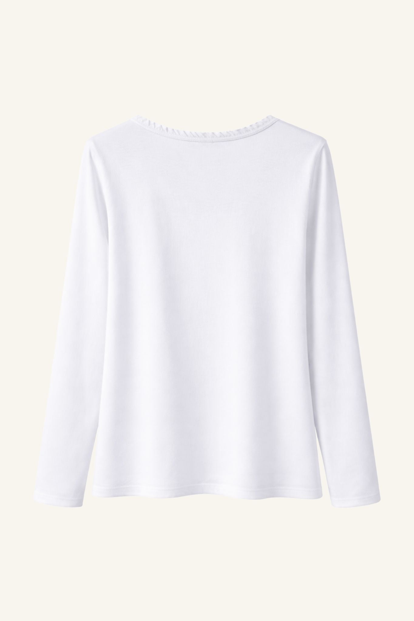 Camiseta básica de mujer en color blanco con detalle de rizo en el cuello redondo. Corte recto y ligeramente entallado, con manga larga y acabado limpio en bajo y puños. Un diseño sencillo con un toque especial en el escote que aporta textura y diferencia.