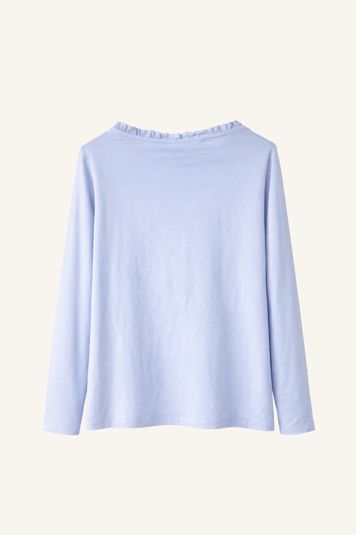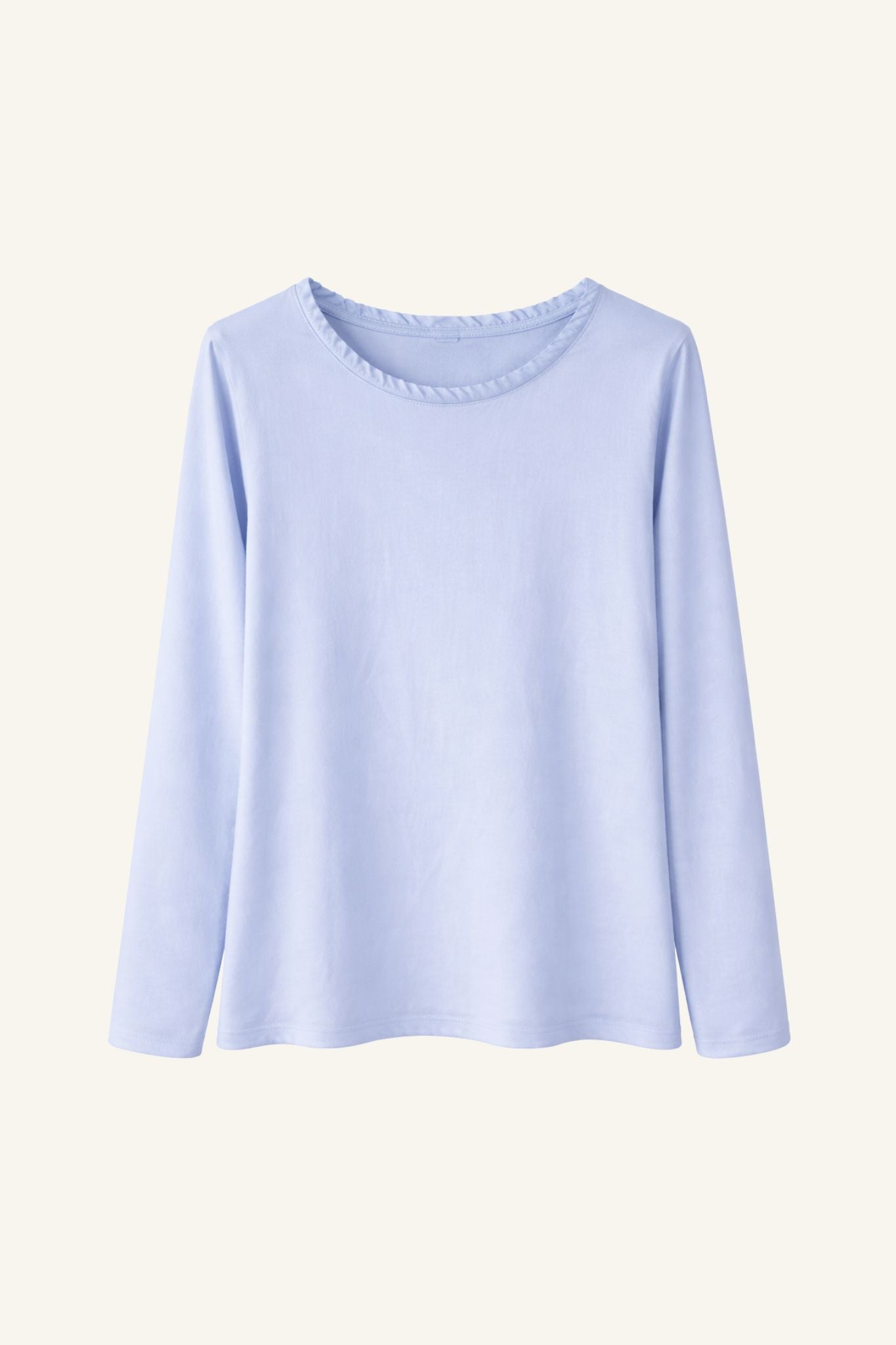 Camiseta básica de mujer en color celeste con detalle de rizo en el cuello redondo. Corte recto y ligeramente entallado, con manga larga y acabado limpio en bajo y puños. Un diseño sencillo con un toque especial en el escote que aporta textura y diferencia.