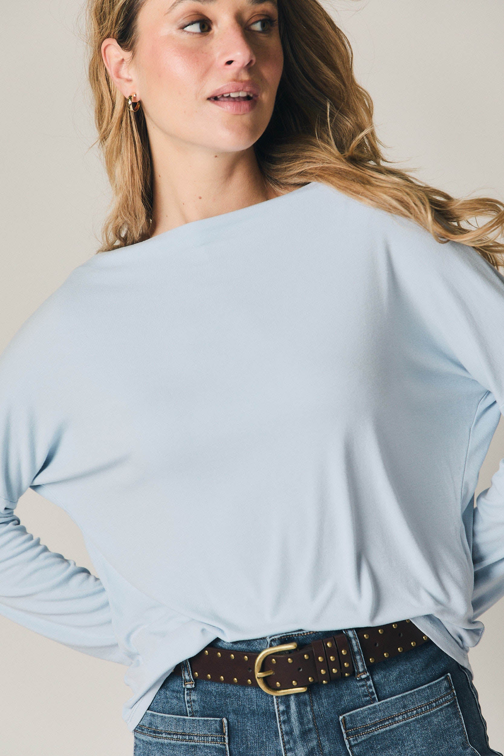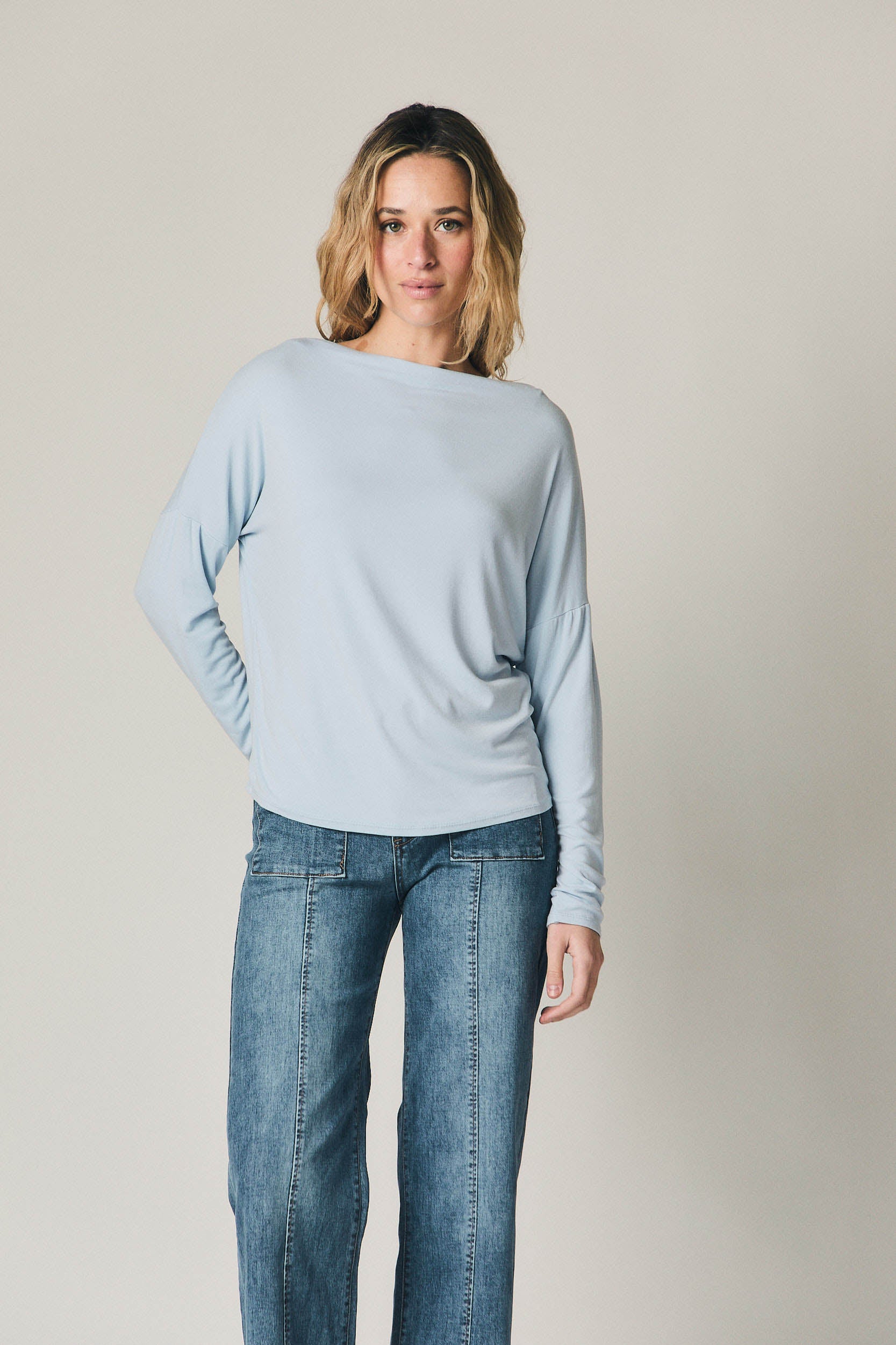 Camiseta fluida en color celeste. Corte recto y holgado, con cuello barco ligeramente abierto y manga larga caída. El tejido acompaña el movimiento y crea un drapeado natural, aportando una silueta relajada y ligera. Bajo recto y acabados limpios que refuerzan su estética sencilla.