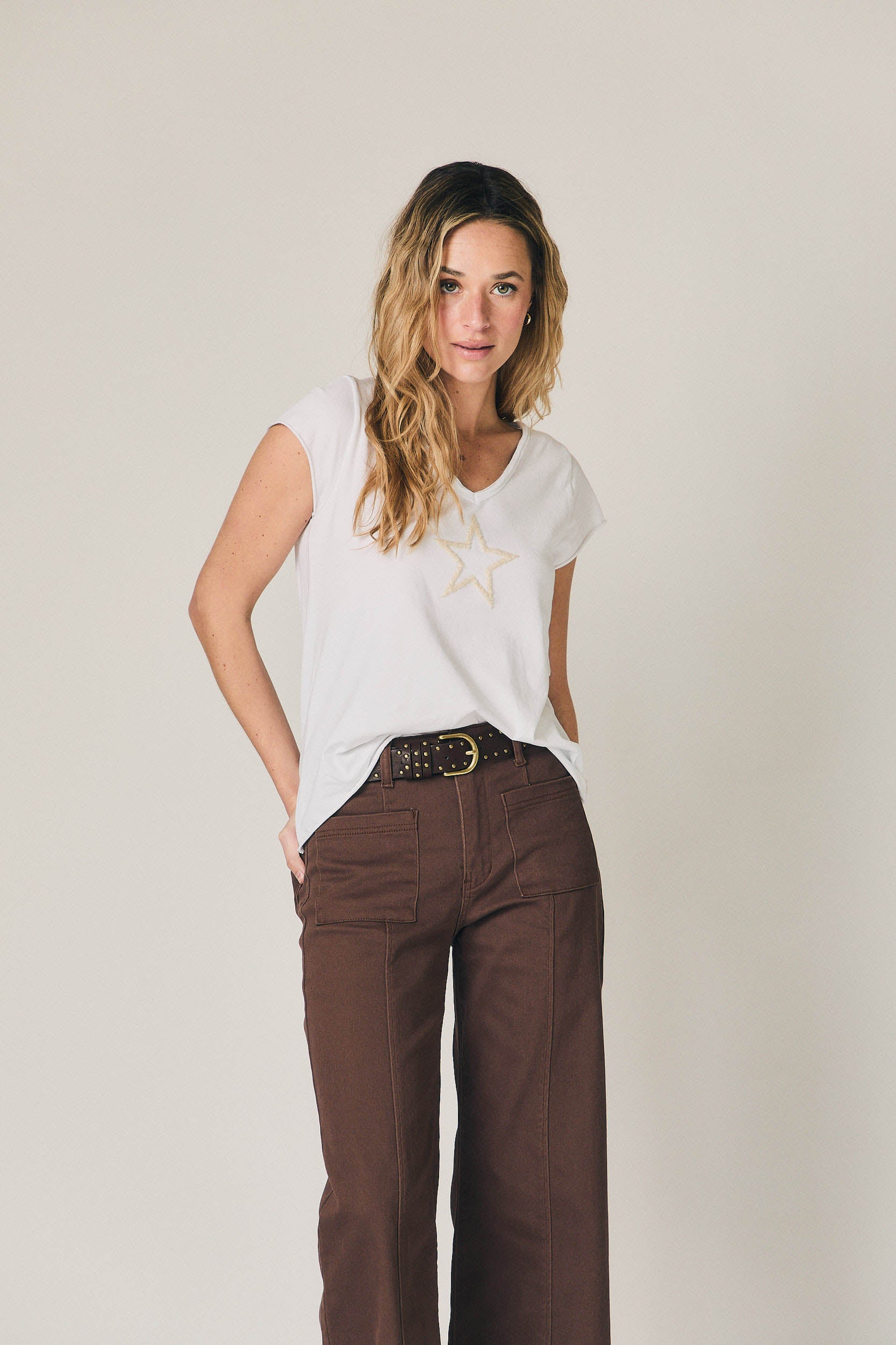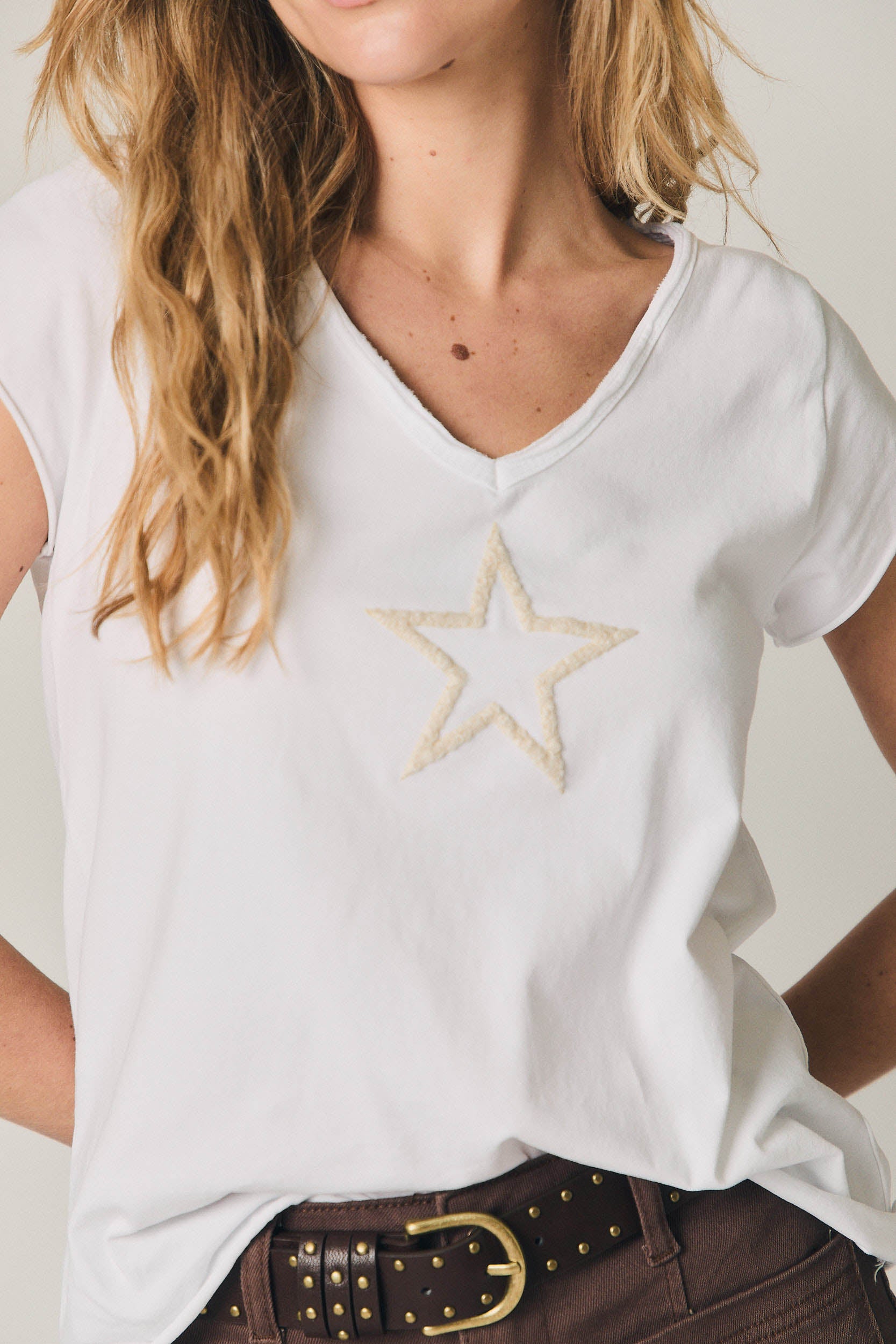 Camiseta en color gris antracita con estrella en contraste en el delantero. Silueta recta y ligeramente entallada, con escote pico y manga corta. Diseño limpio y actual, con acabados sencillos que mantienen la caída natural de la prenda.