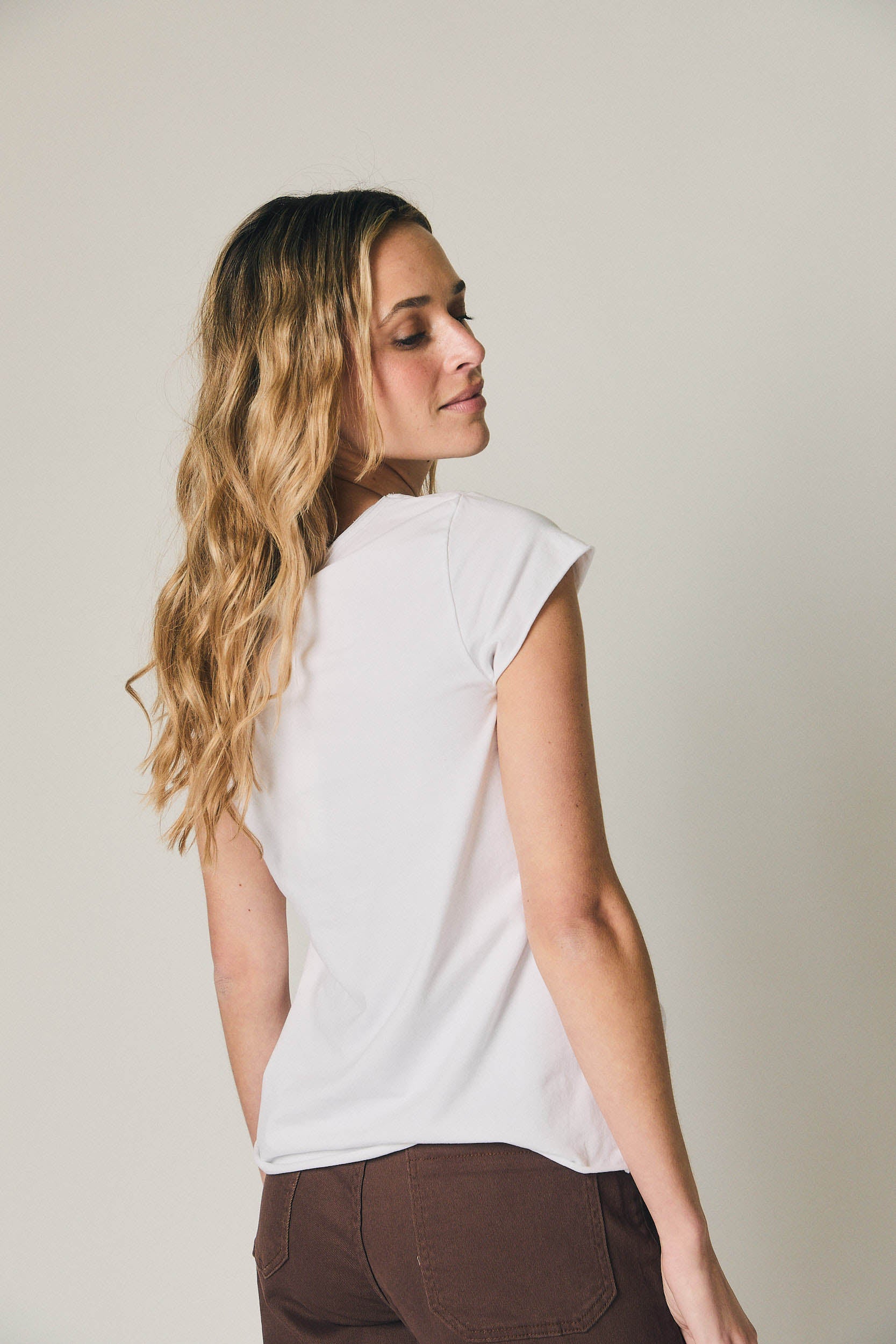Una camiseta pensada para el día a día, fácil de combinar con jeans, pantalones rectos o faldas midi. Funciona tanto en looks informales como bajo blazers o chaquetas ligeras, aportando un punto gráfico sin sobrecargar el conjunto.