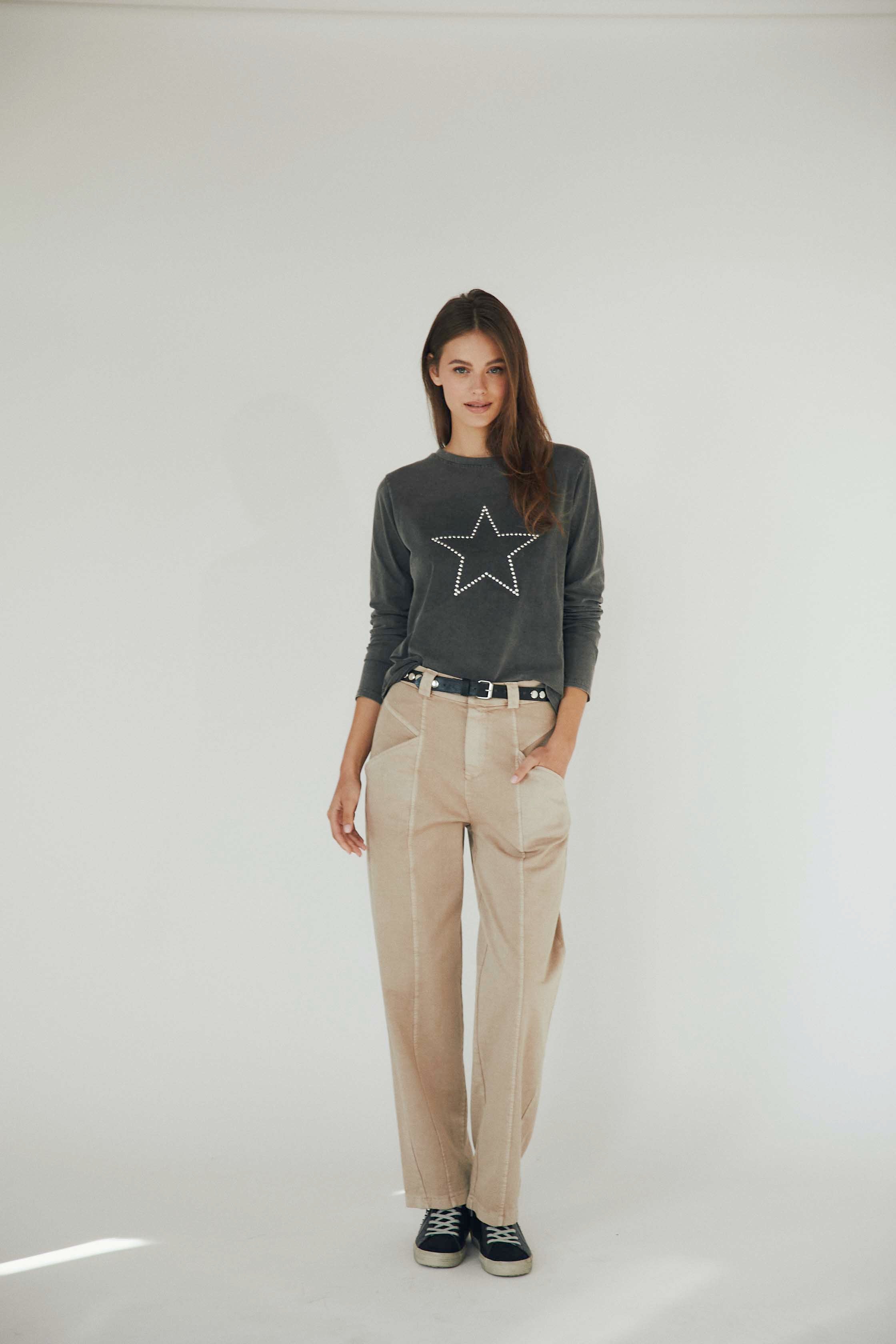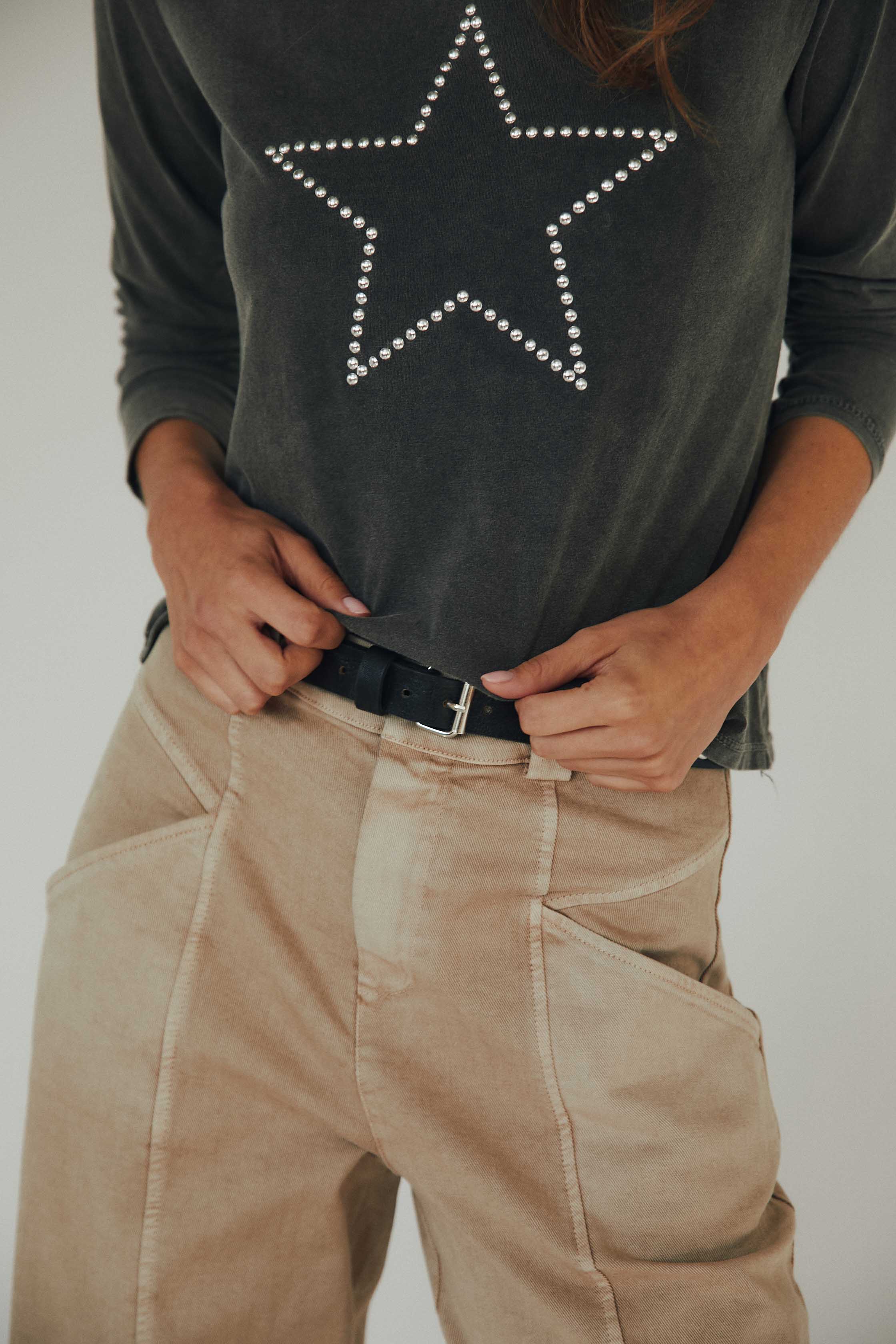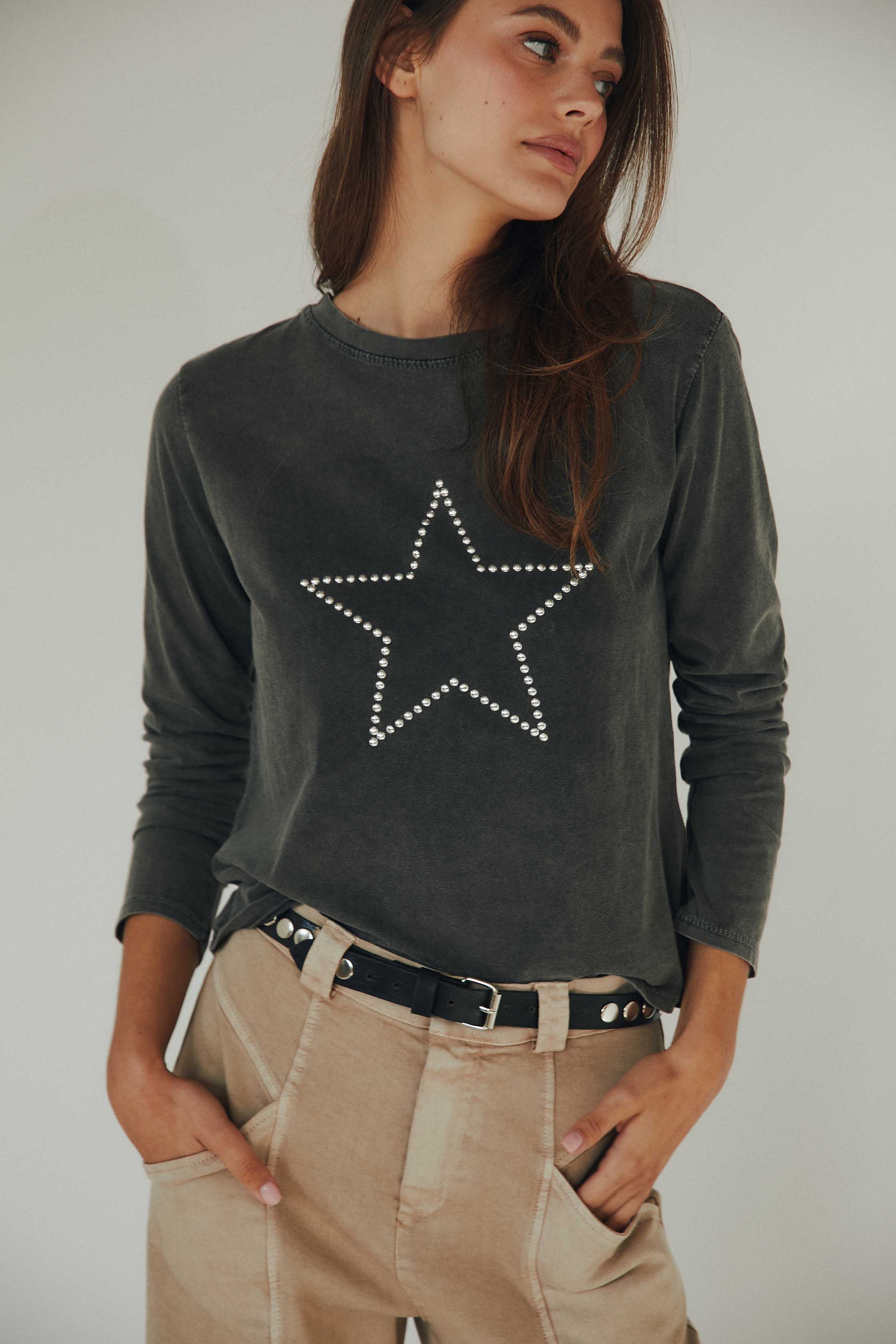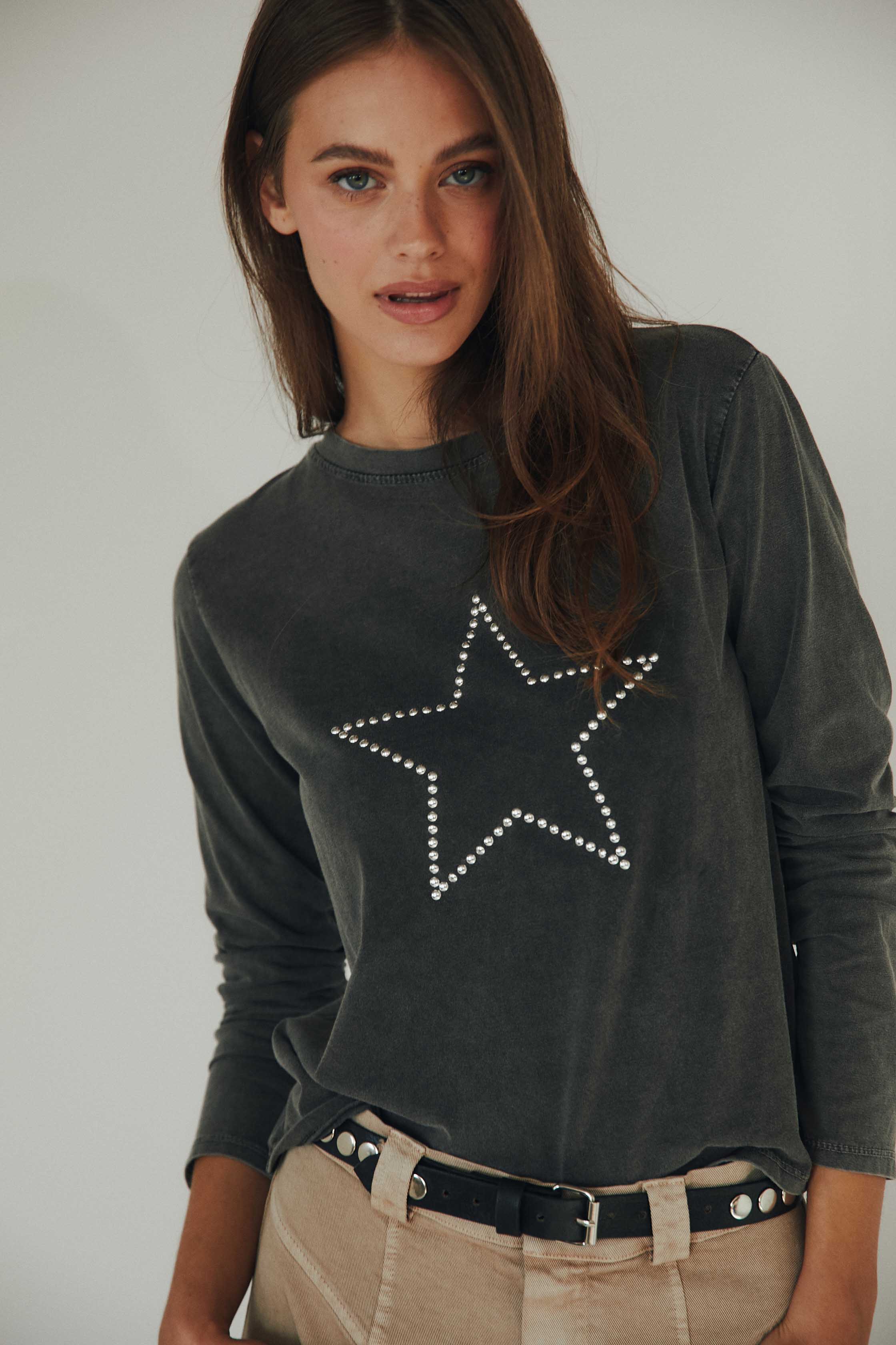 Camiseta de manga larga en tono natural con diseño de estrella formada por pequeñas tachuelas metálicas en la parte delantera. Corte recto, cuello redondo y tejido suave de tacto agradable que aporta comodidad y un acabado limpio.