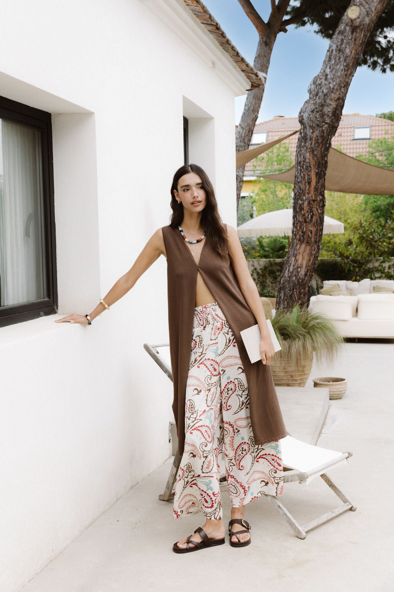 Chaleco largo de punto en tono marrón chocolate. Diseño abierto sin cierre, con escote amplio y silueta recta que cae hasta media pierna. Presenta corte limpio y minimalista, sin mangas y con caída fluida que aporta movimiento al conjunto.