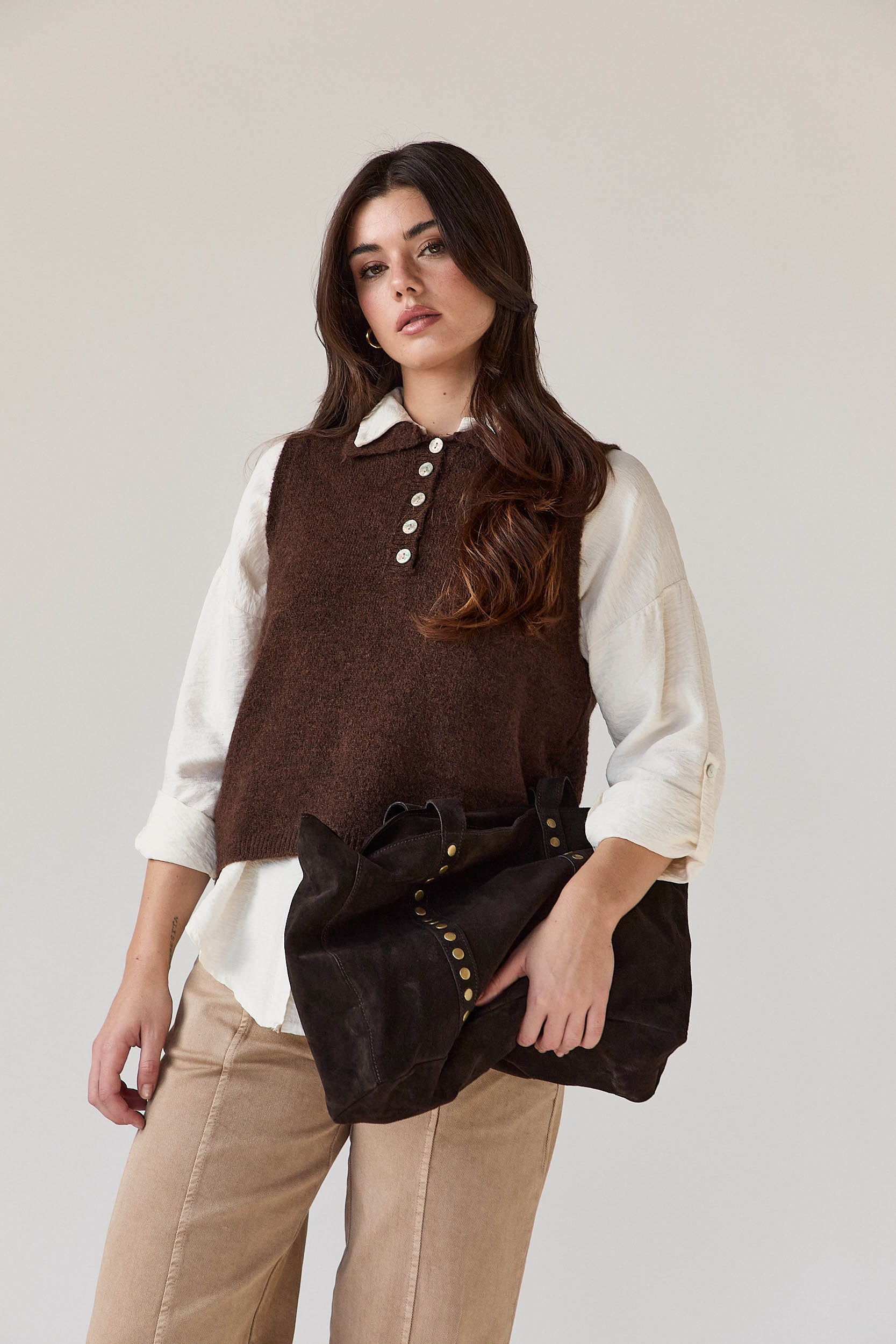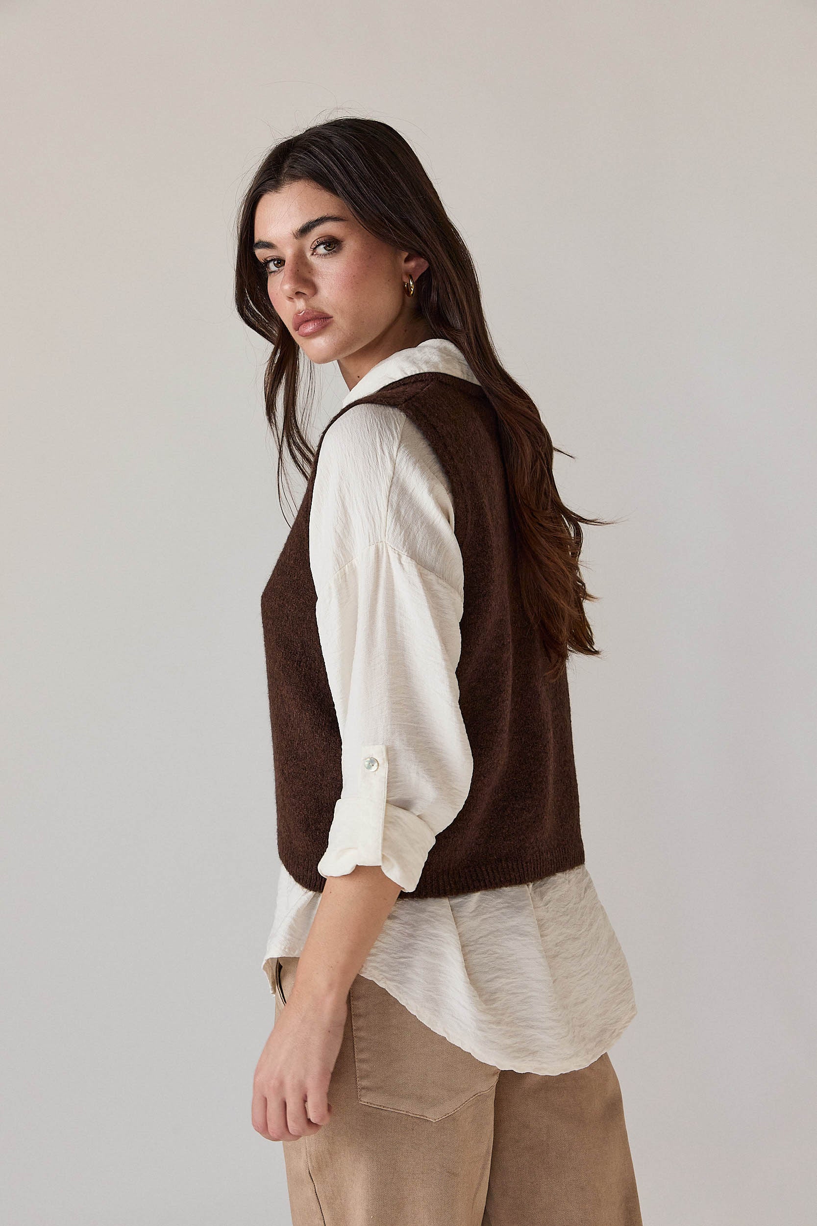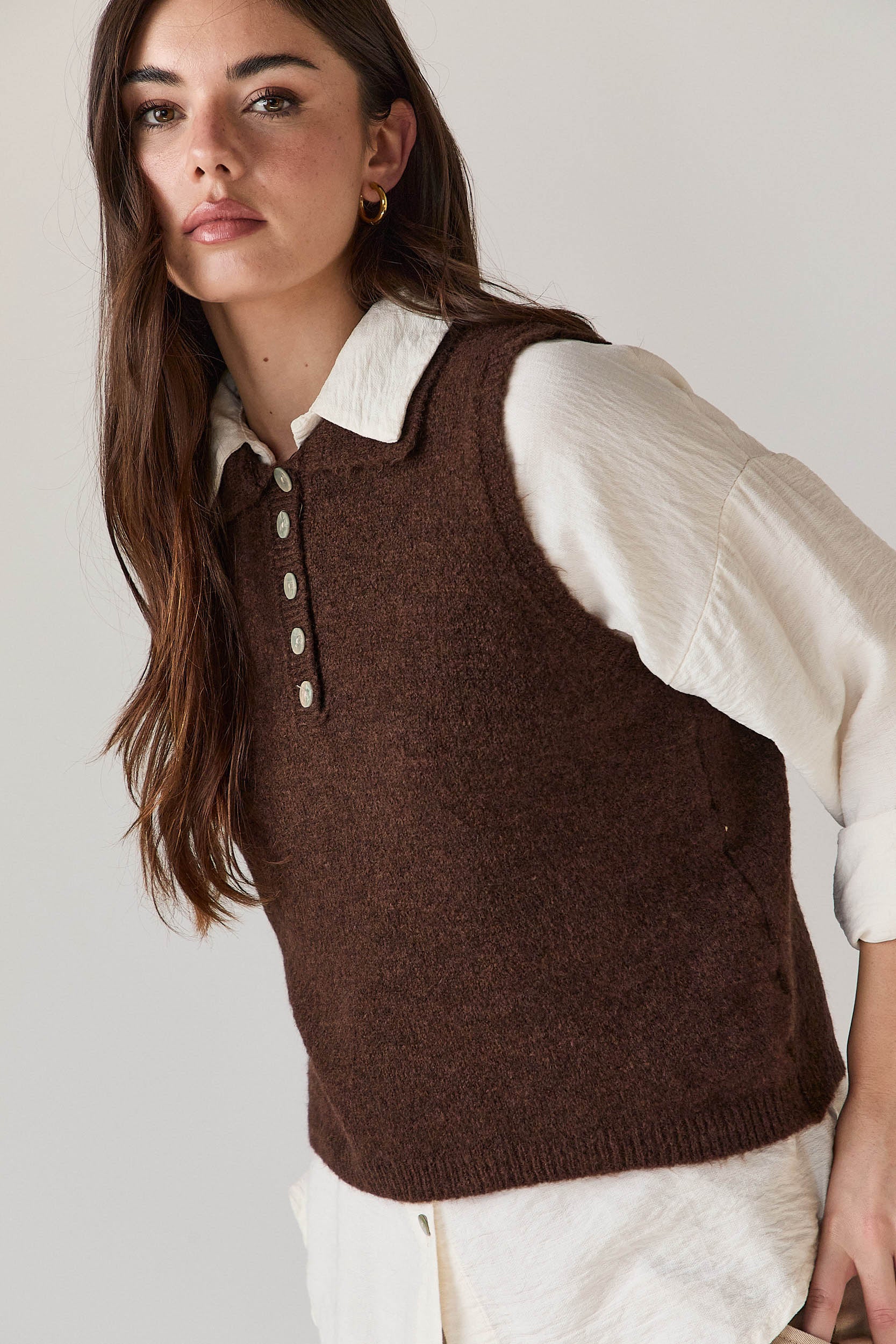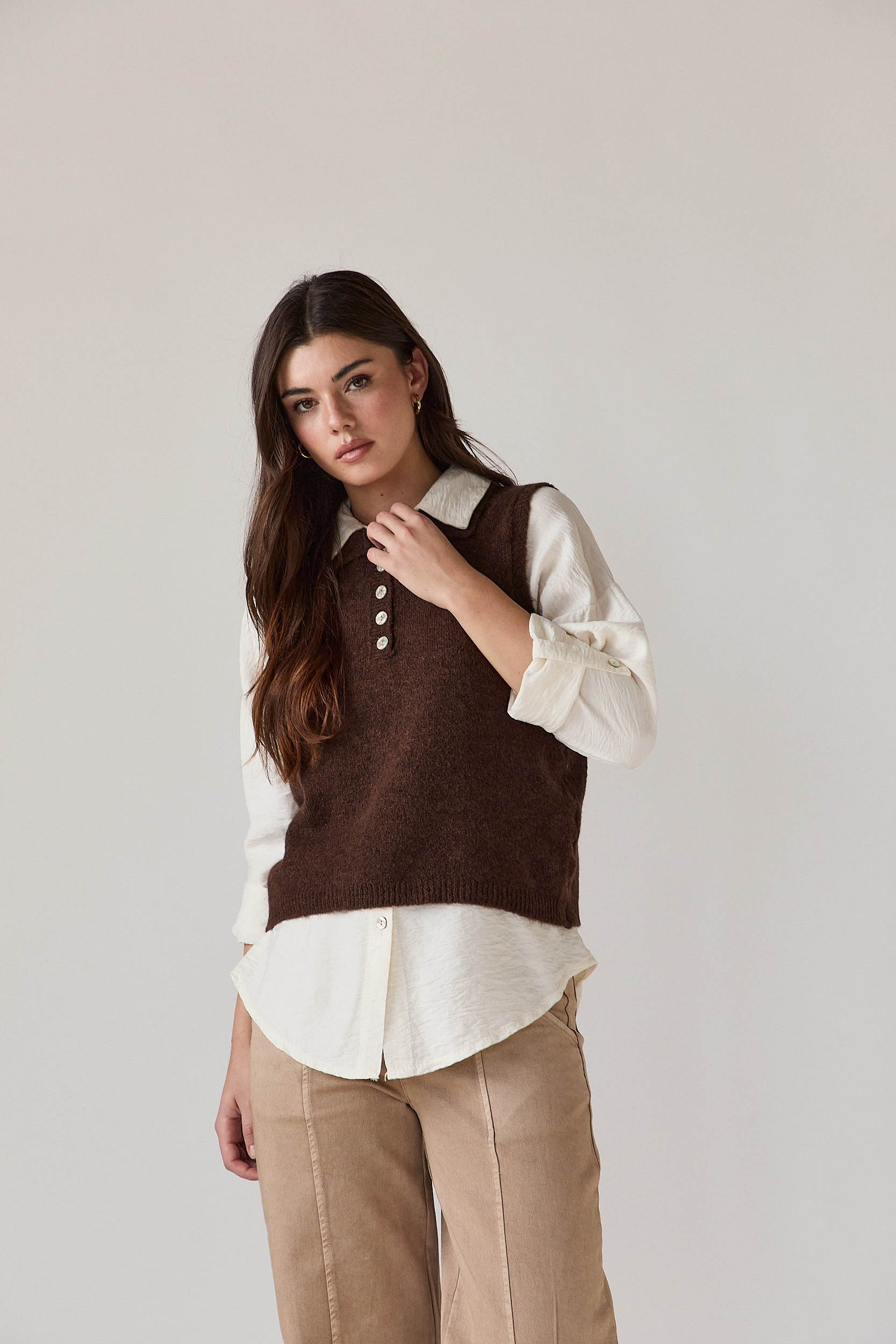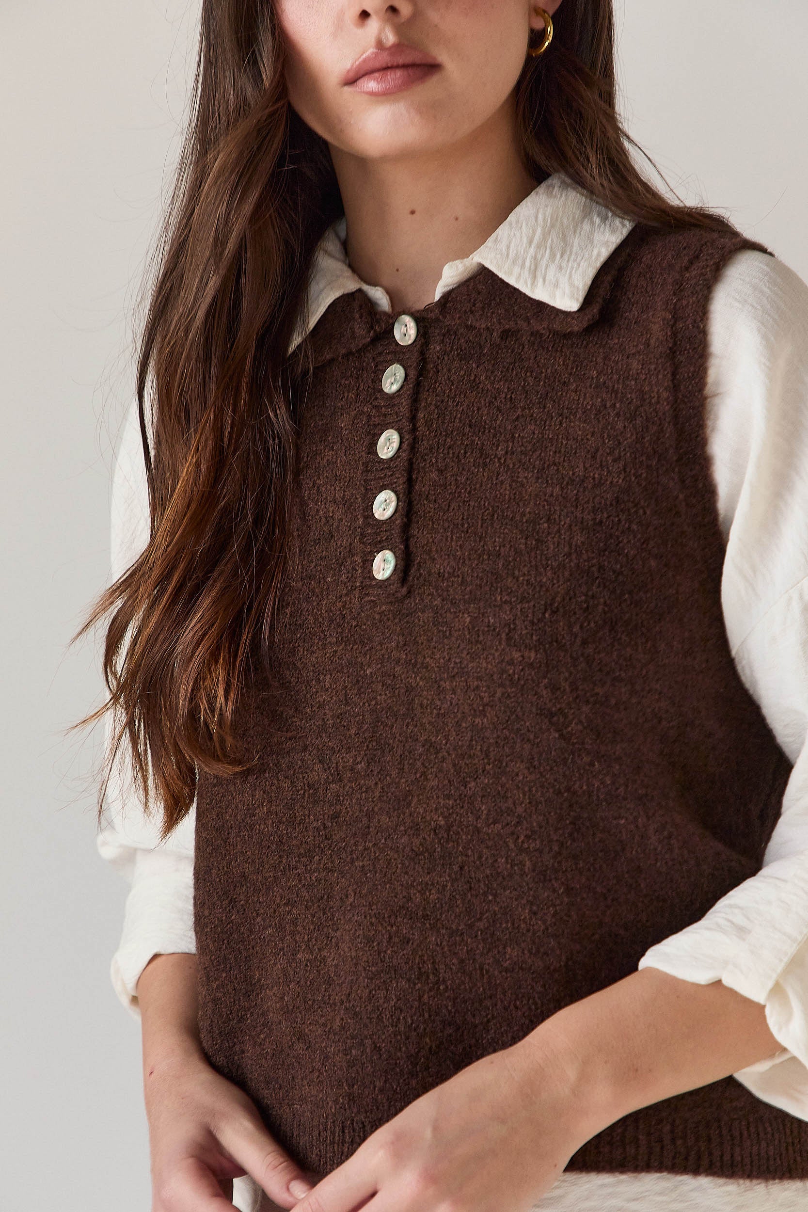 Polo de punto en tono marrón con corte sin mangas y cuello clásico. Lleva una tapeta frontal con varios botones decorativos que aportan un toque distintivo al diseño. El punto es suave y de grosor medio, con un fit cómodo que permite llevarlo solo o superpuesto.
