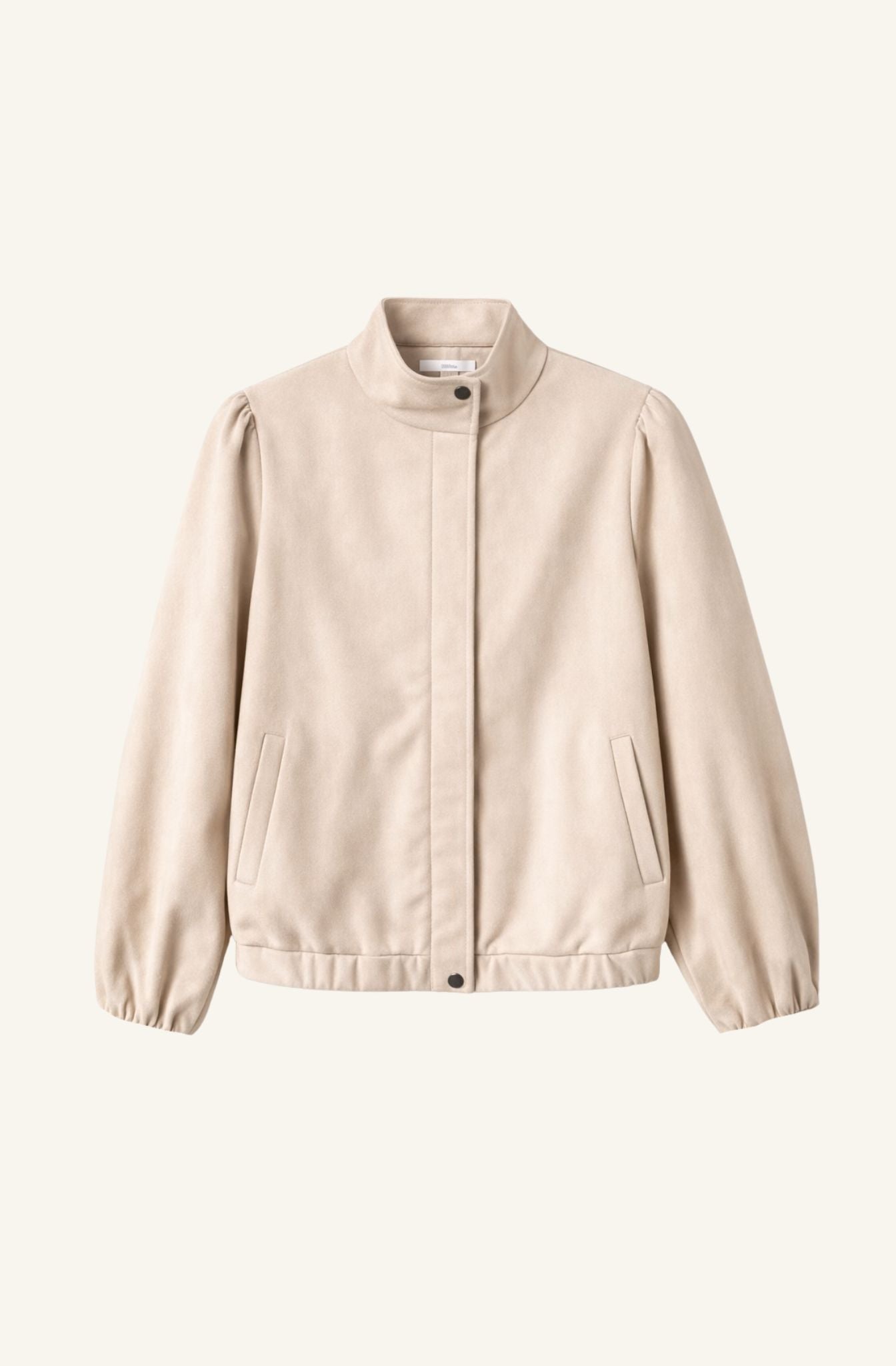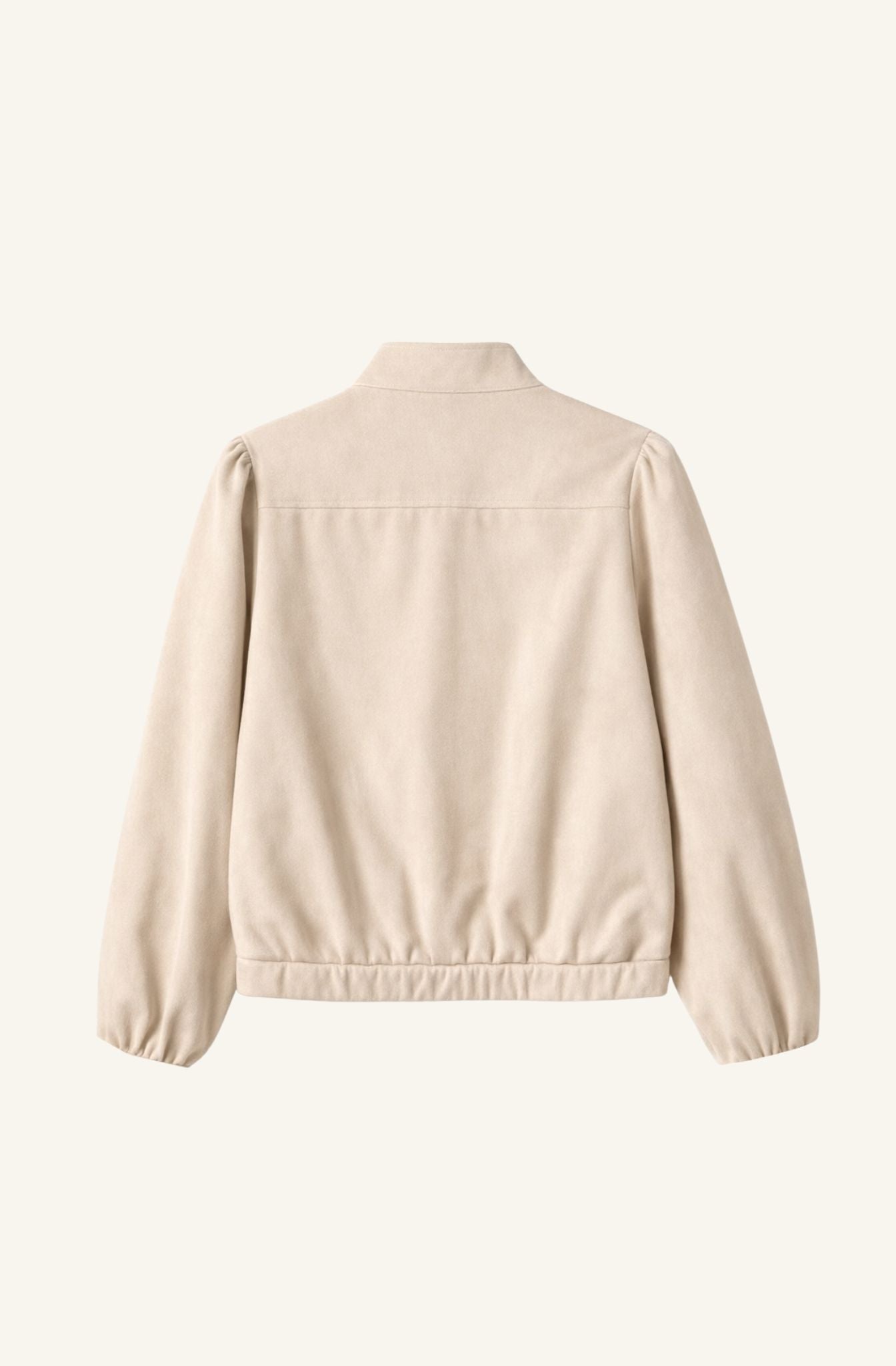 Chaqueta en tono beige con acabado efecto ante, de tacto suave y aspecto elegante. Presenta cuello subido y cierre frontal oculto con botón a presión, aportando una línea limpia y minimal. Destaca por su manga larga ligeramente abullonada, que añade volumen y carácter al diseño sin perder equilibrio. Bajo elástico que define la silueta y favorece el ajuste.