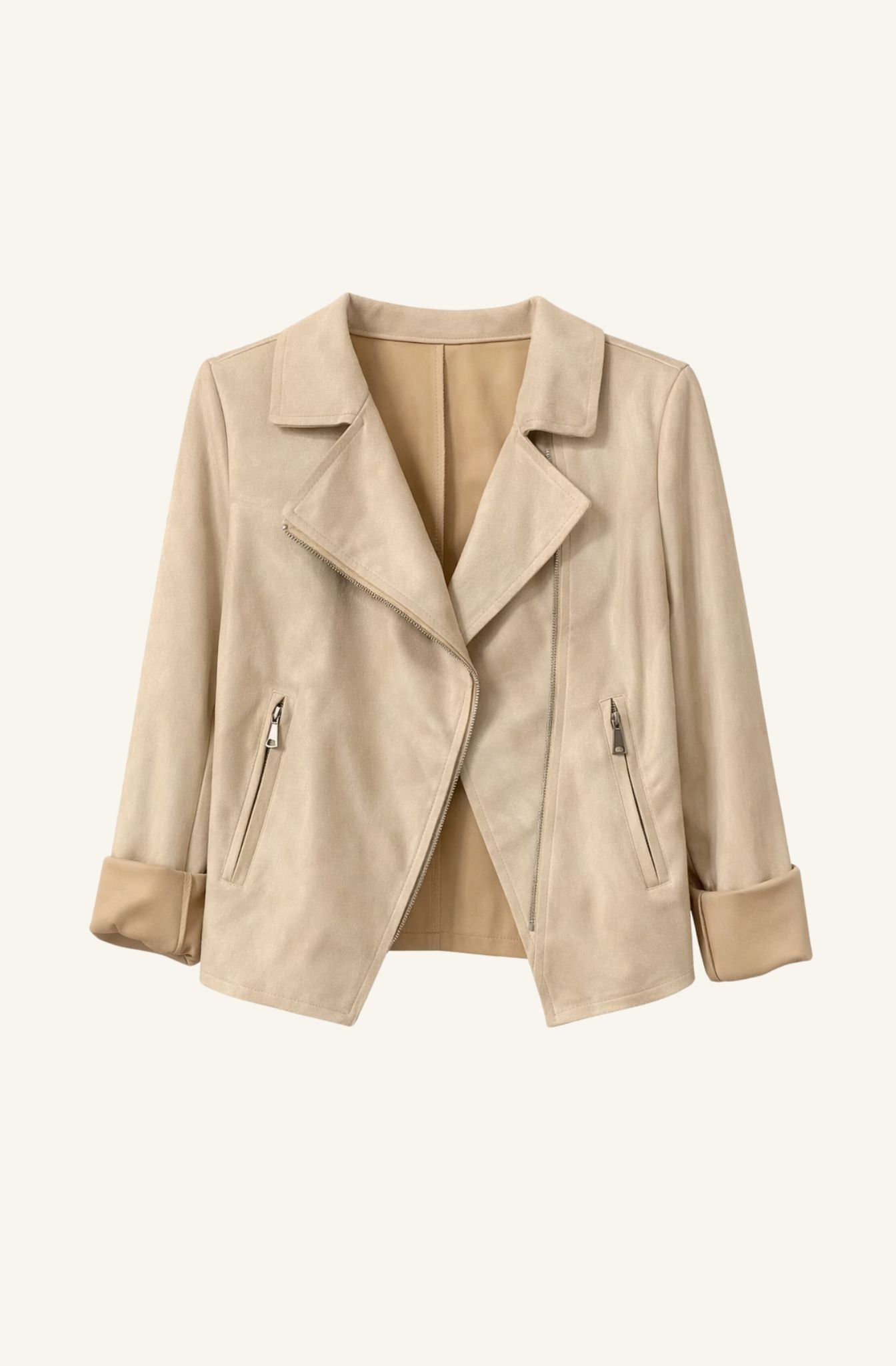 Chaqueta estilo perfecto en tejido efecto ante en tono beige claro. Presenta solapas amplias, cierre asimétrico con cremallera y bolsillos frontales con detalle de cremallera que aportan un toque actual al diseño. Corte recto y largo a la cadera, pensada para una silueta favorecedora y cómoda.