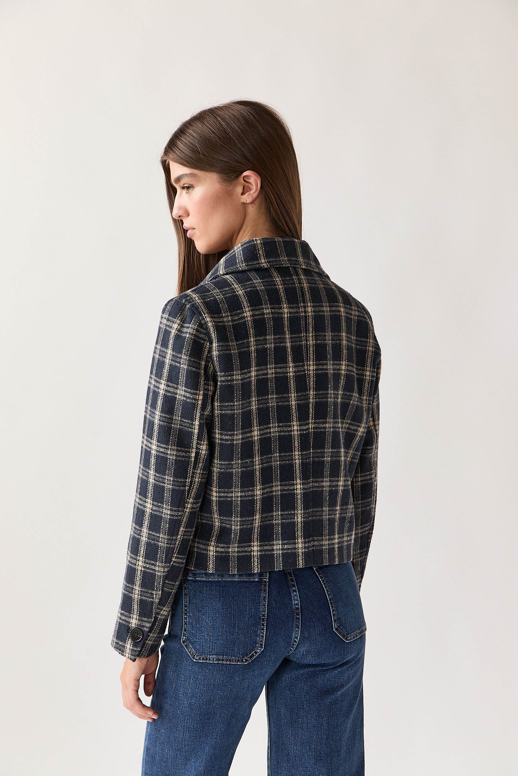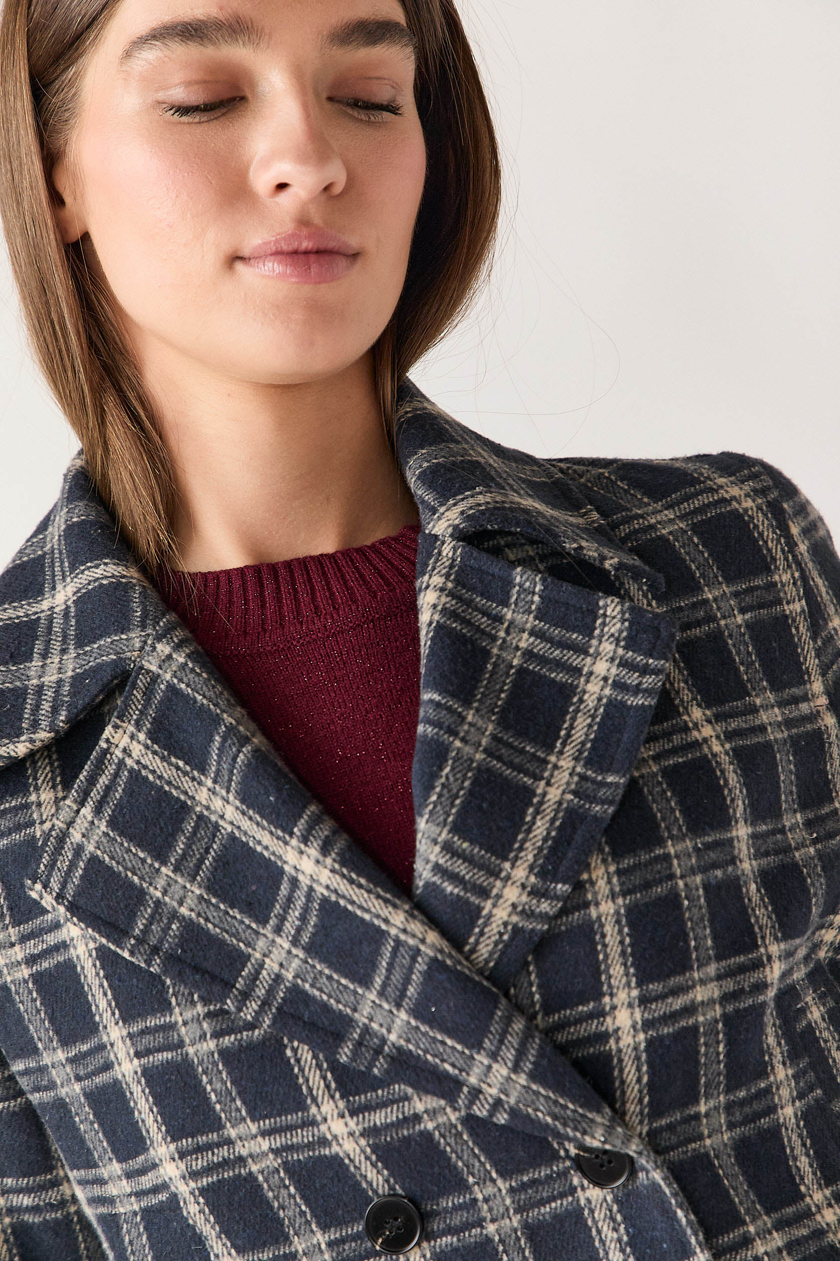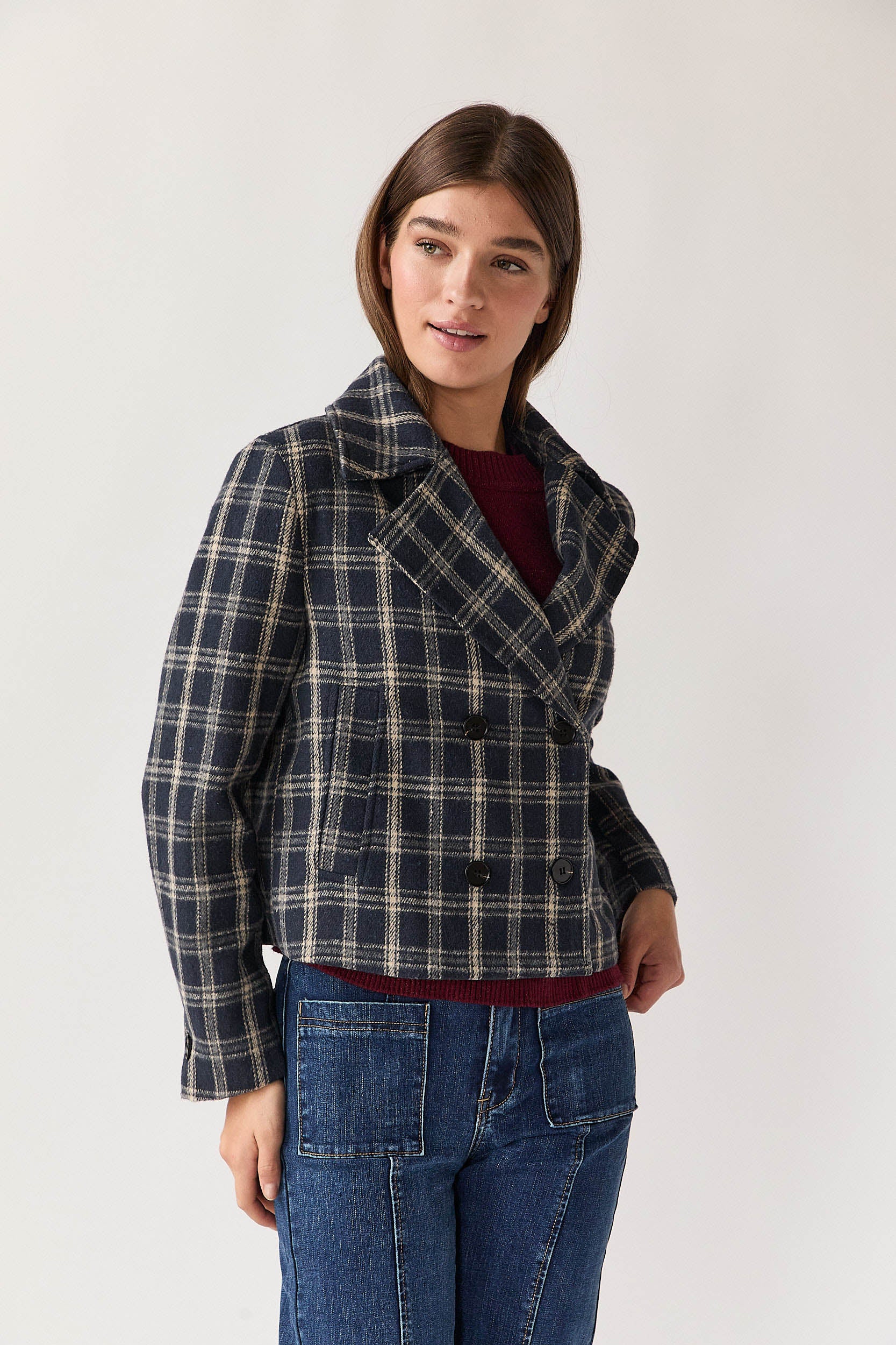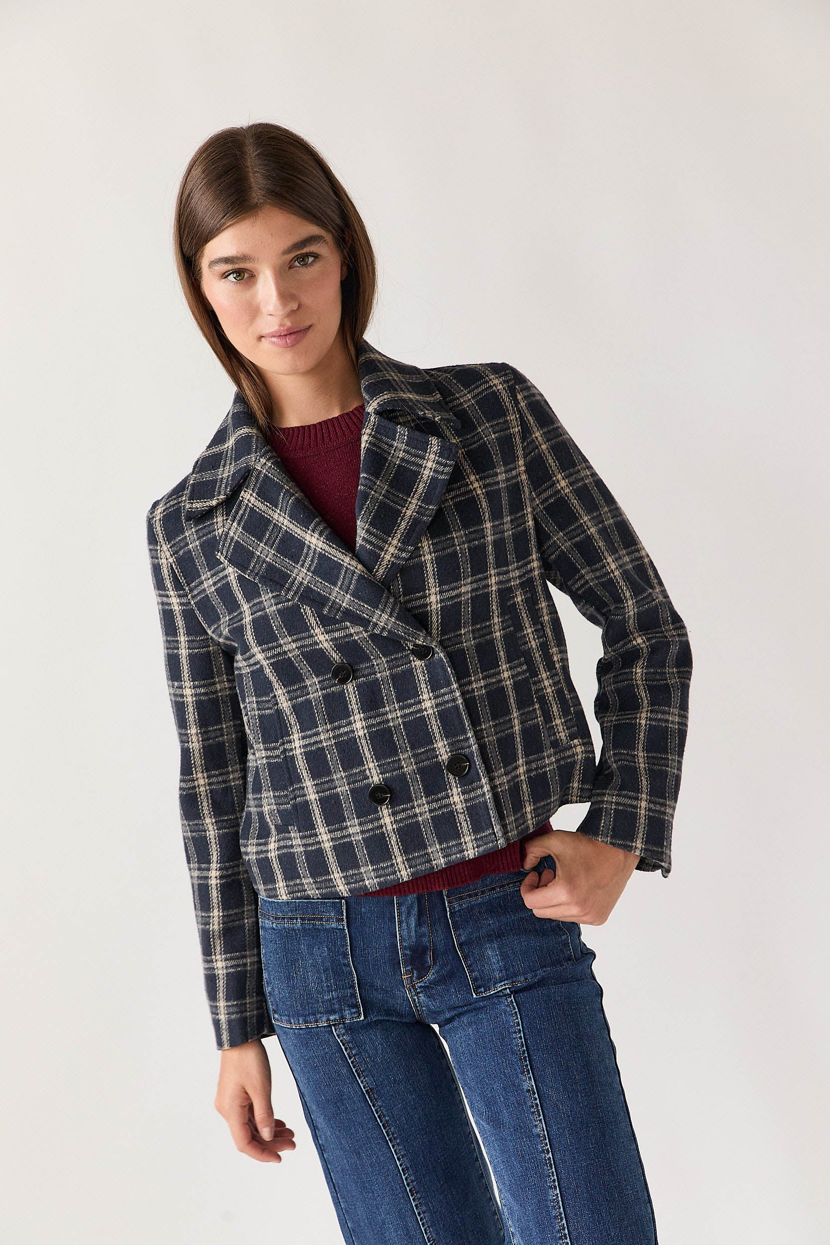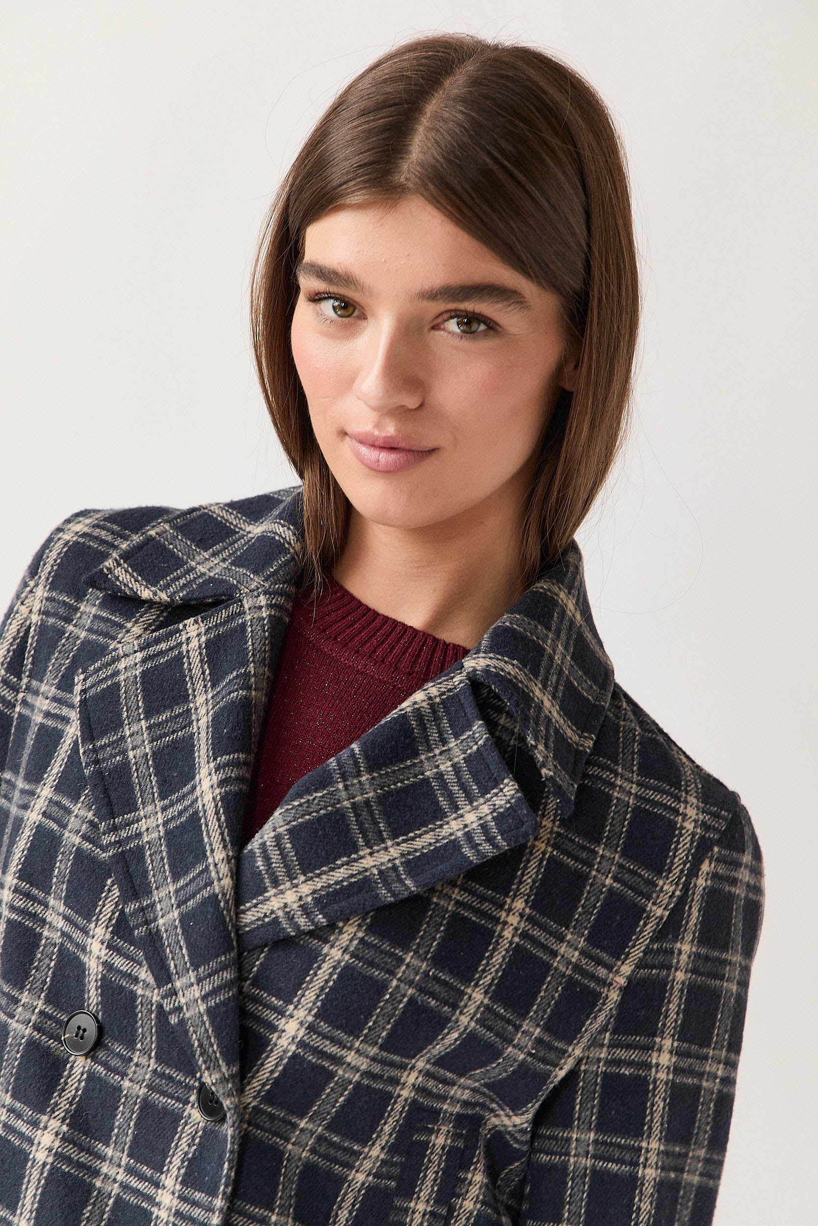 Abrigo corto de doble botonadura en tono azul marino con estampado de cuadros en contraste beige. De silueta recta y ligeramente estructurada, con solapa clásica y acabado en largo a la cadera, perfecto para un look urbano y femenino.