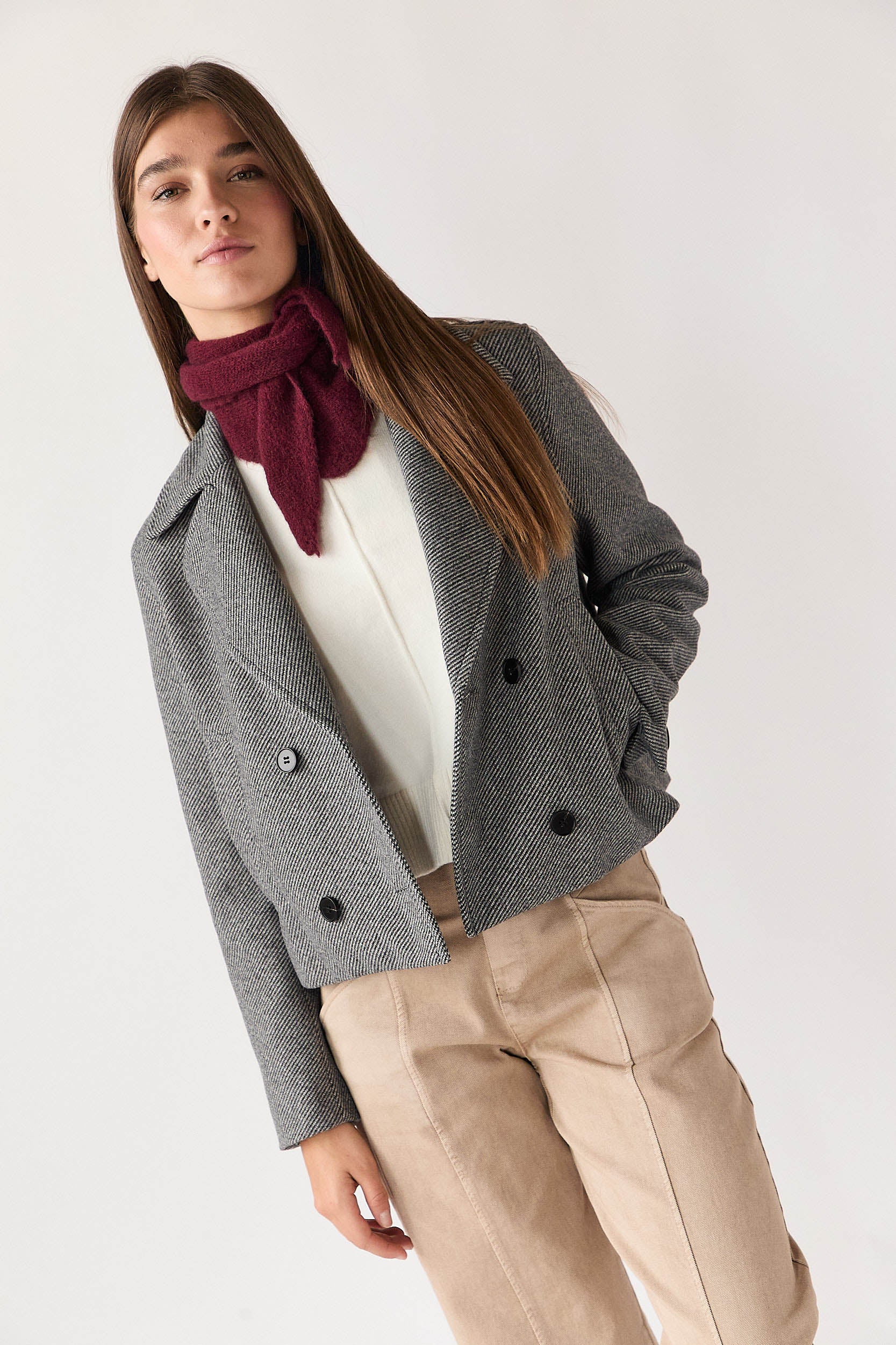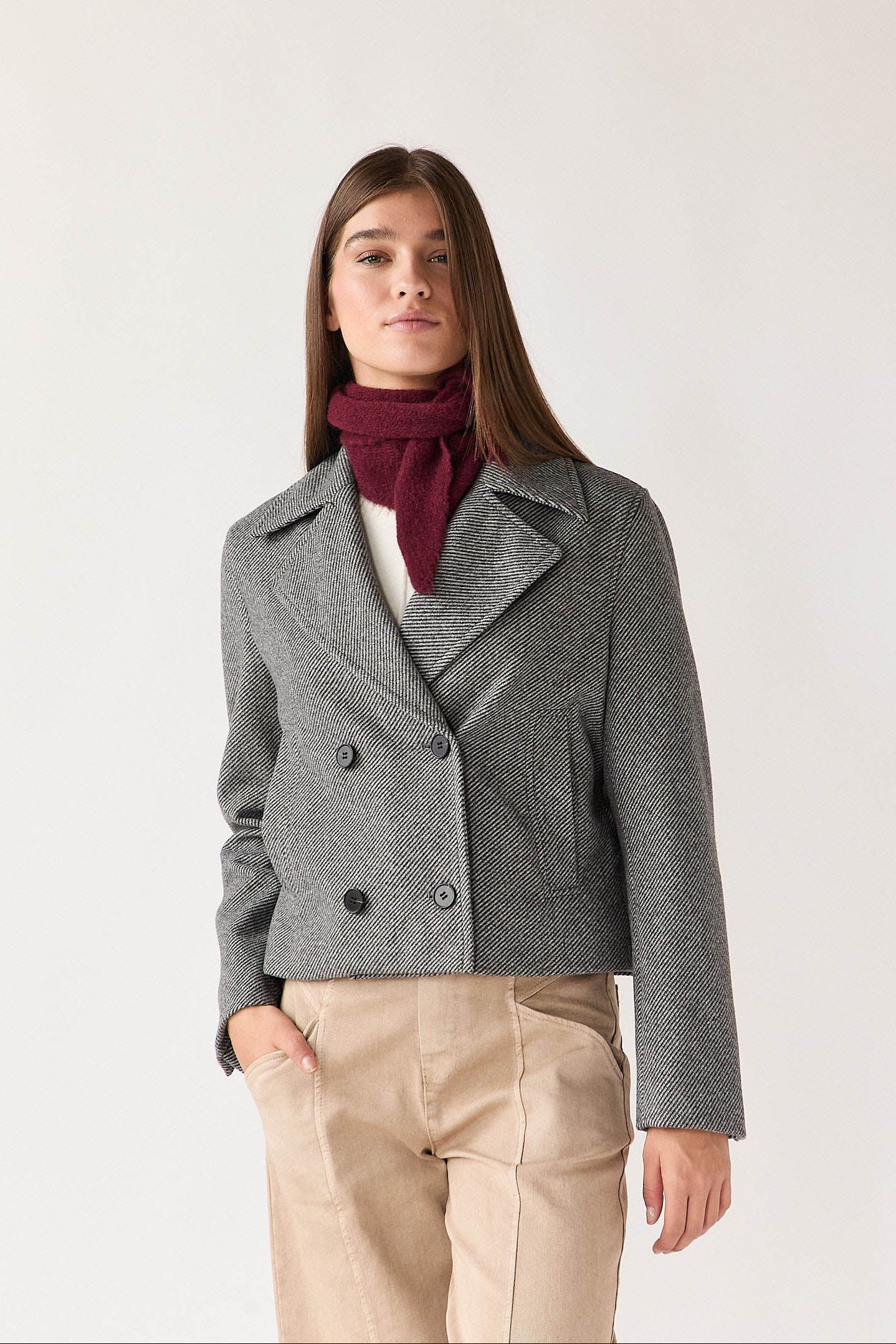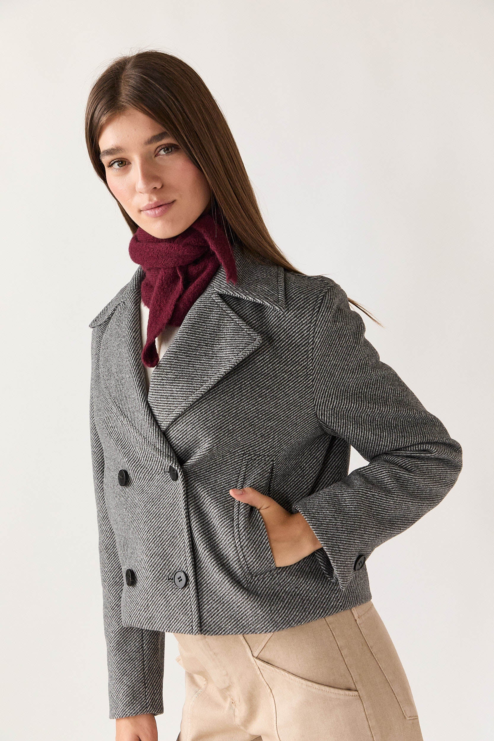 Abrigo corto en tono gris con estampado de espiga fina. Presenta solapa amplia, cierre cruzado de doble botonadura y bolsillos delanteros discretos. Su corte recto y largo a la cadera le aportan un aire moderno y fácil de combinar.