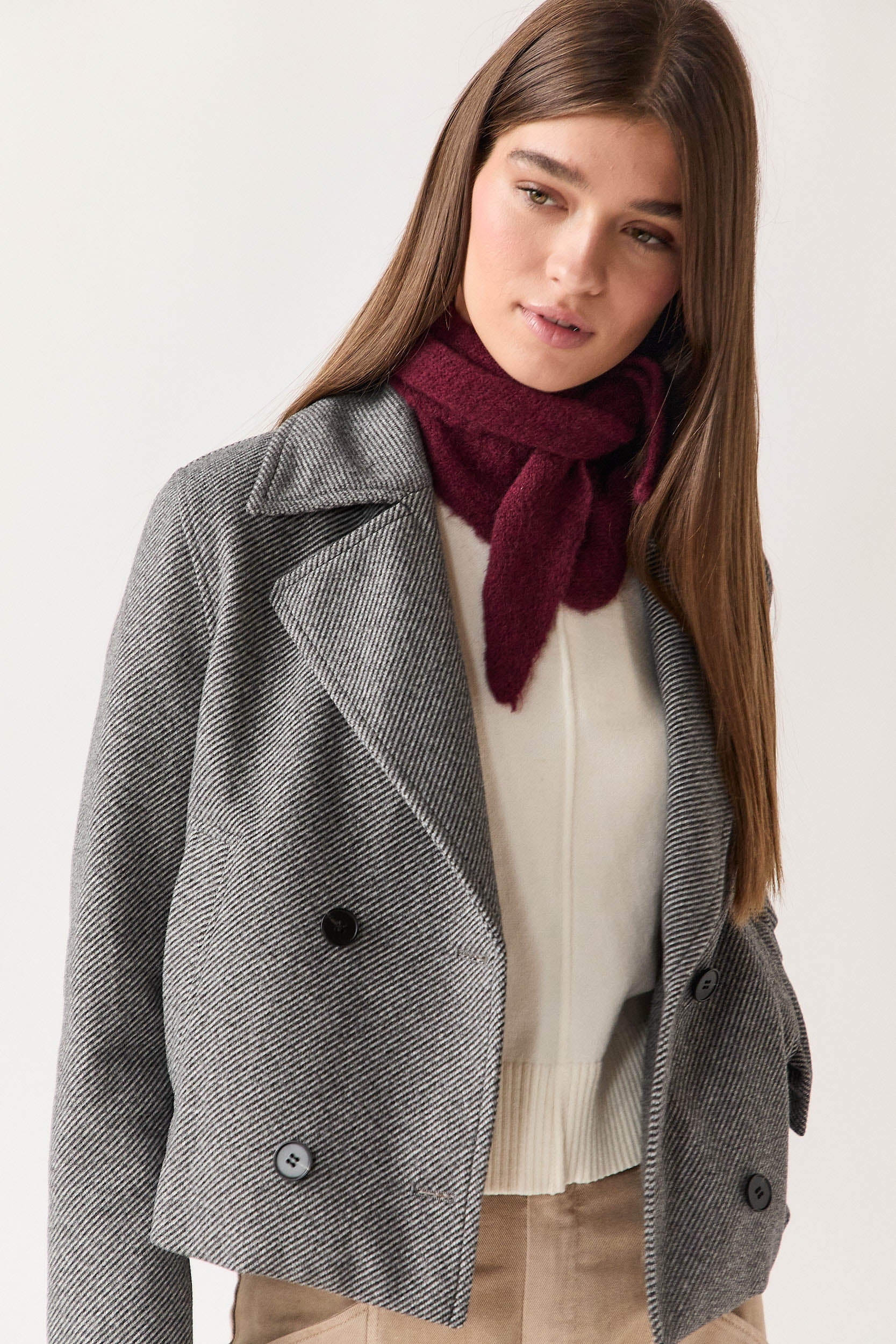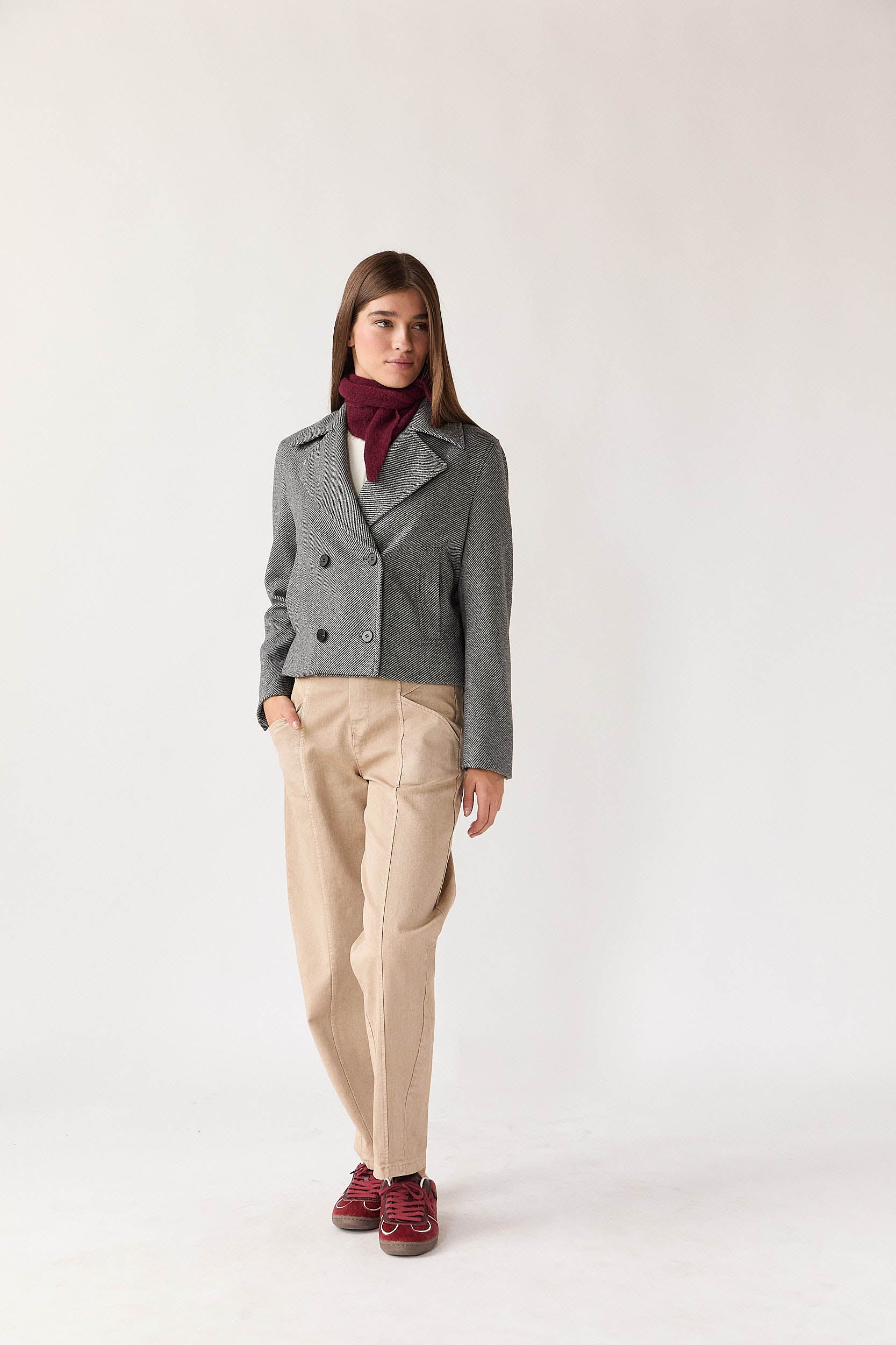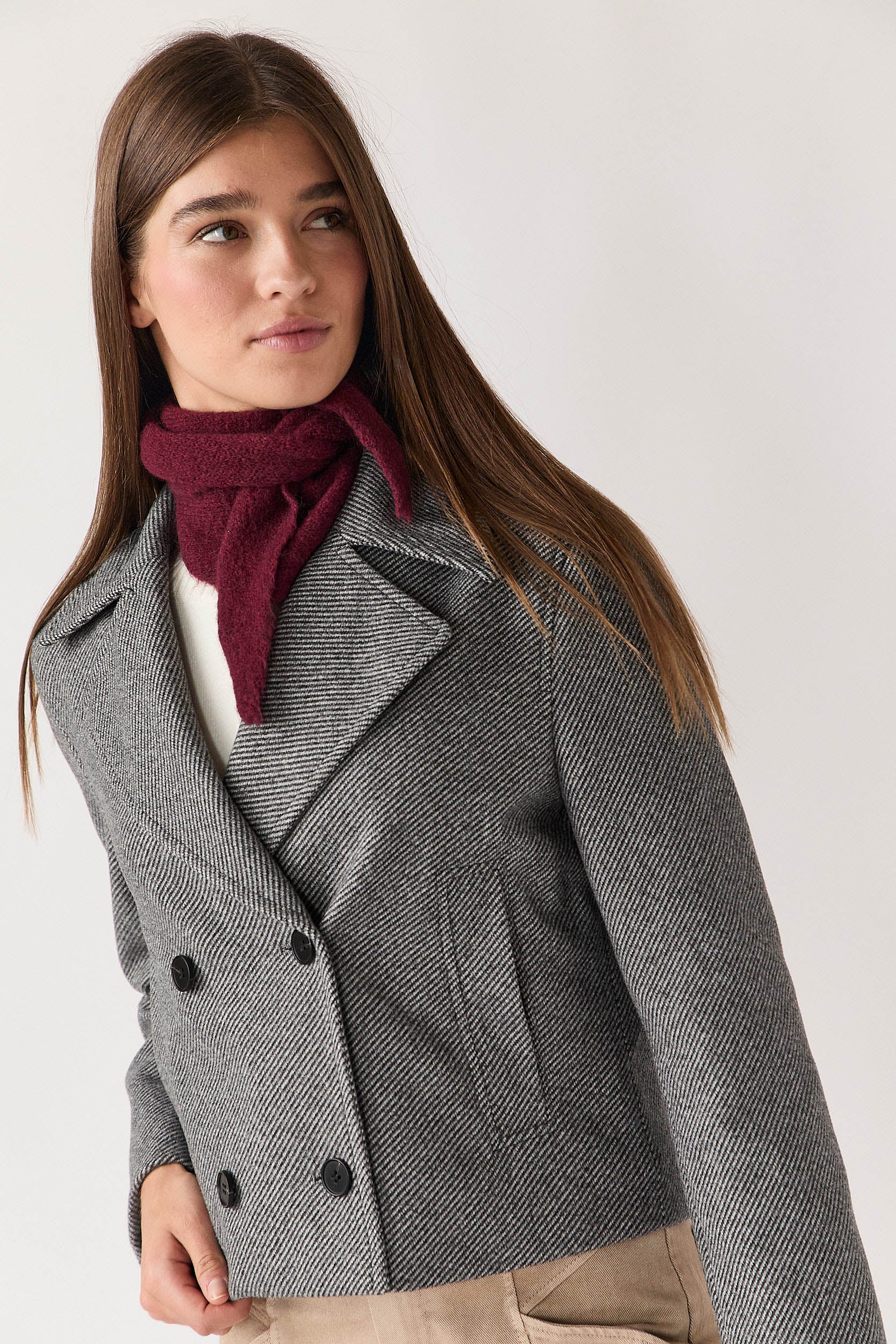 Abrigo corto en tono gris con estampado de espiga fina. Presenta solapa amplia, cierre cruzado de doble botonadura y bolsillos delanteros discretos. Su corte recto y largo a la cadera le aportan un aire moderno y fácil de combinar.