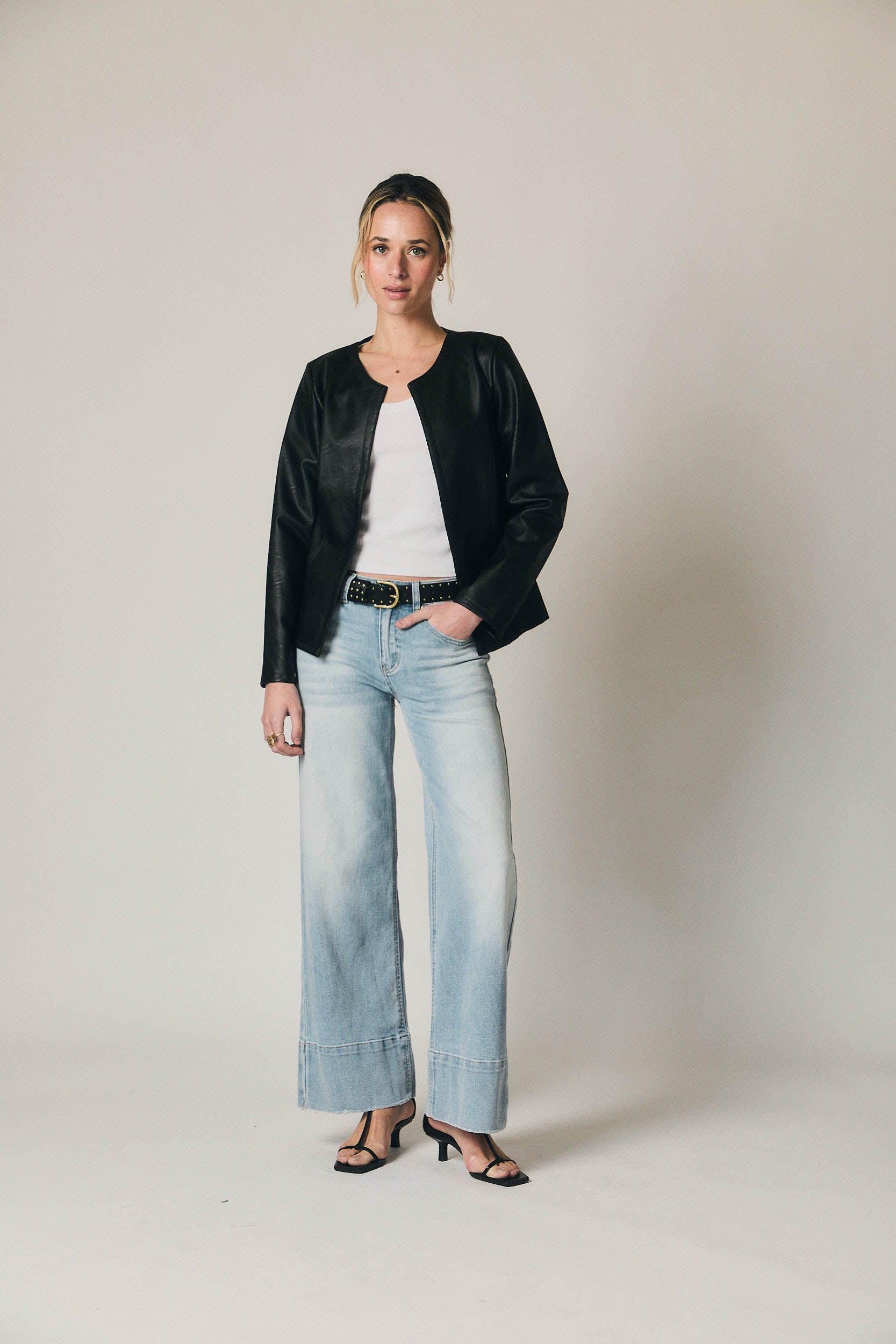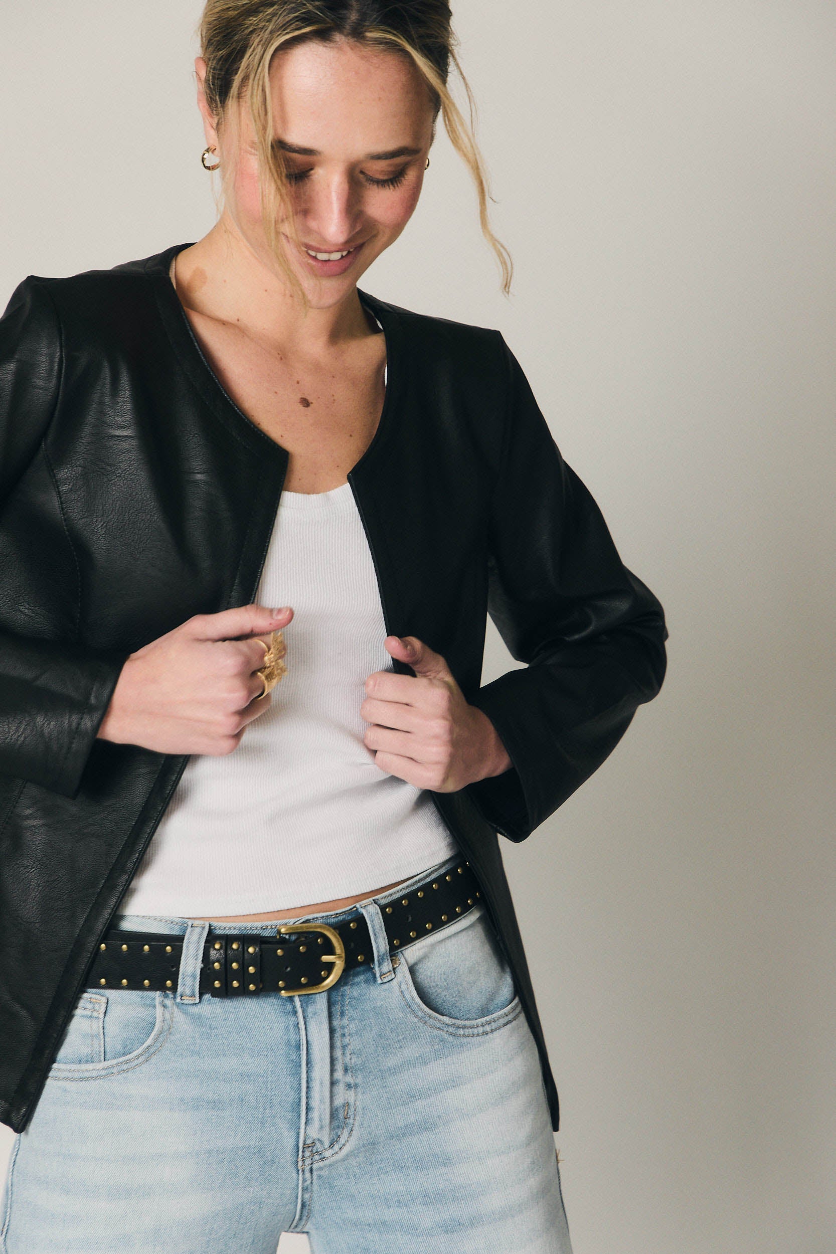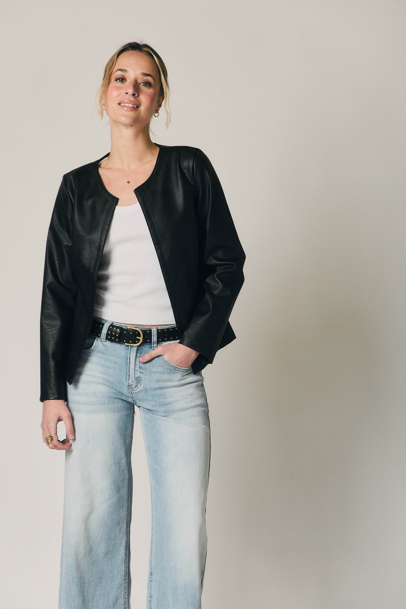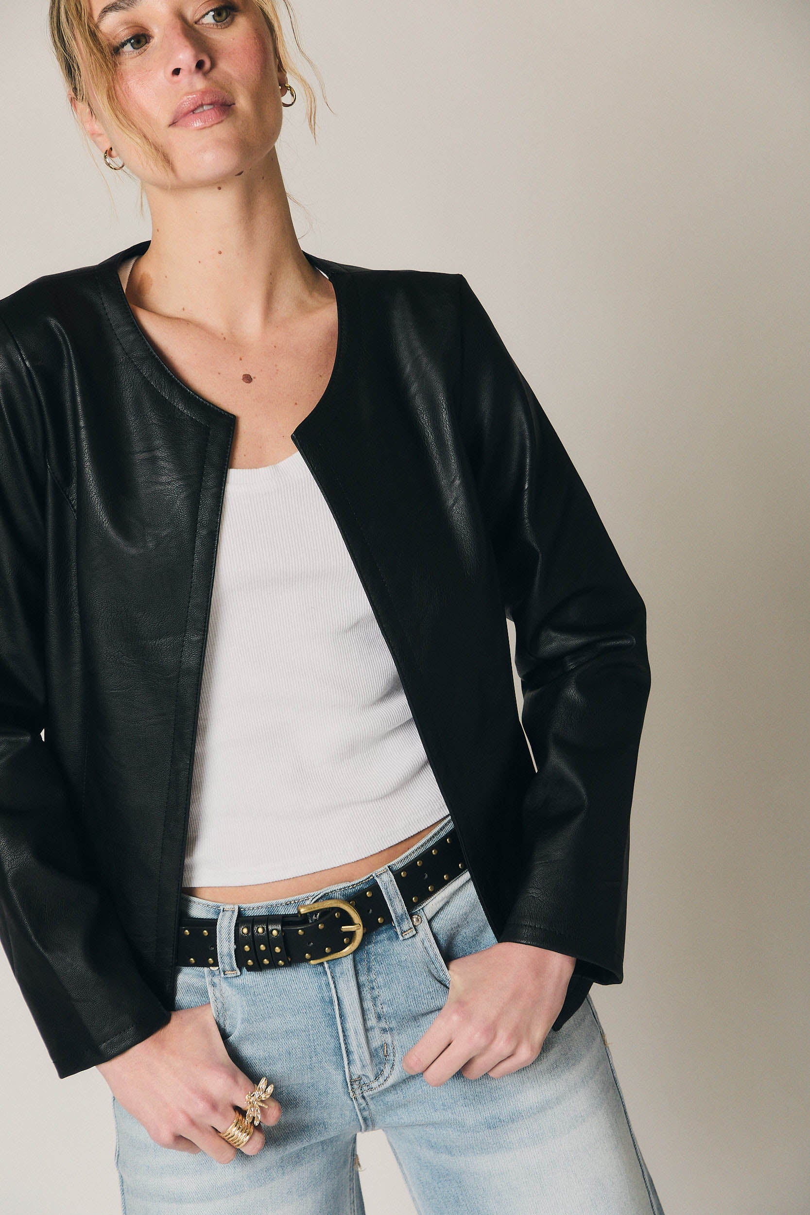 Chaqueta de polipiel en tono negro con cuello redondo y diseño abierto. Presenta un corte limpio y estructurado, con costuras marcadas que definen la silueta y aportan un acabado cuidado. Manga larga y largo a la cadera, pensada para un ajuste favorecedor y versátil.