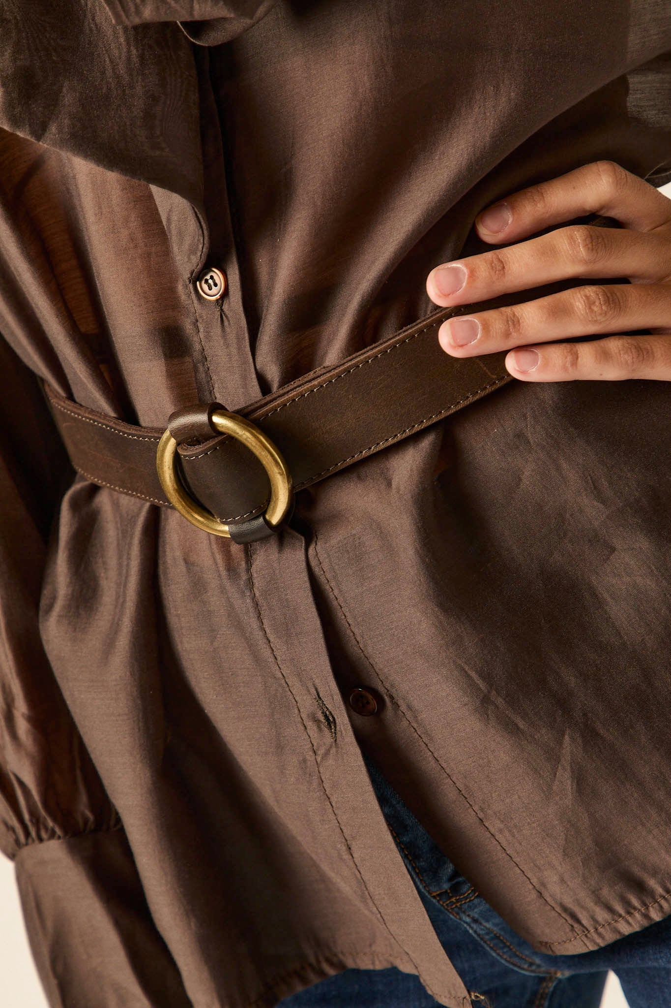 Cinturón de piel en color marrón con diseño liso y hebilla circular metálica en acabado dorado envejecido. Un accesorio versátil que aporta un toque sofisticado y atemporal a cualquier look.