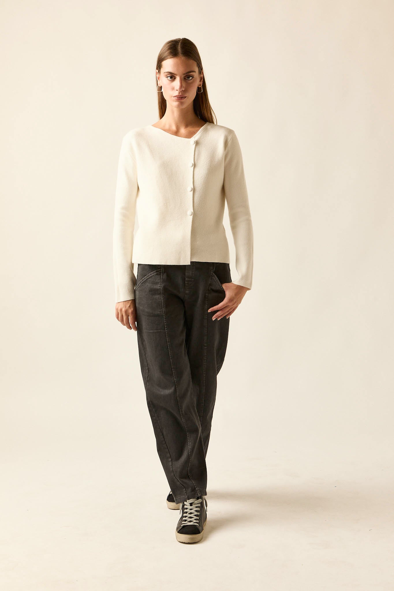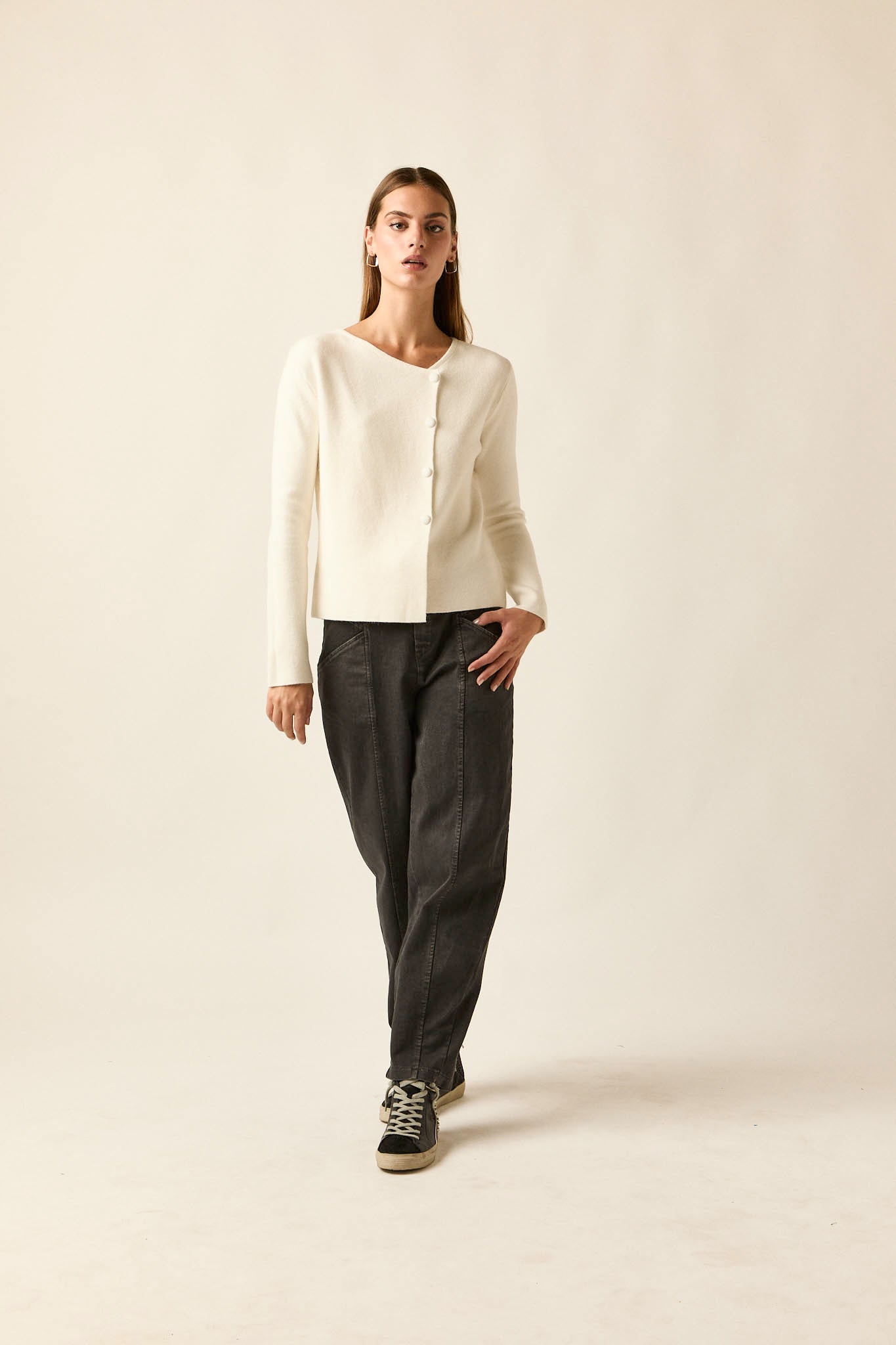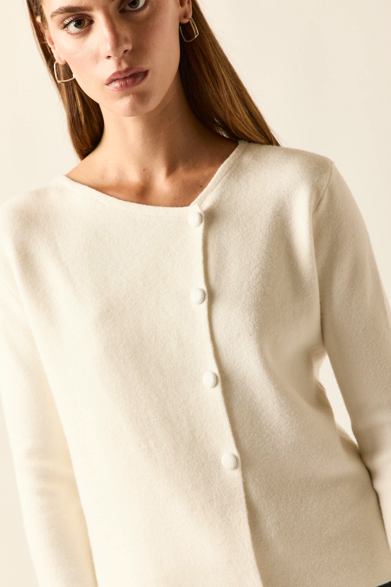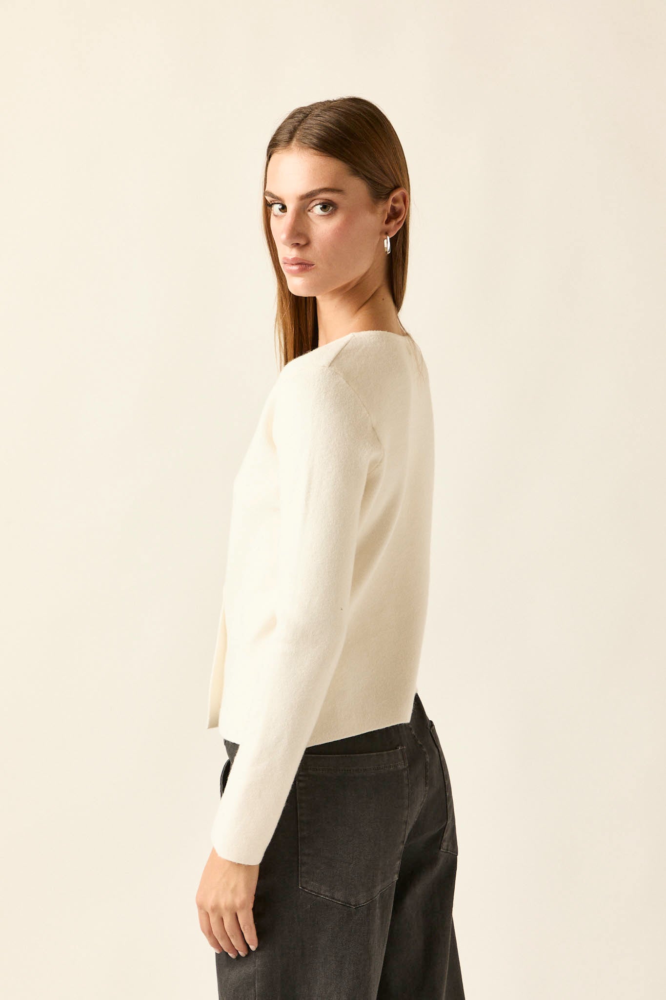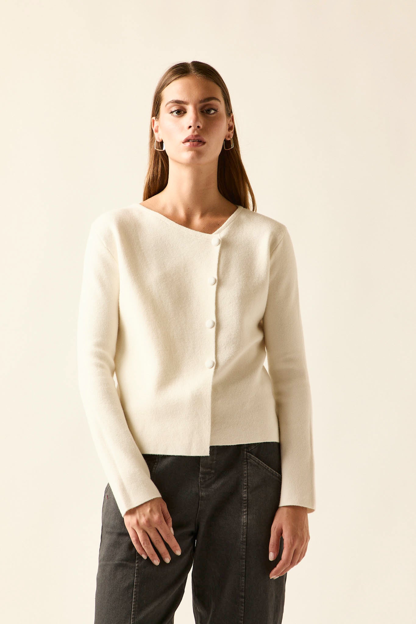 Chaqueta de punto en color crudo con diseño cruzado y cierre lateral de botones forrados al tono. Escote en pico sutil y manga larga de corte recto, con un acabado limpio y minimalista. Su silueta corta la convierte en una prenda versátil y fácil de combinar.