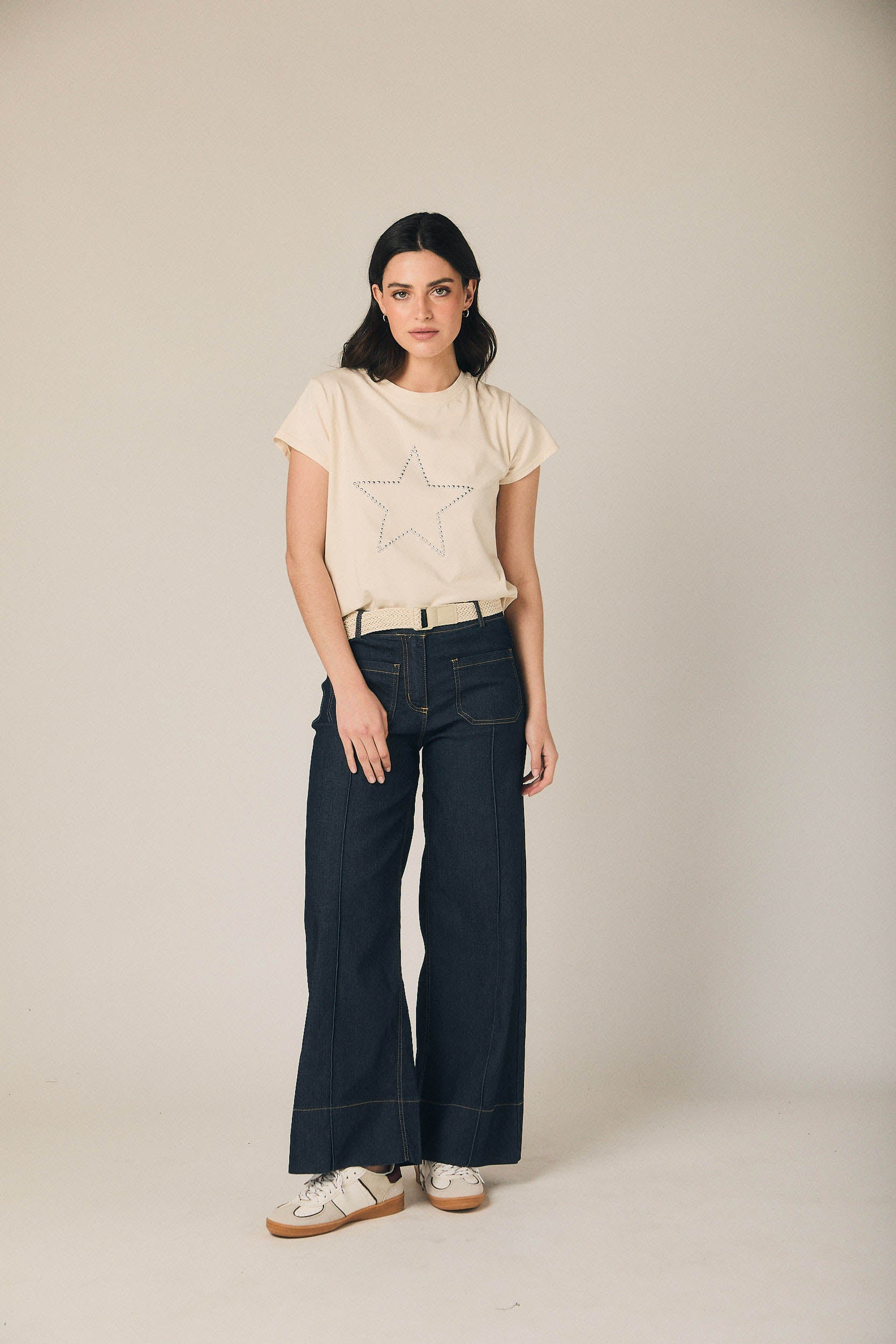Pantalón denim de mujer en tono azul oscuro con pernera ancha y caída recta. Diseño de tiro medio con dos bolsillos traseros de parche y costuras vistas en contraste que recorren la prenda y refuerzan su estructura. Incluye cinturón trenzado en tono natural.