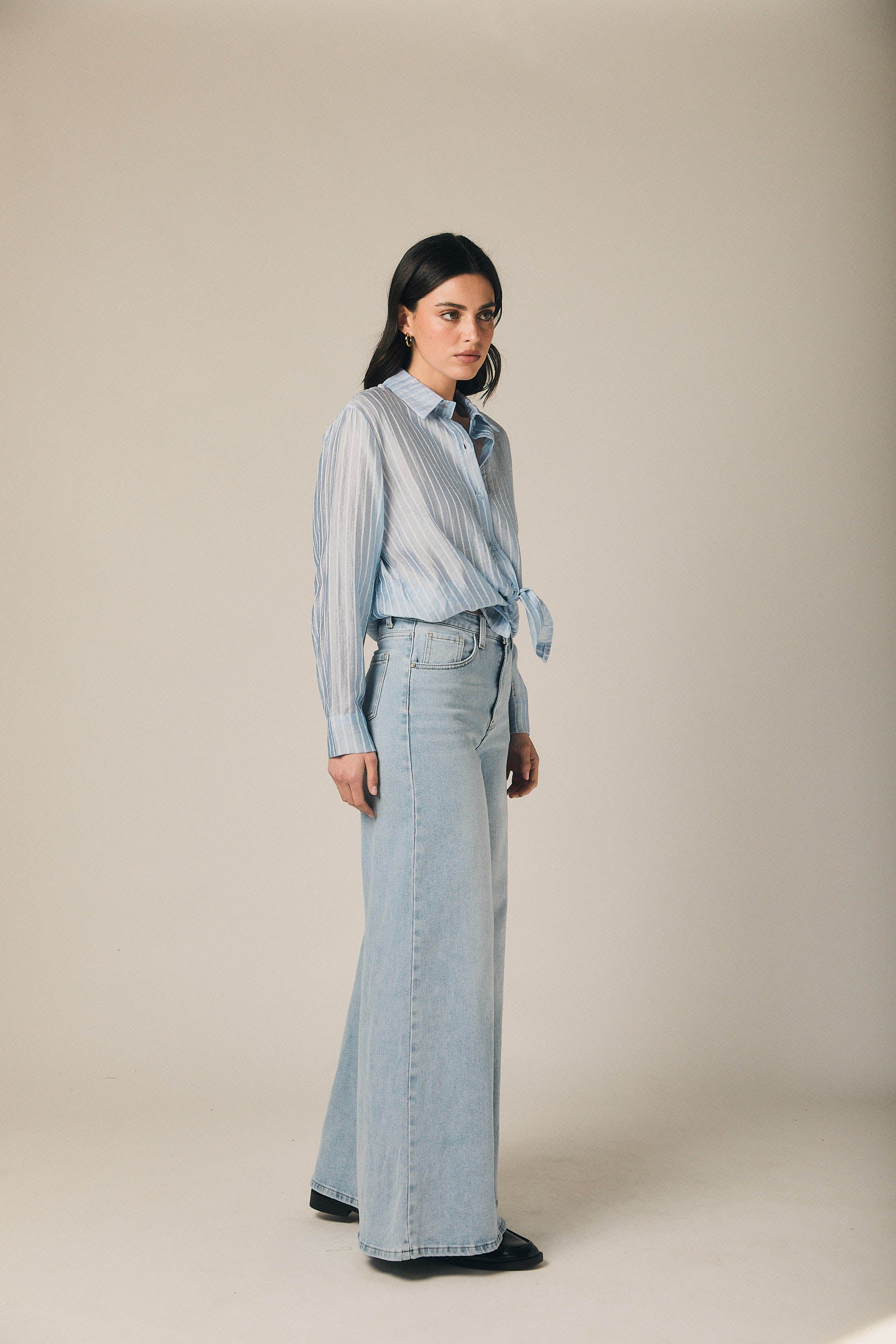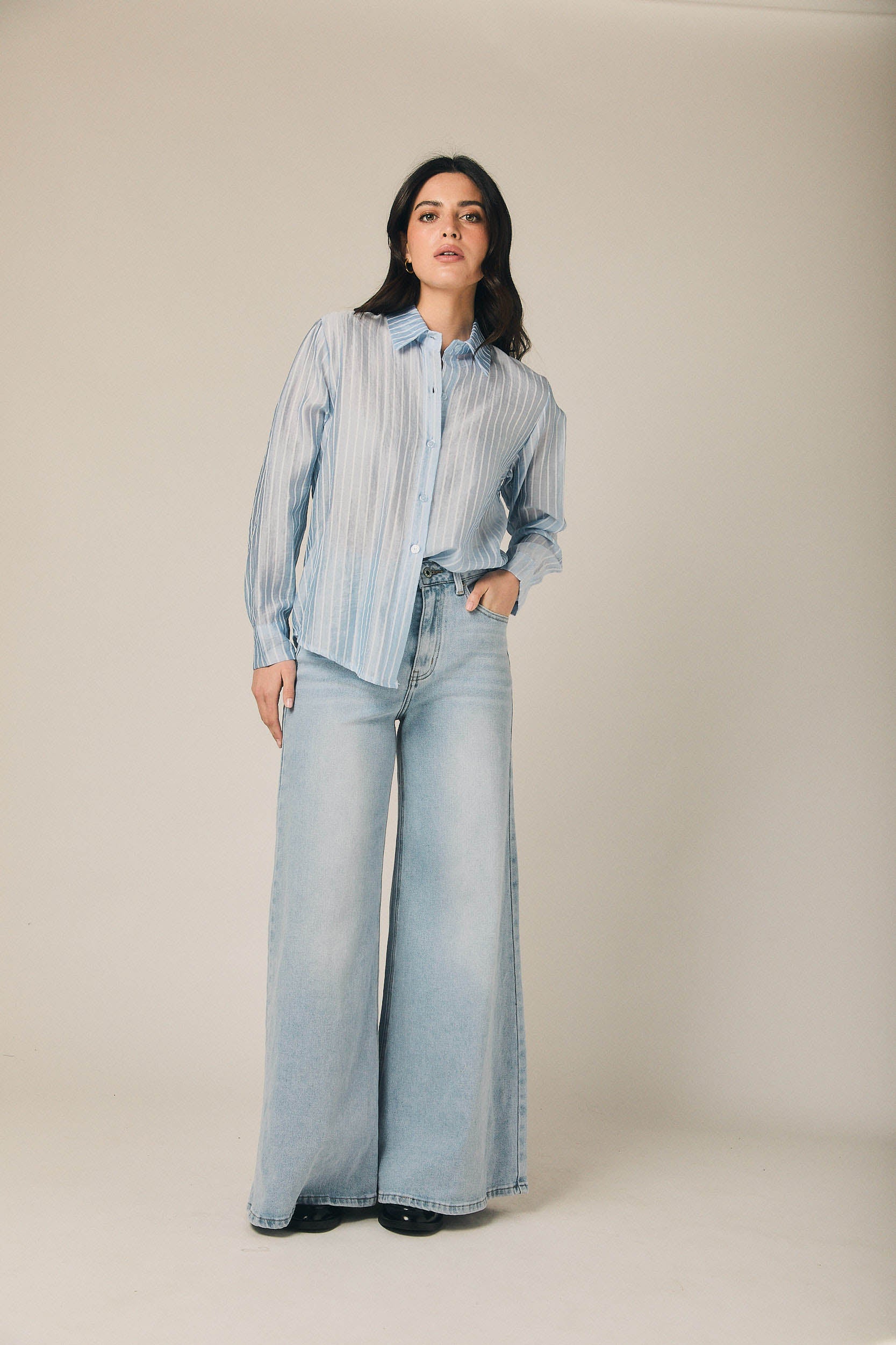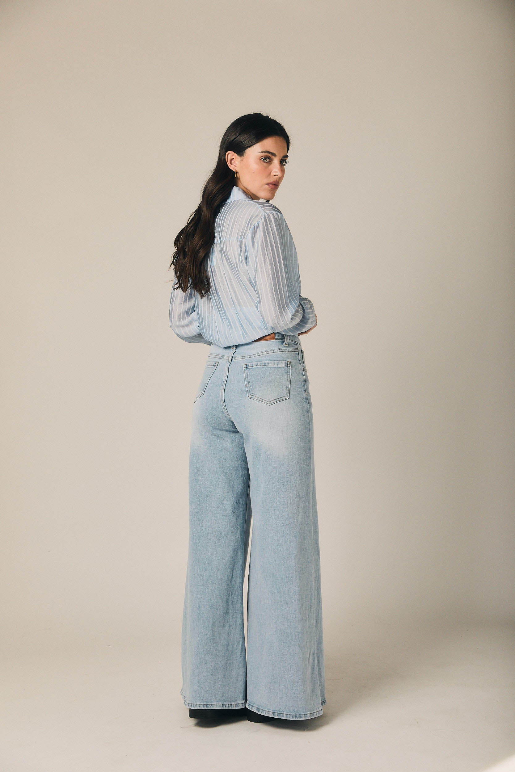 Jeans en tono azul con tiro alto y pernera extra ancha. Diseño de líneas limpias, con cintura bien definida y caída amplia desde la cadera hasta el bajo, creando una silueta fluida y marcada. El largo aporta presencia al conjunto y equilibra el volumen del pantalón, manteniendo un estilo actual y fácil de llevar.