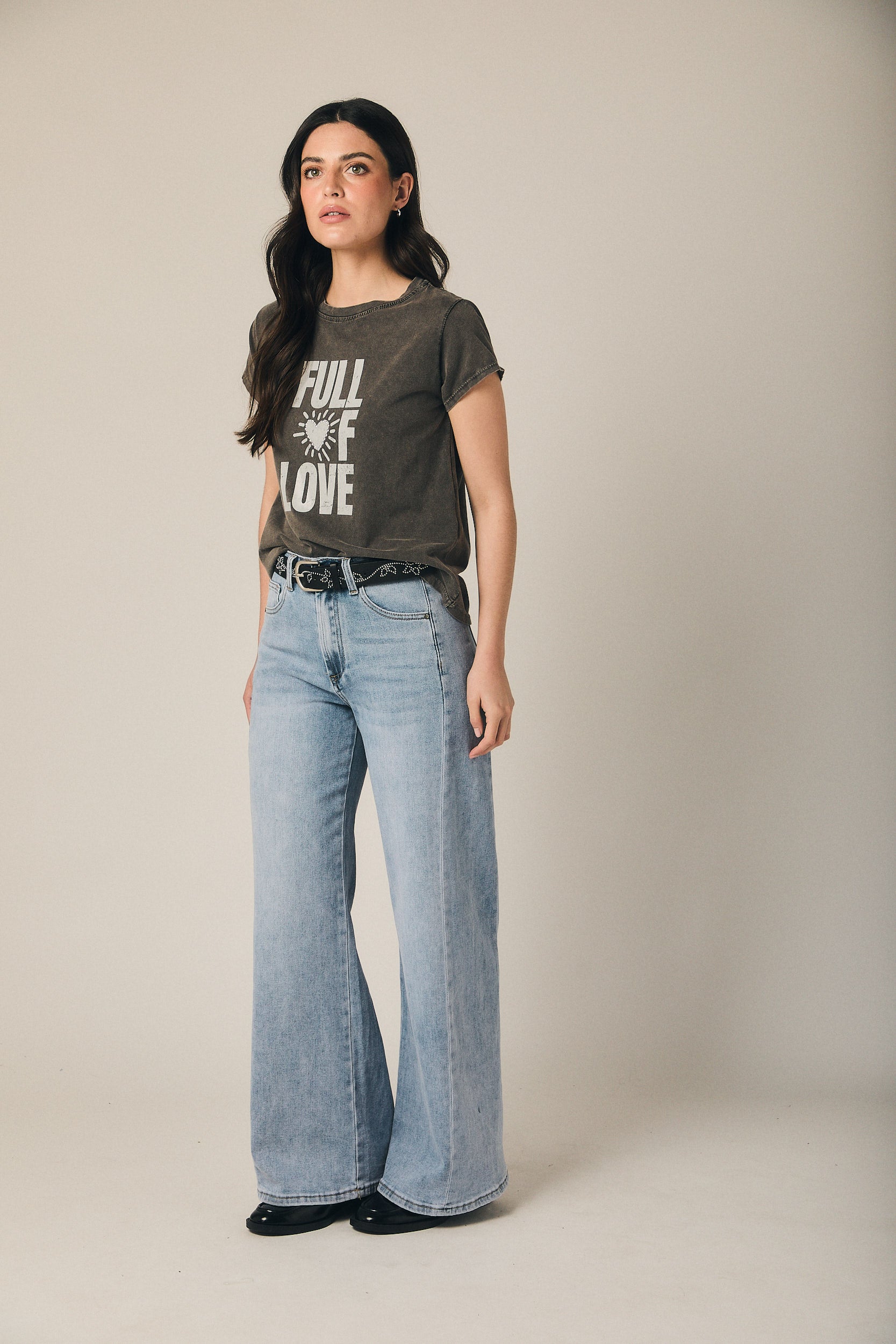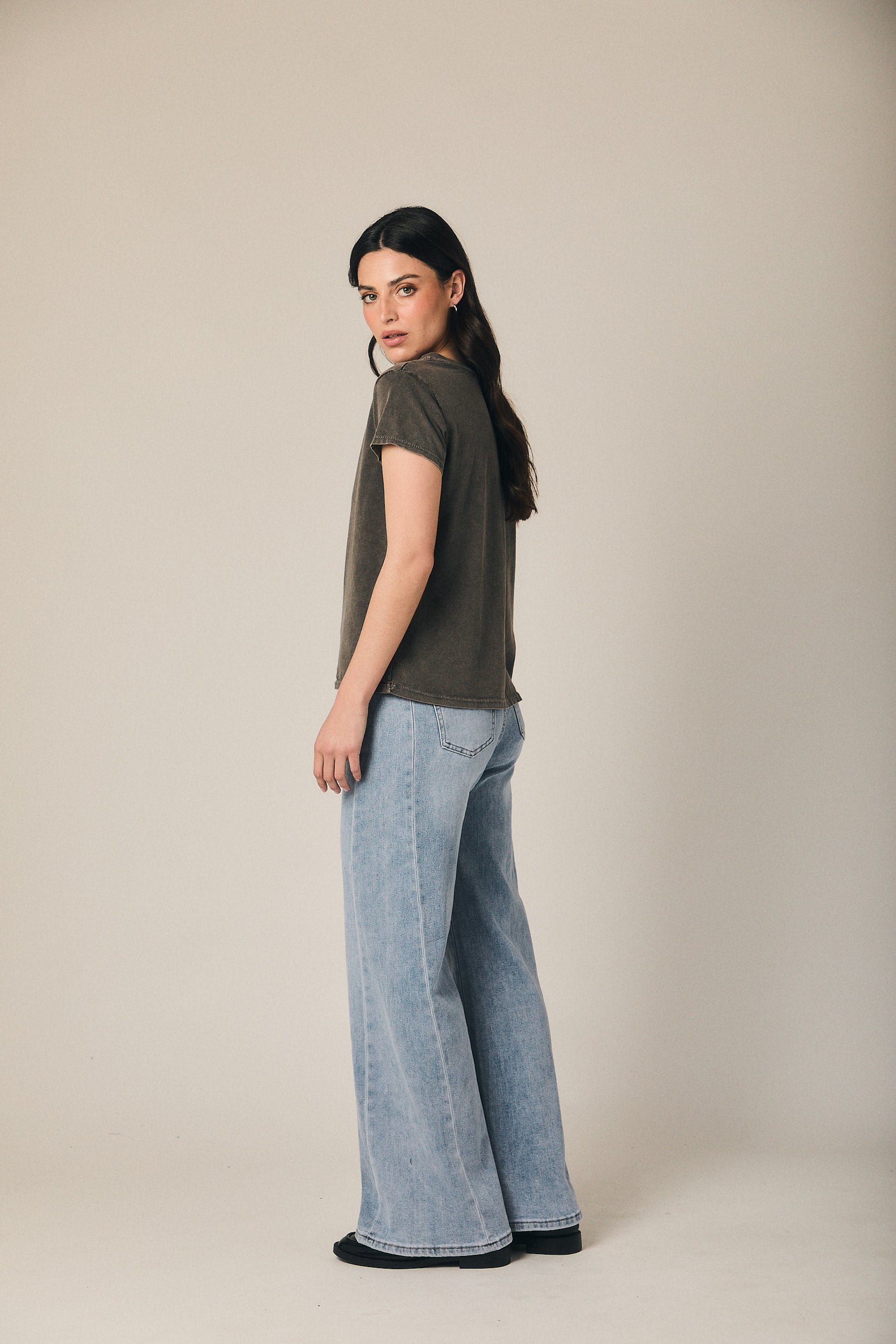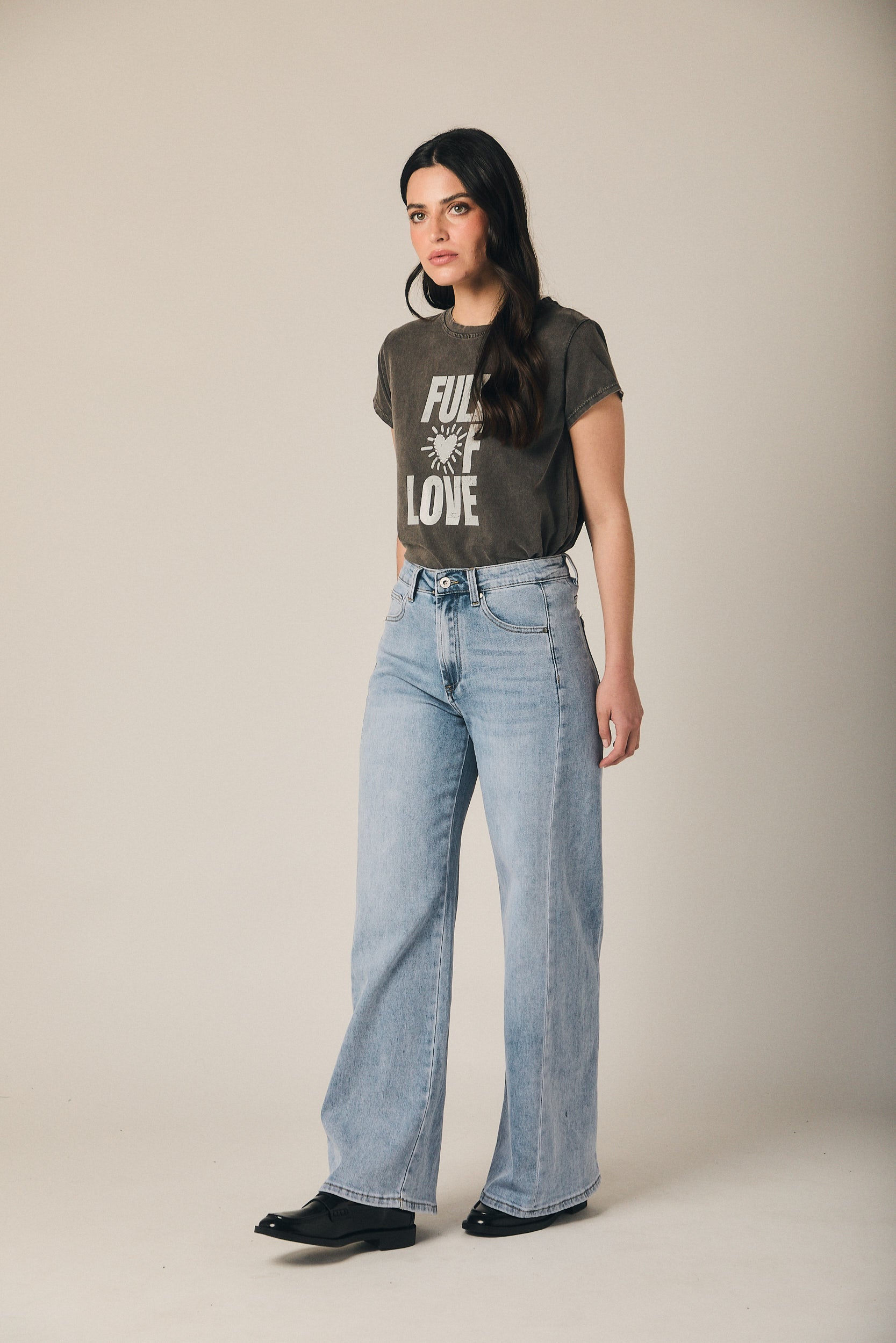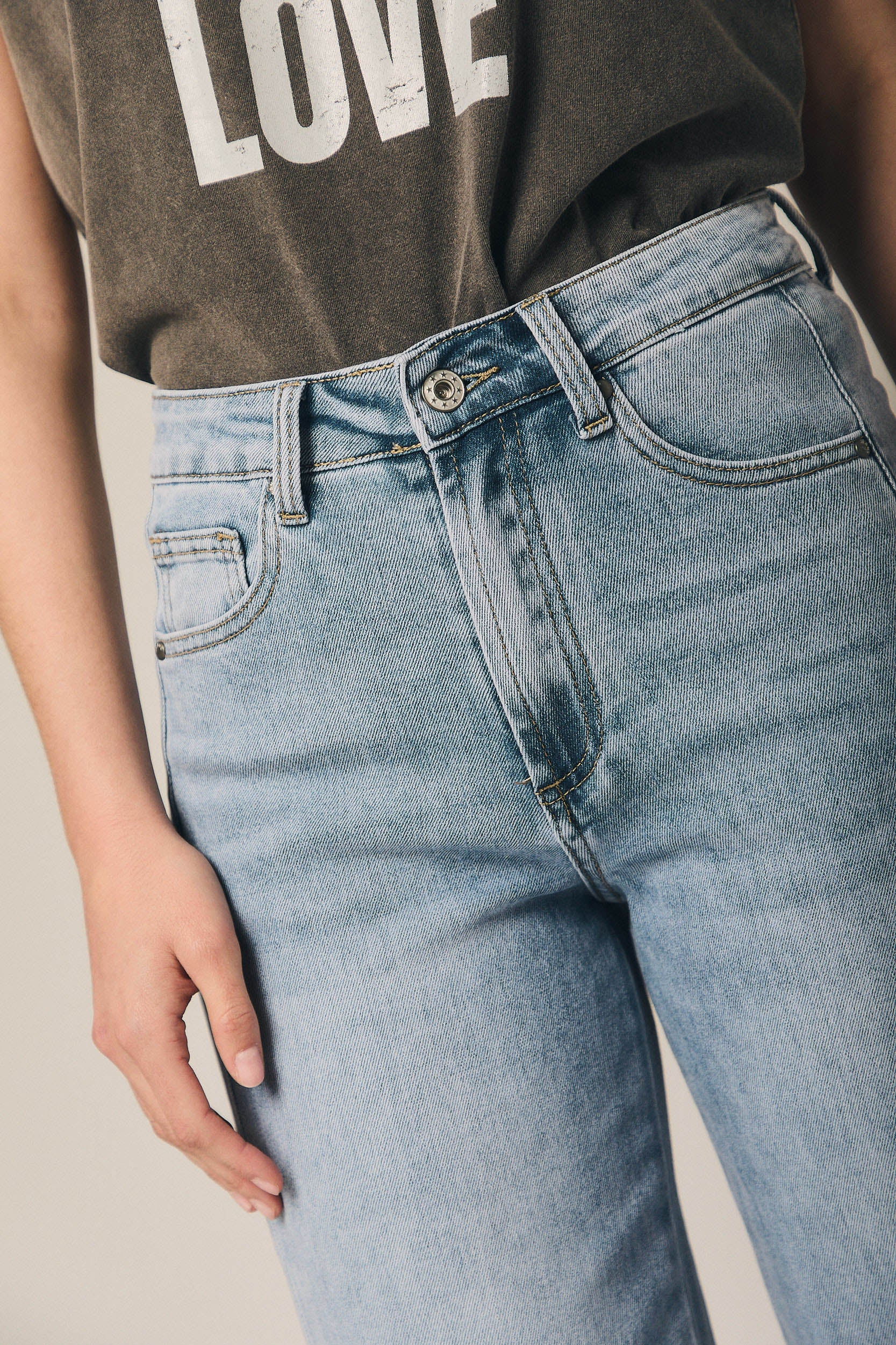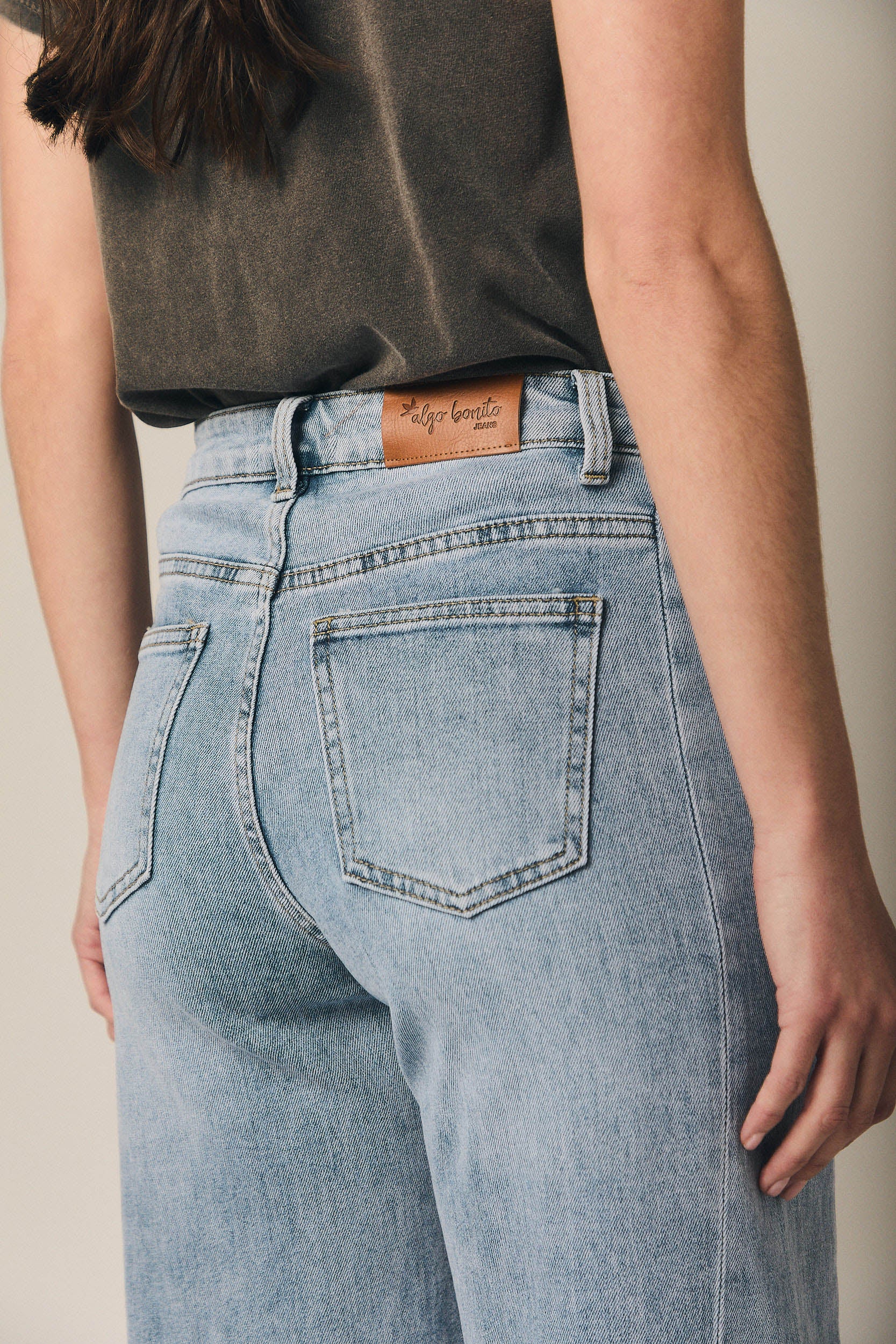 Jeans de tiro medio con pernera recta y ligera apertura en el bajo. Corte limpio desde la cadera, con cintura estructurada, cierre frontal y bolsillos clásicos. El lavado azul claro aporta un acabado actual y fácil de combinar, manteniendo una silueta equilibrada que estiliza sin marcar en exceso.