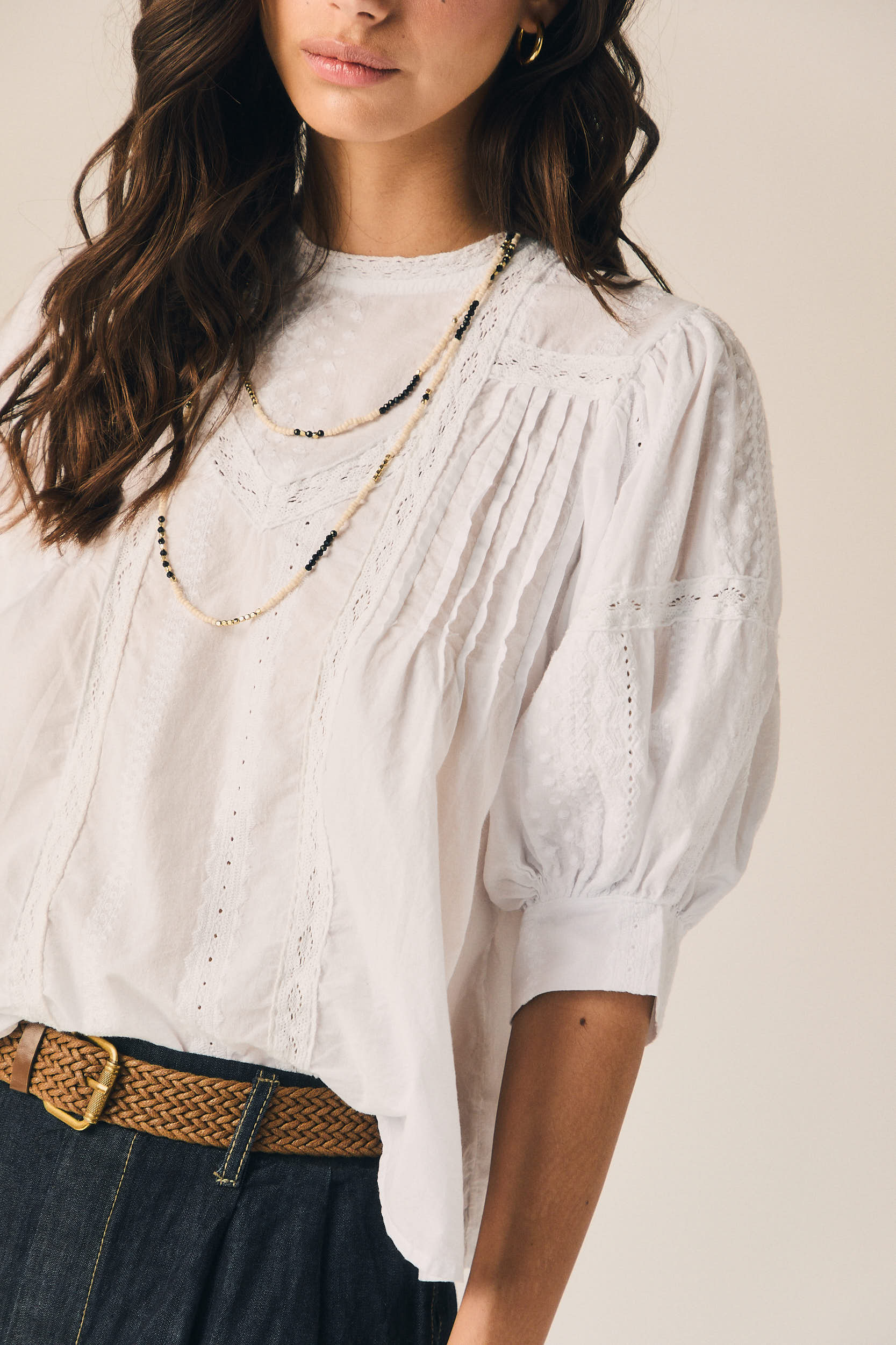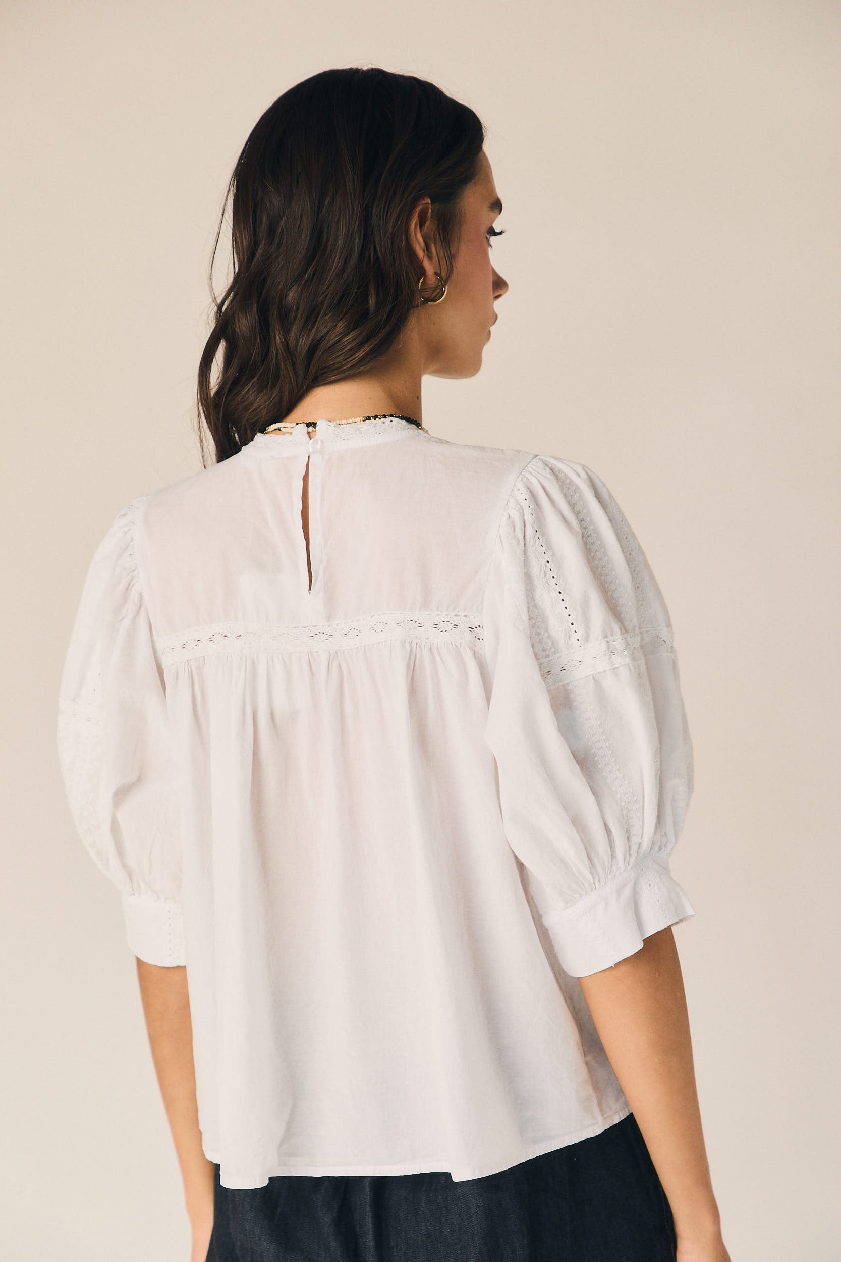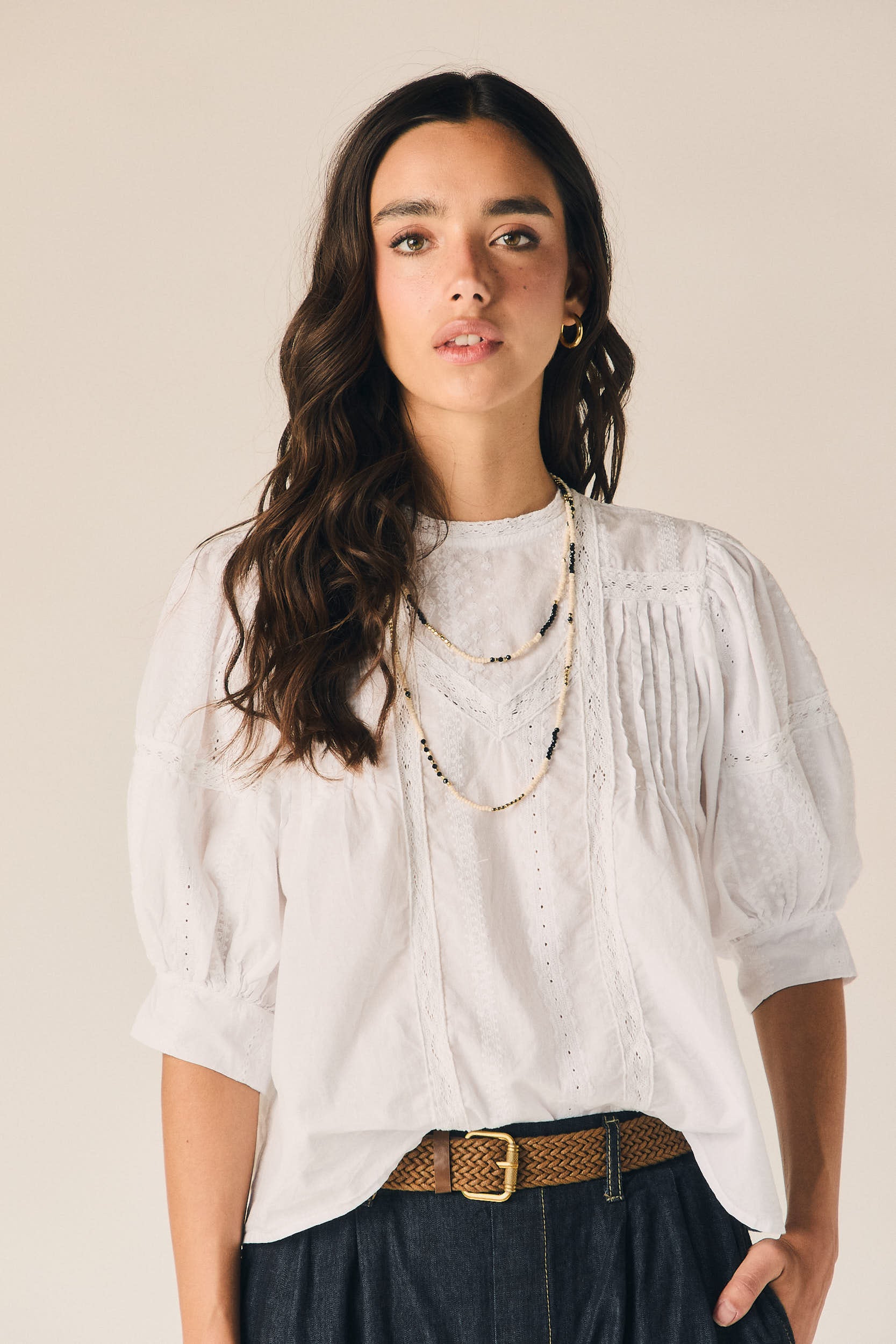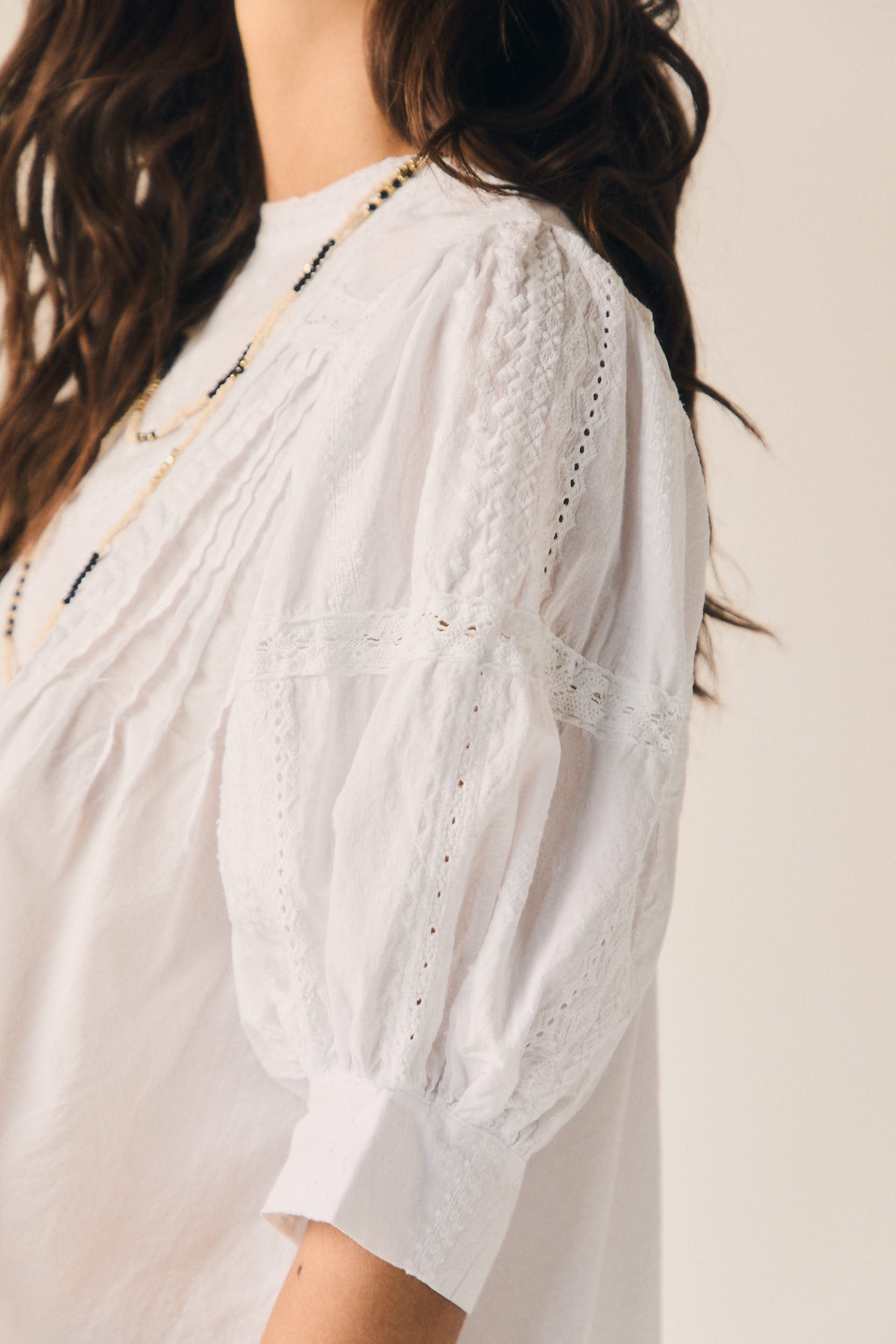 Blusa en tono blanco con diseño fluido y cuello redondo. Detalle de jaretas verticales en el frontal combinadas con paneles de encaje y bordados calados. Manga tres cuartos con volumen y puño ajustado.