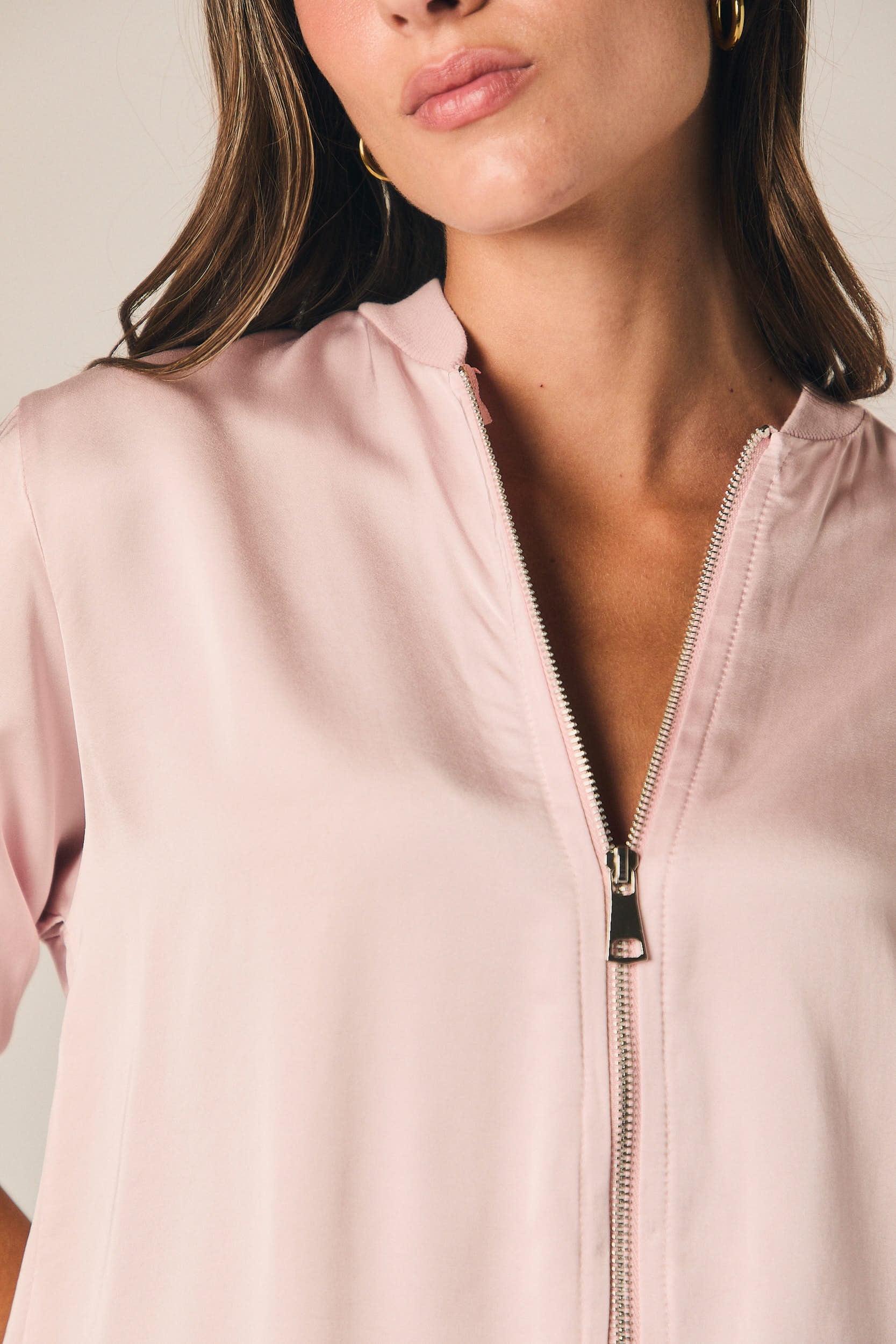 Chaqueta tipo bomber en tono rosa empolvado. Corte recto con bajo y puños elásticos, cuello redondo y cierre frontal con cremallera metálica. Manga 3/4 con ligero volumen y acabado ajustado en el puño.