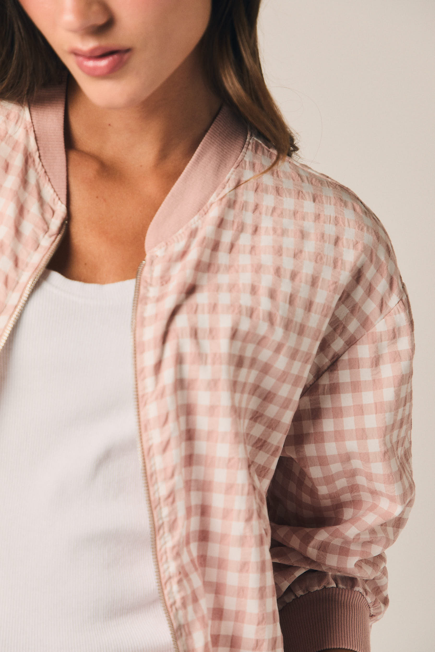 Bomber de corte corto con estampado vichy en tono rosa. Cuello, puños y bajo con acabado elástico. Cierre frontal con cremallera y ajuste en cintura mediante lazada. Bolsillos frontales discretos.