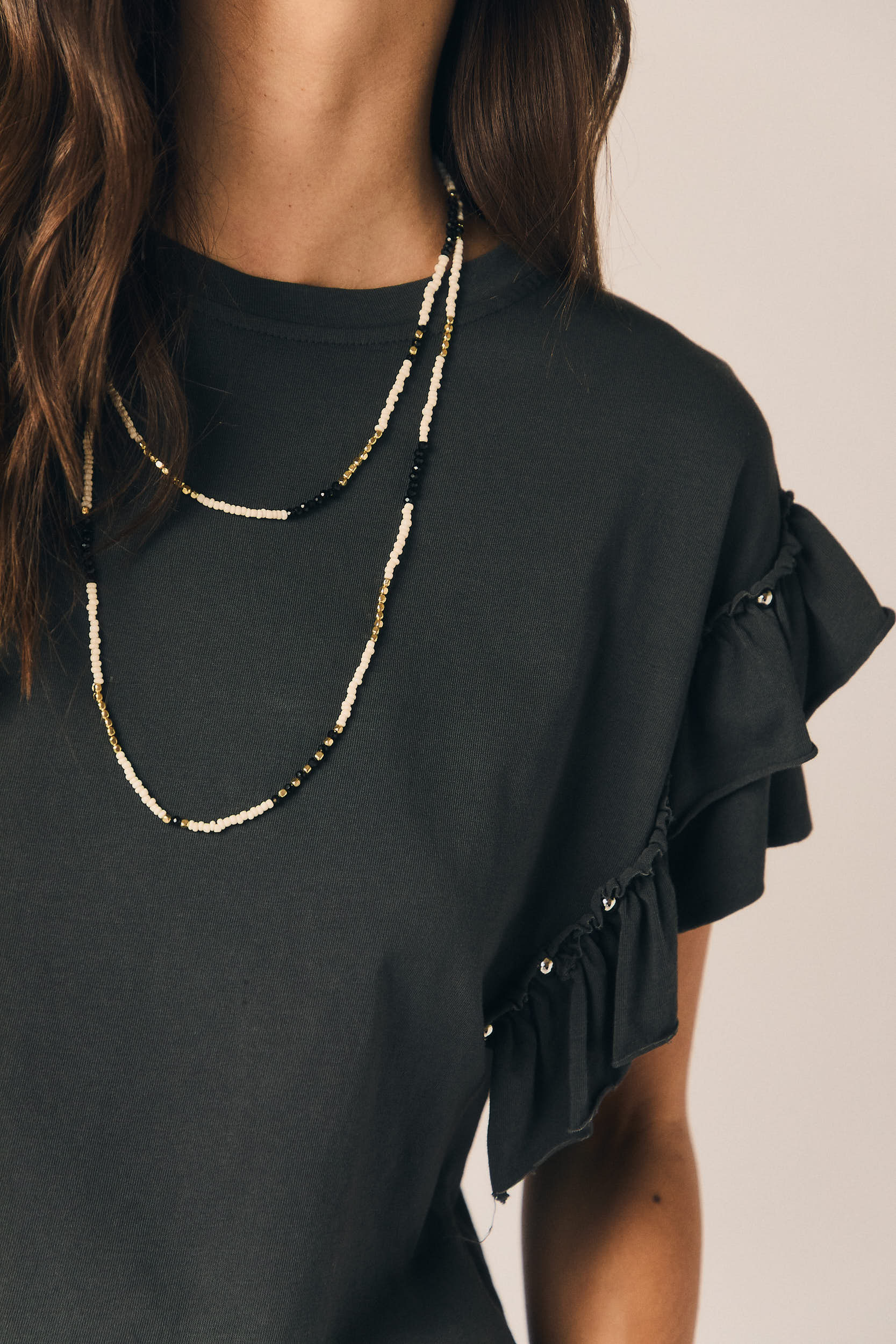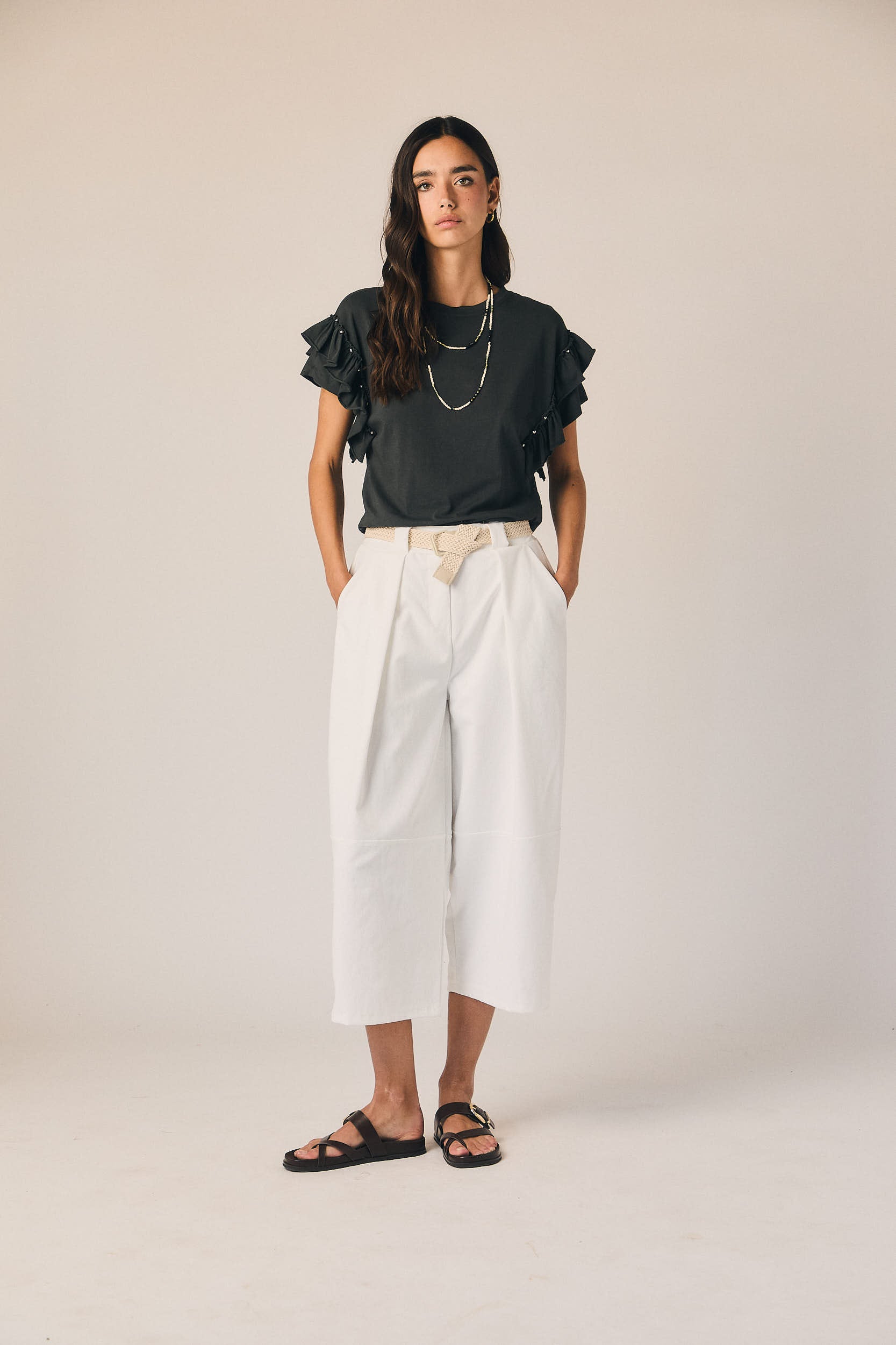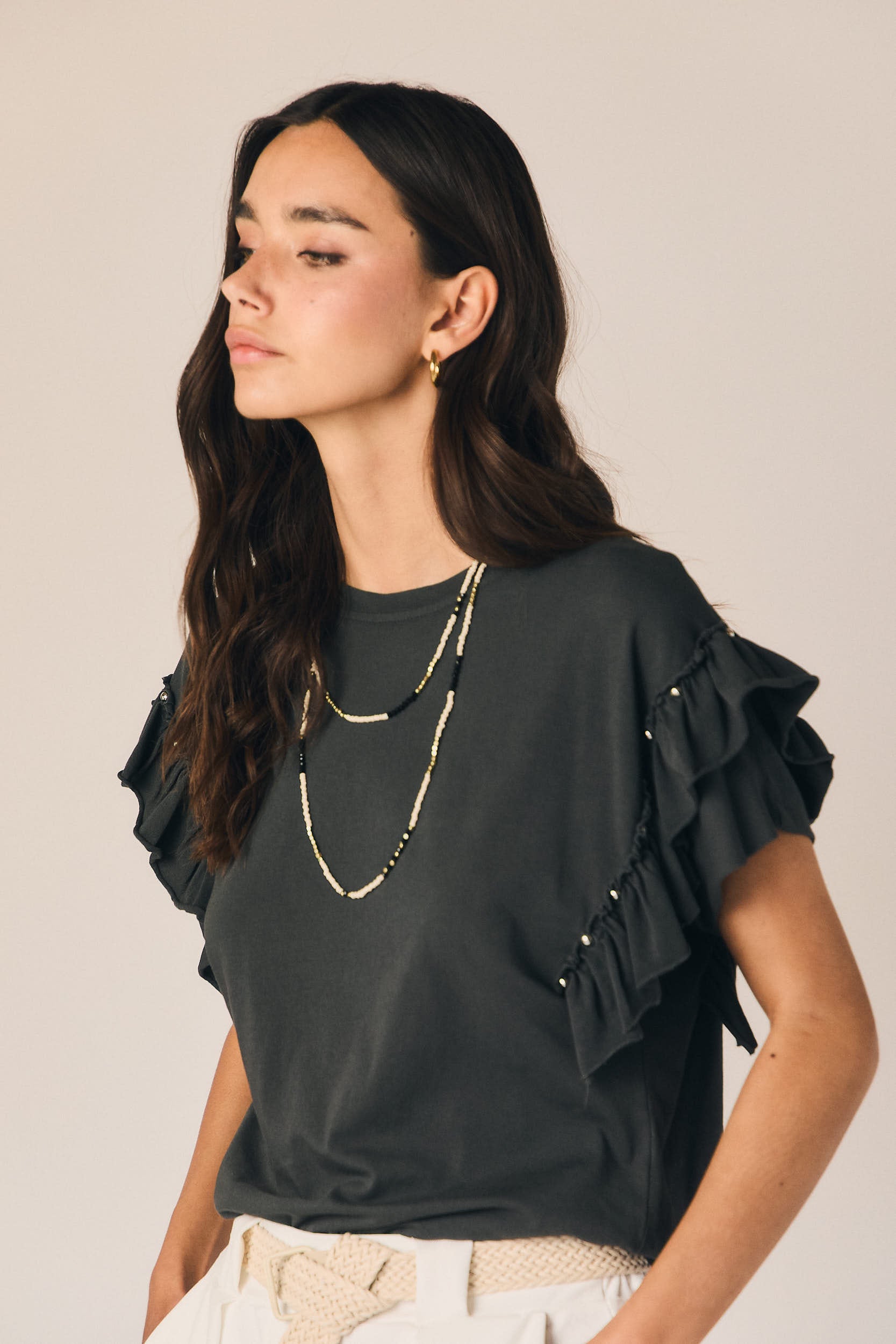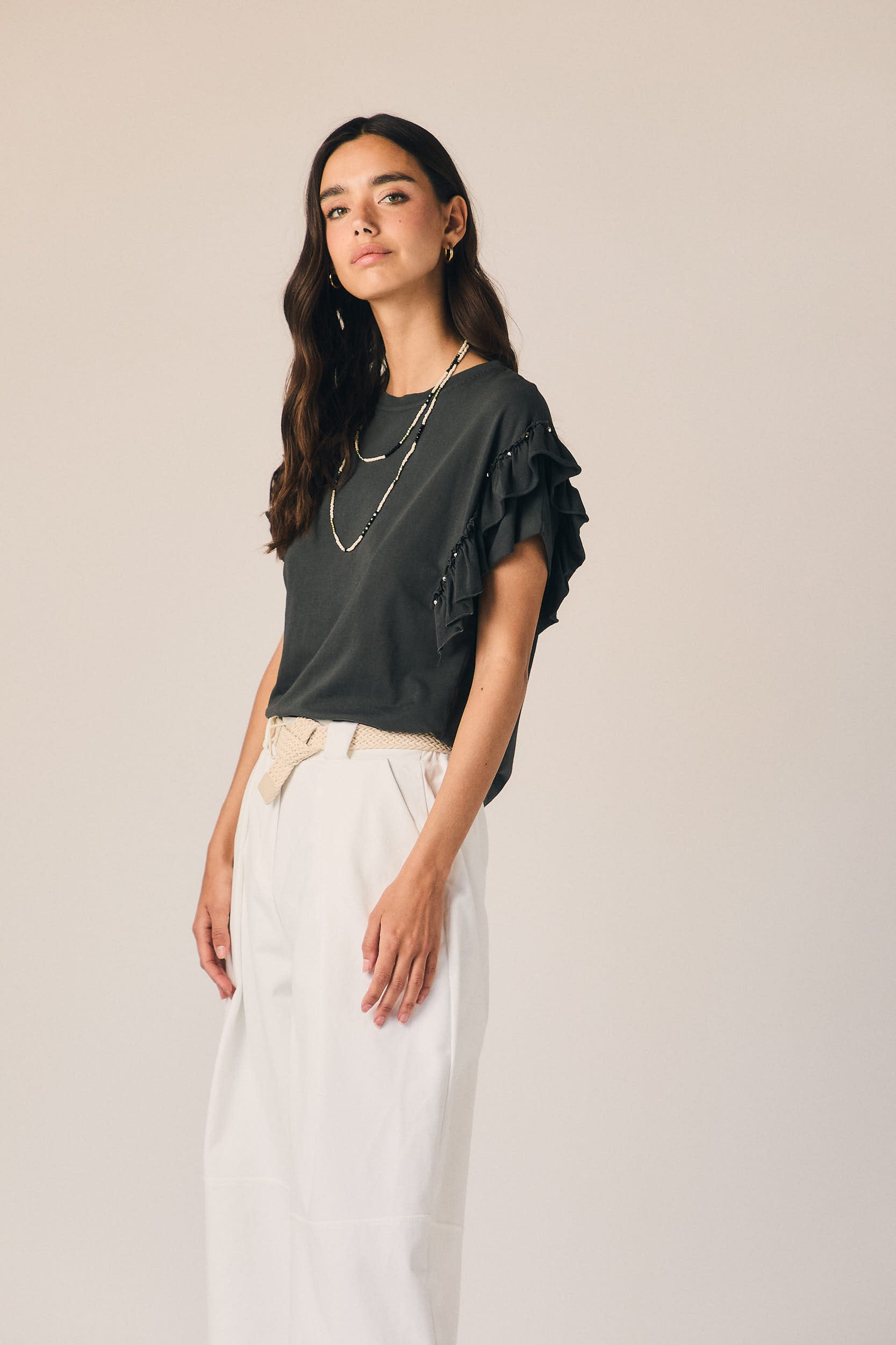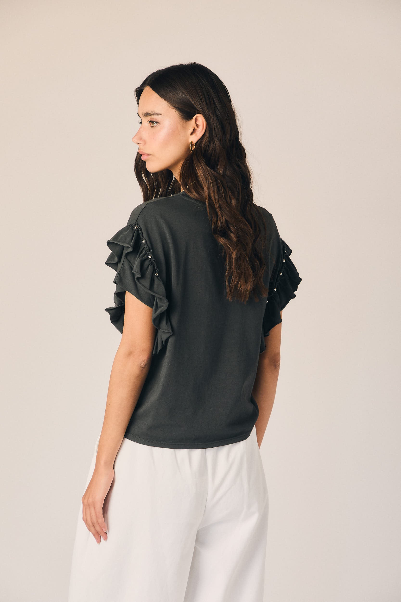 Camiseta en tono gris de corte recto y cuello redondo. Diseño de manga corta con volantes en los hombros, rematados con pequeñas tachas metálicas que aportan detalle. Acabado fluido y ligero, con caída suave sobre el cuerpo.