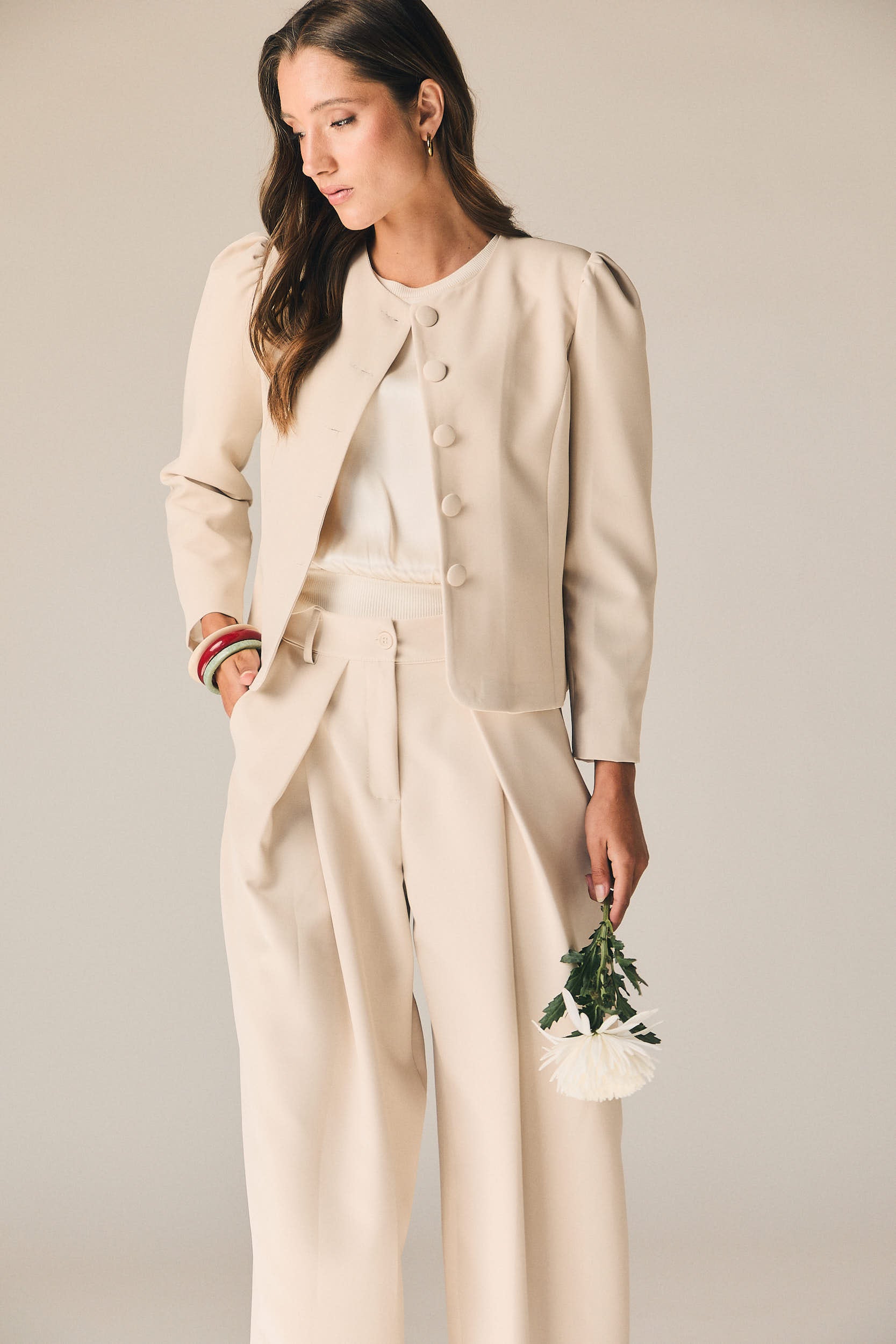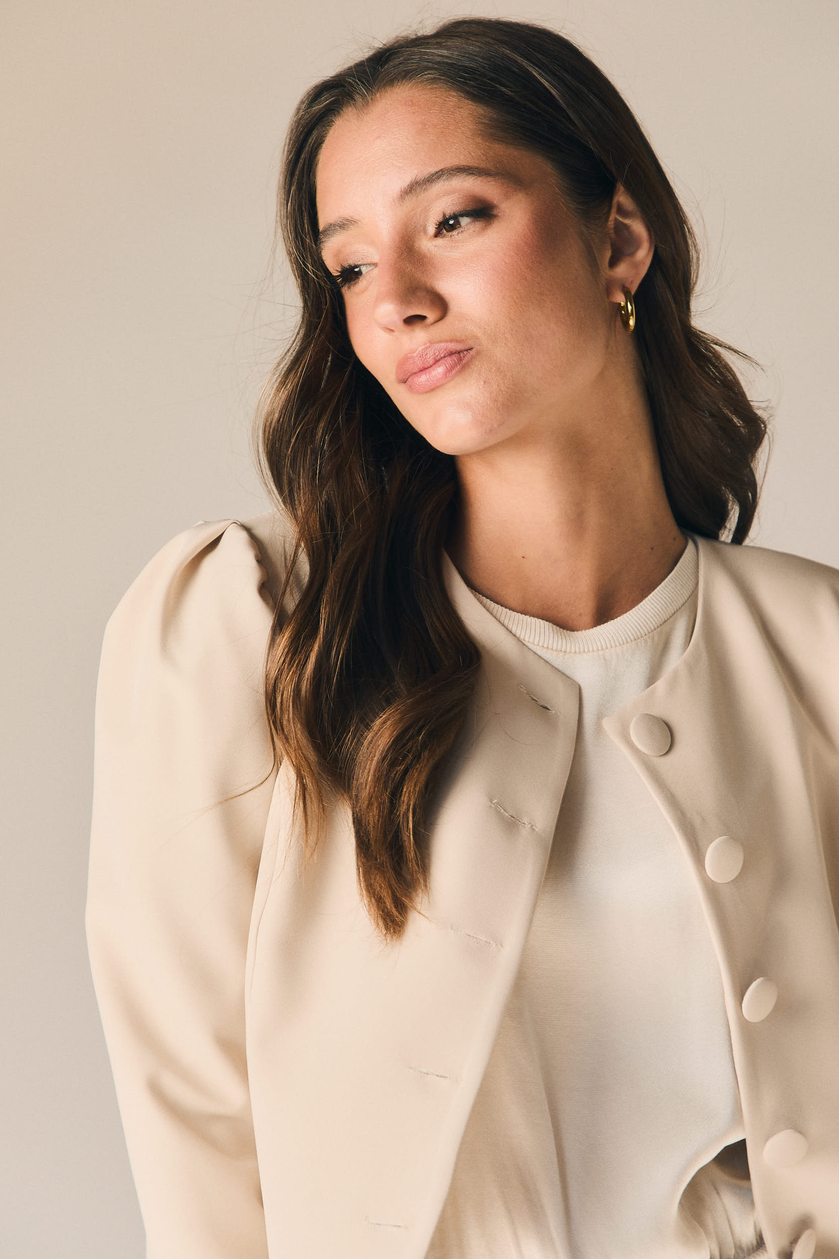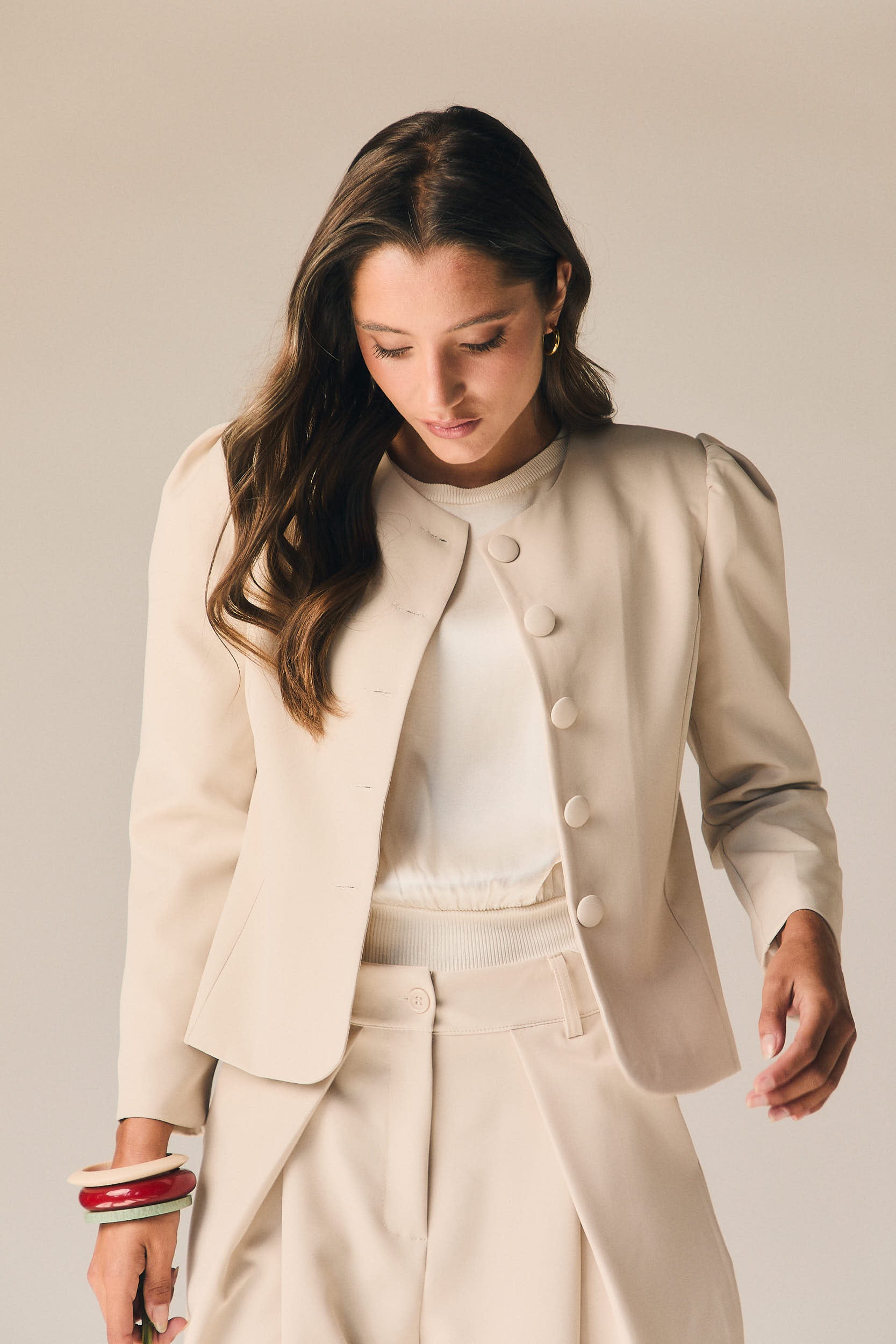 Chaqueta de vestir en tono beige con diseño estructurado y líneas limpias que aportan un aire elegante y contemporáneo. Presenta cuello redondo y cierre frontal con botones forrados, creando un acabado pulido y sofisticado. Las mangas largas con ligero volumen en el hombro añaden un toque actual sin perder la esencia clásica.