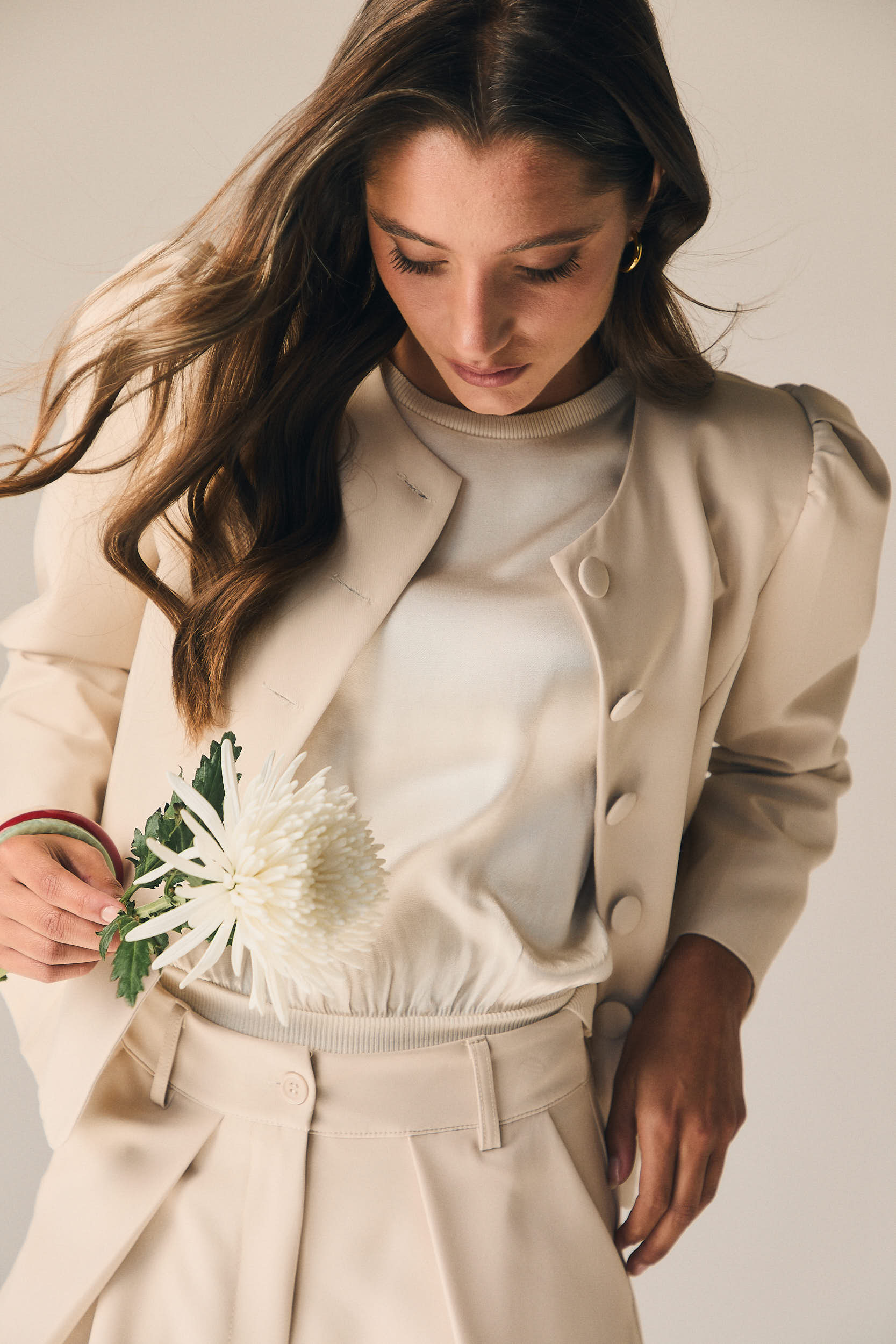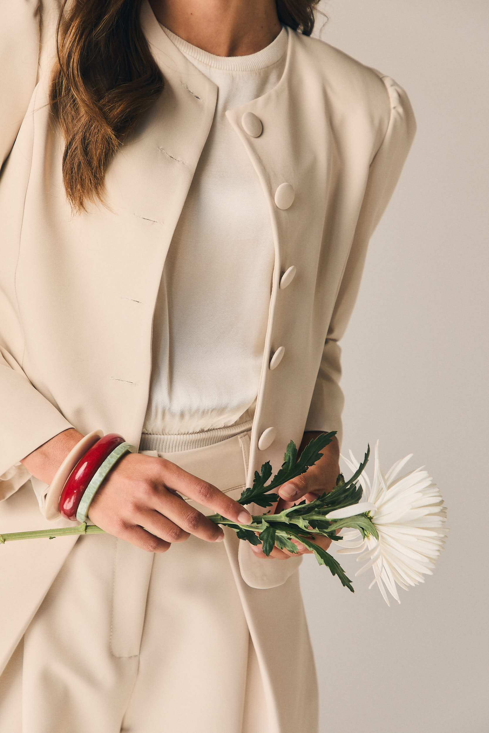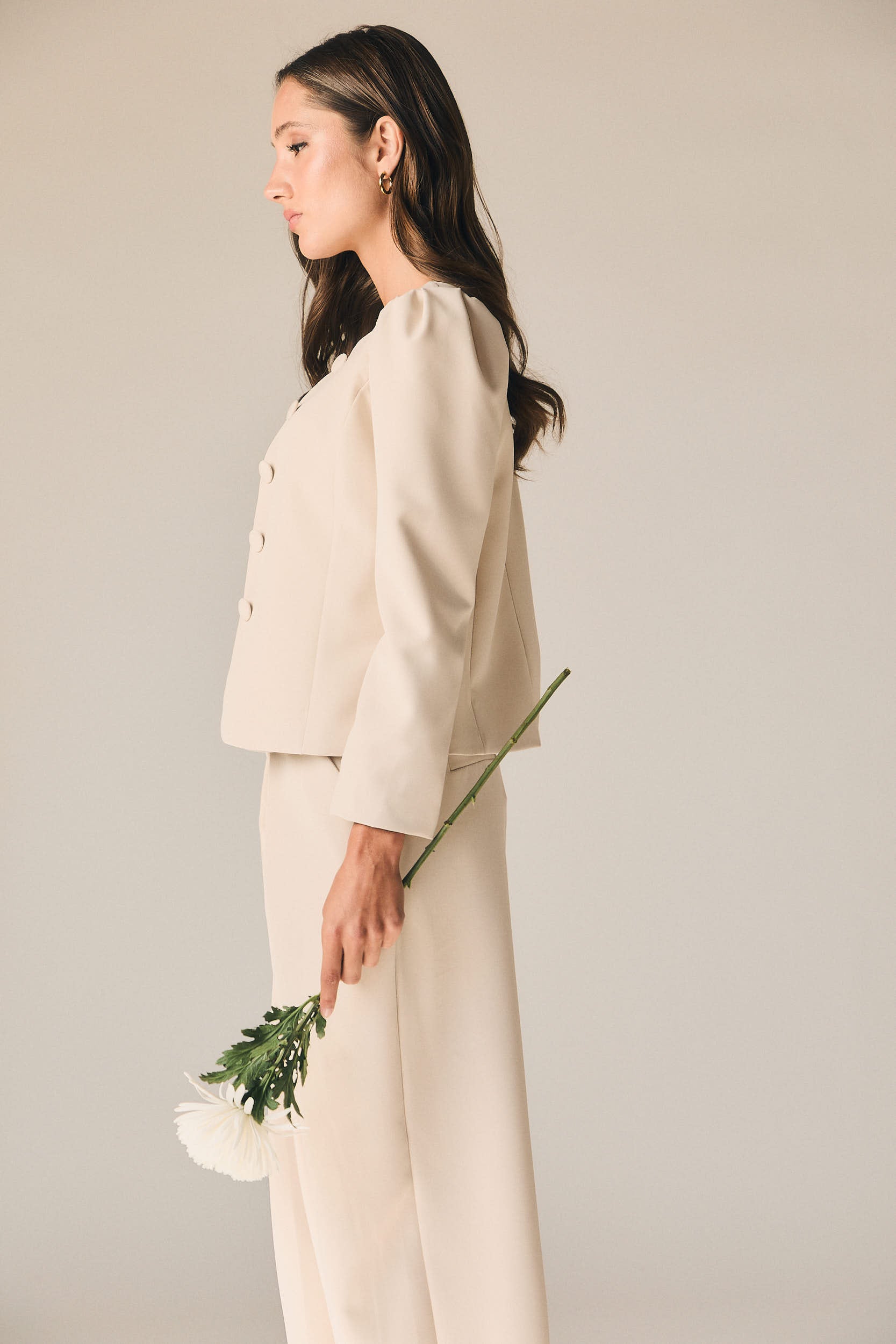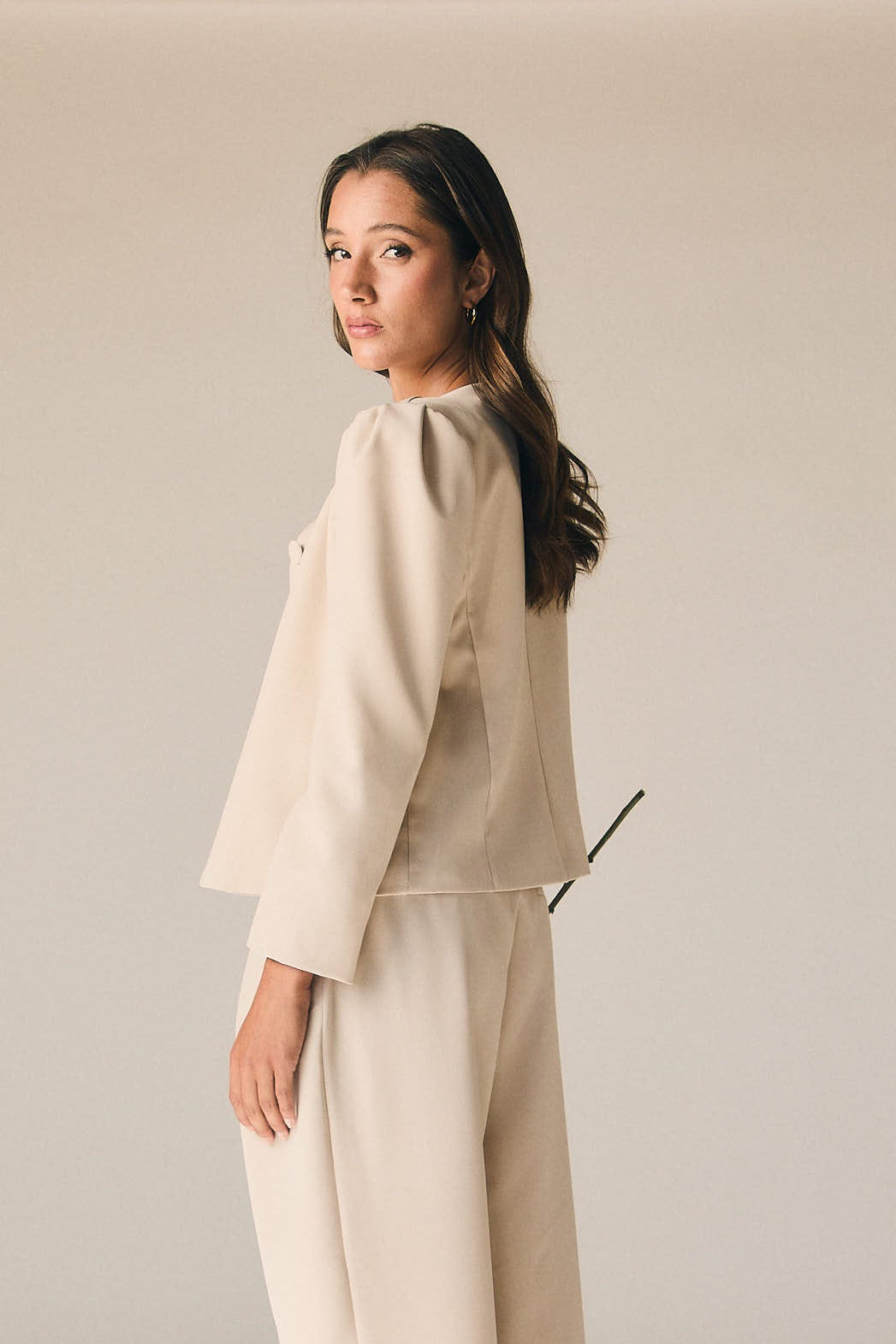 Chaqueta de vestir en tono beige con diseño estructurado y líneas limpias que aportan un aire elegante y contemporáneo. Presenta cuello redondo y cierre frontal con botones forrados, creando un acabado pulido y sofisticado. Las mangas largas con ligero volumen en el hombro añaden un toque actual sin perder la esencia clásica.