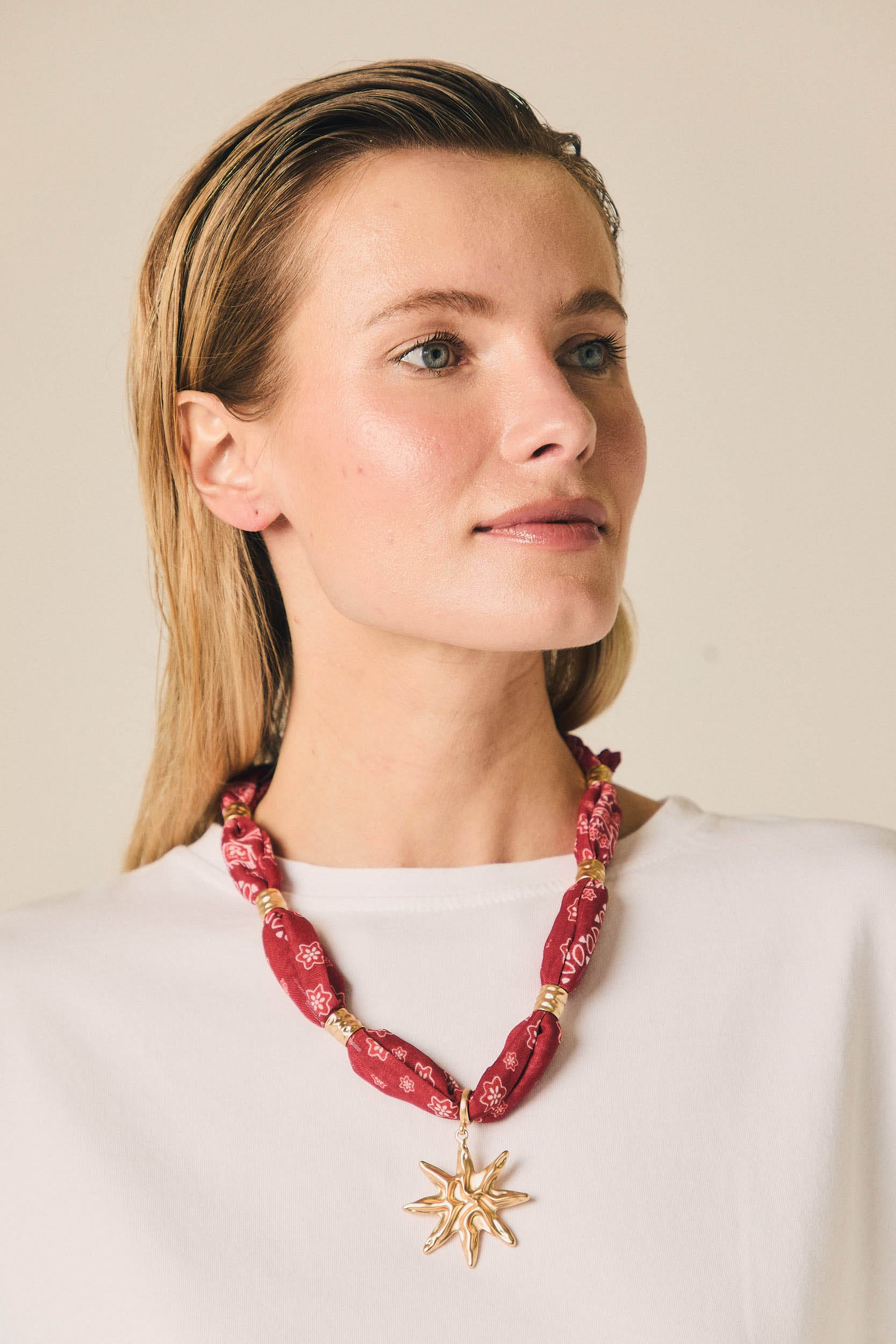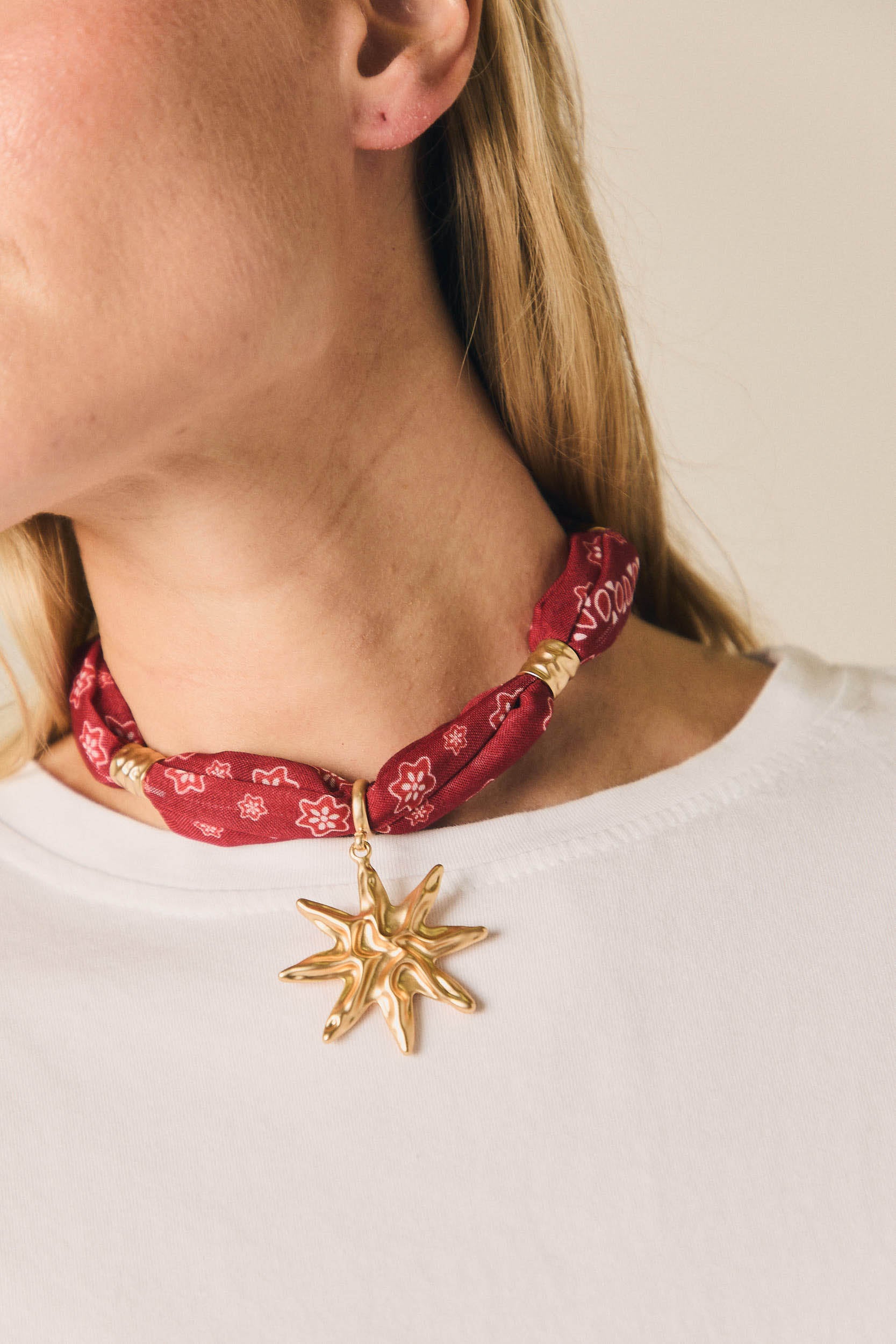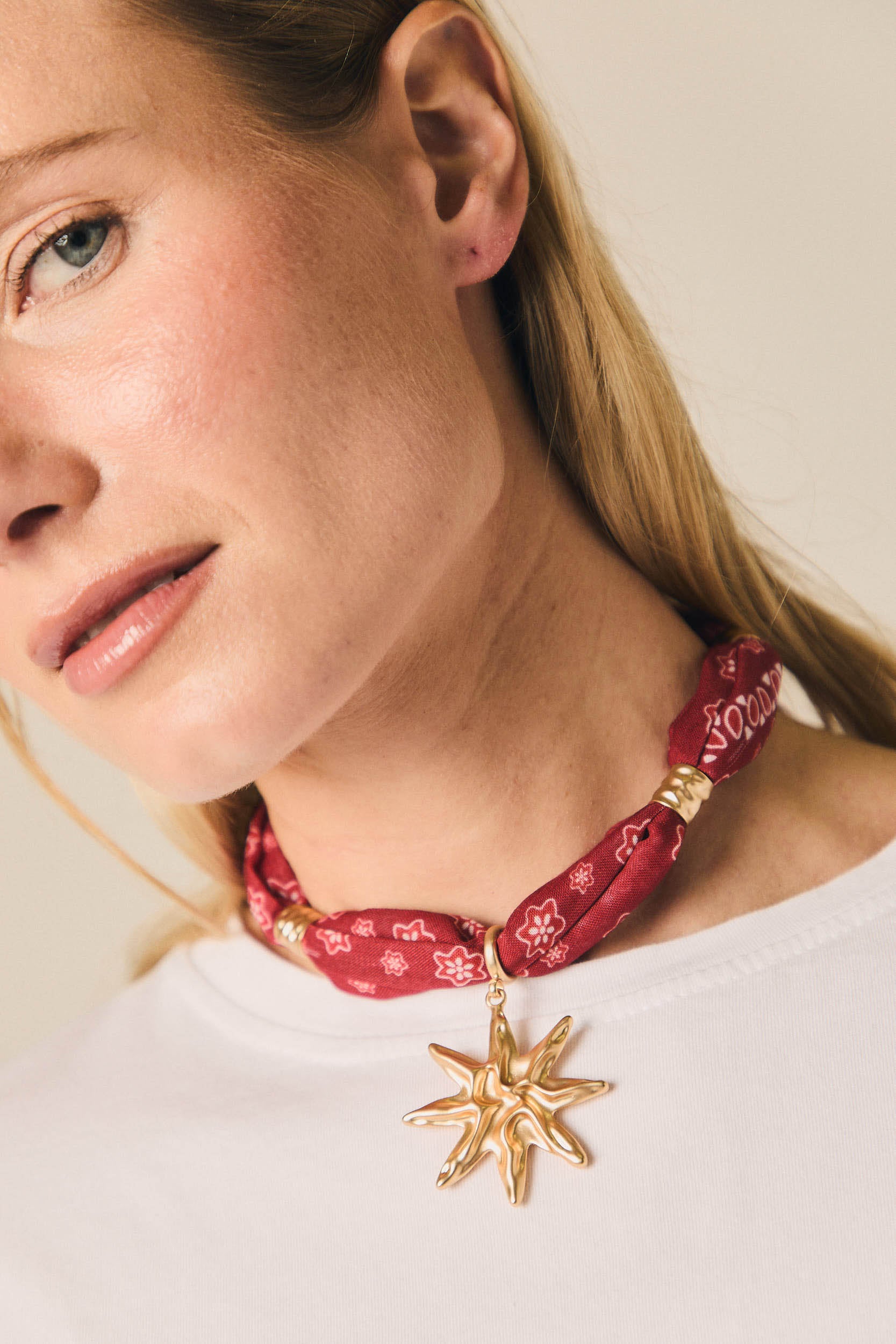 Collar tipo pañuelo en tono rojo con estampado, anudado al cuello y combinado con piezas metálicas doradas. Diseño corto con colgante central en forma de estrella que aporta protagonismo. Acabado suave y ligero, pensado para ajustarse cómodamente.