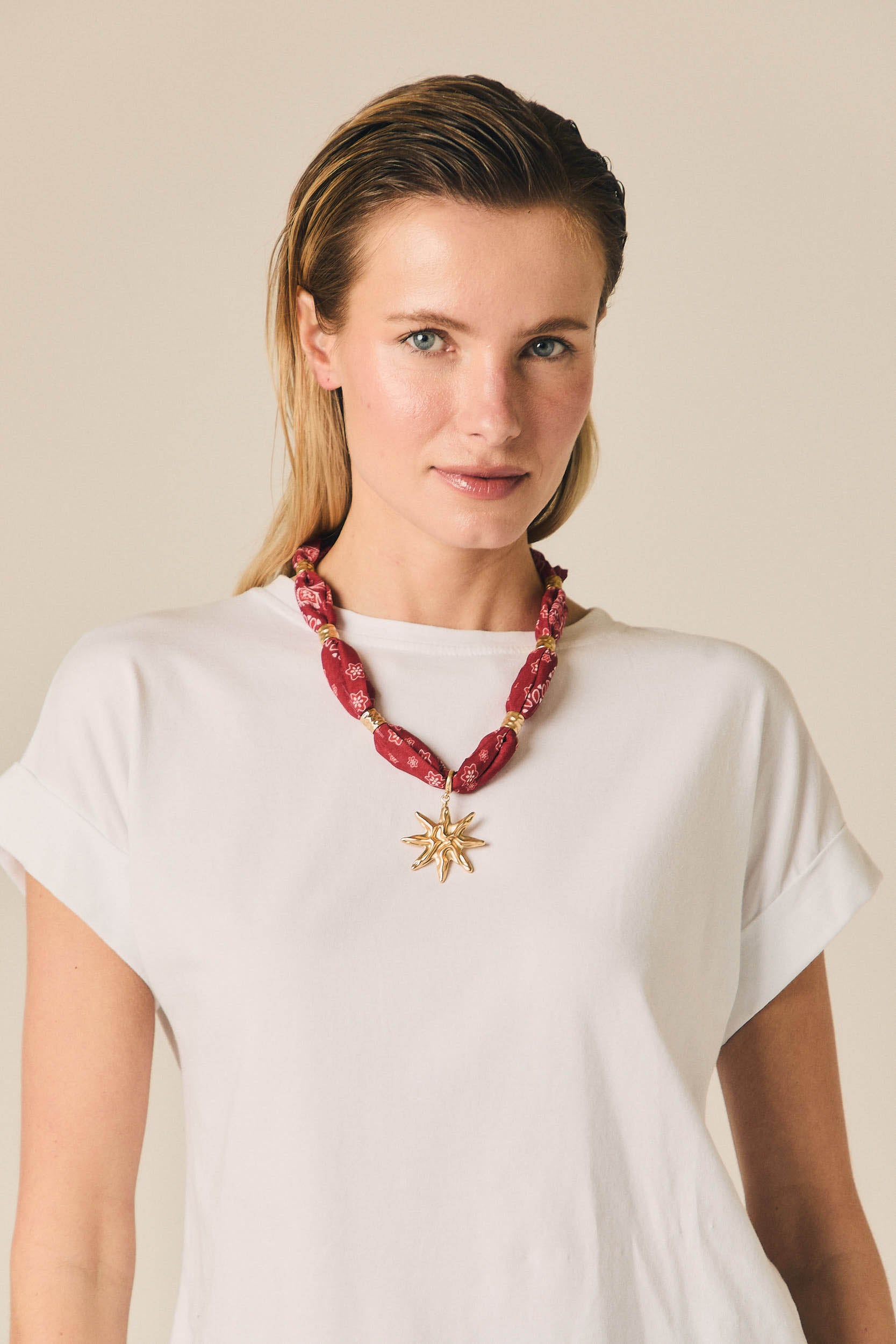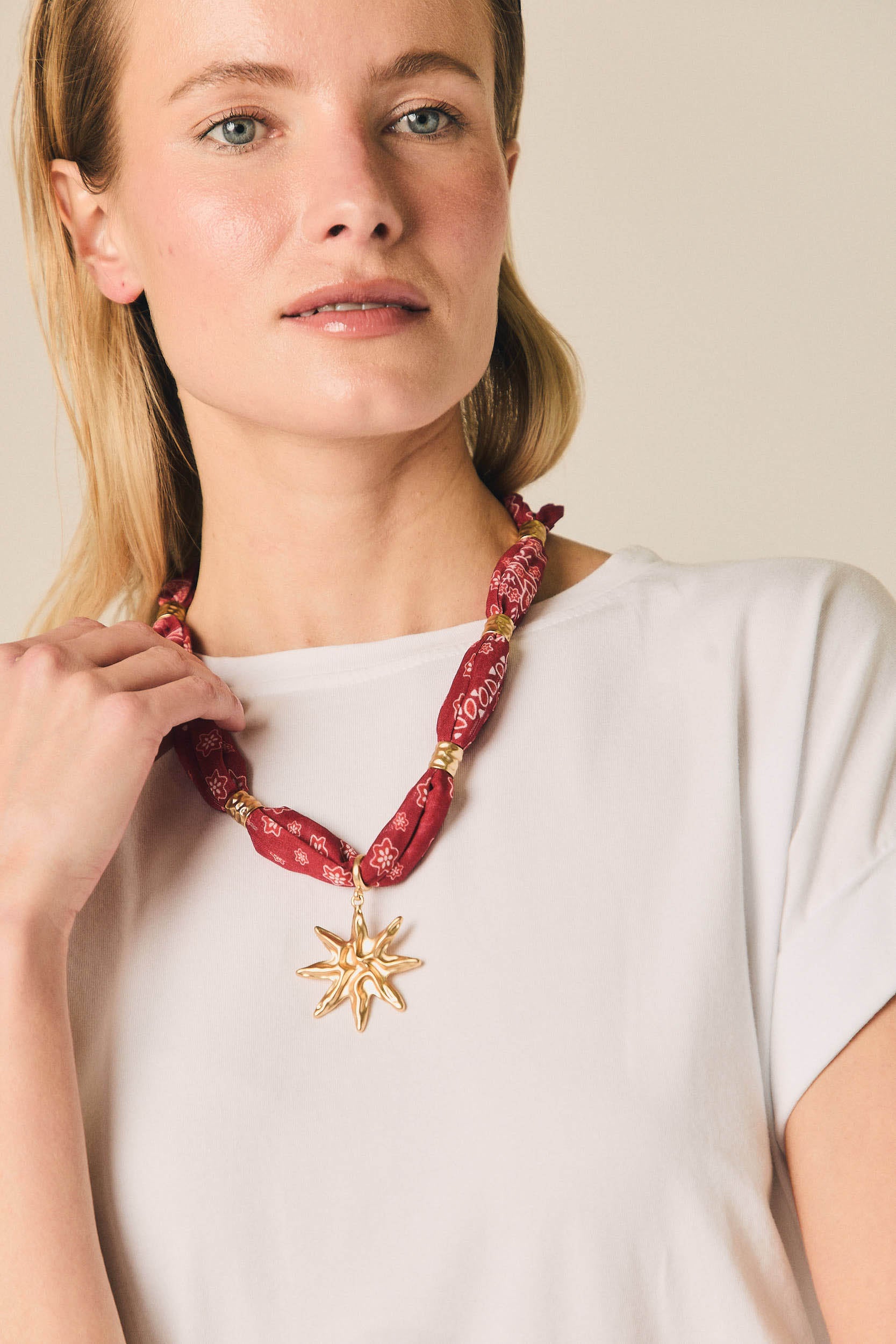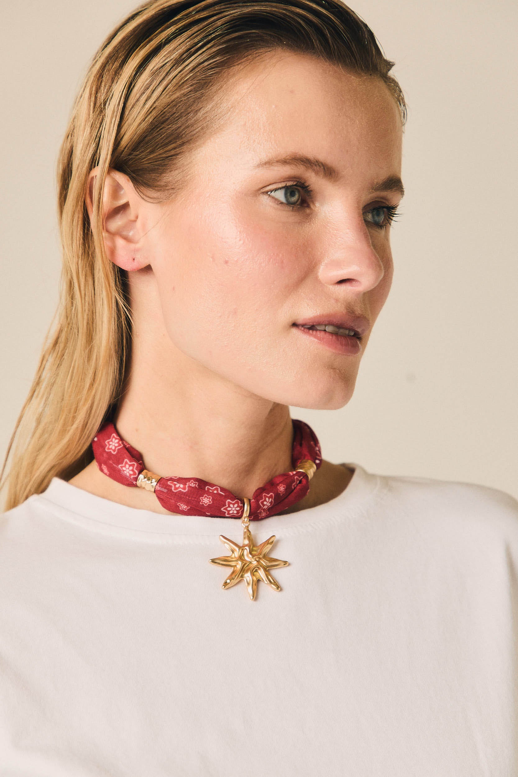 Collar tipo pañuelo en tono rojo con estampado, anudado al cuello y combinado con piezas metálicas doradas. Diseño corto con colgante central en forma de estrella que aporta protagonismo. Acabado suave y ligero, pensado para ajustarse cómodamente.