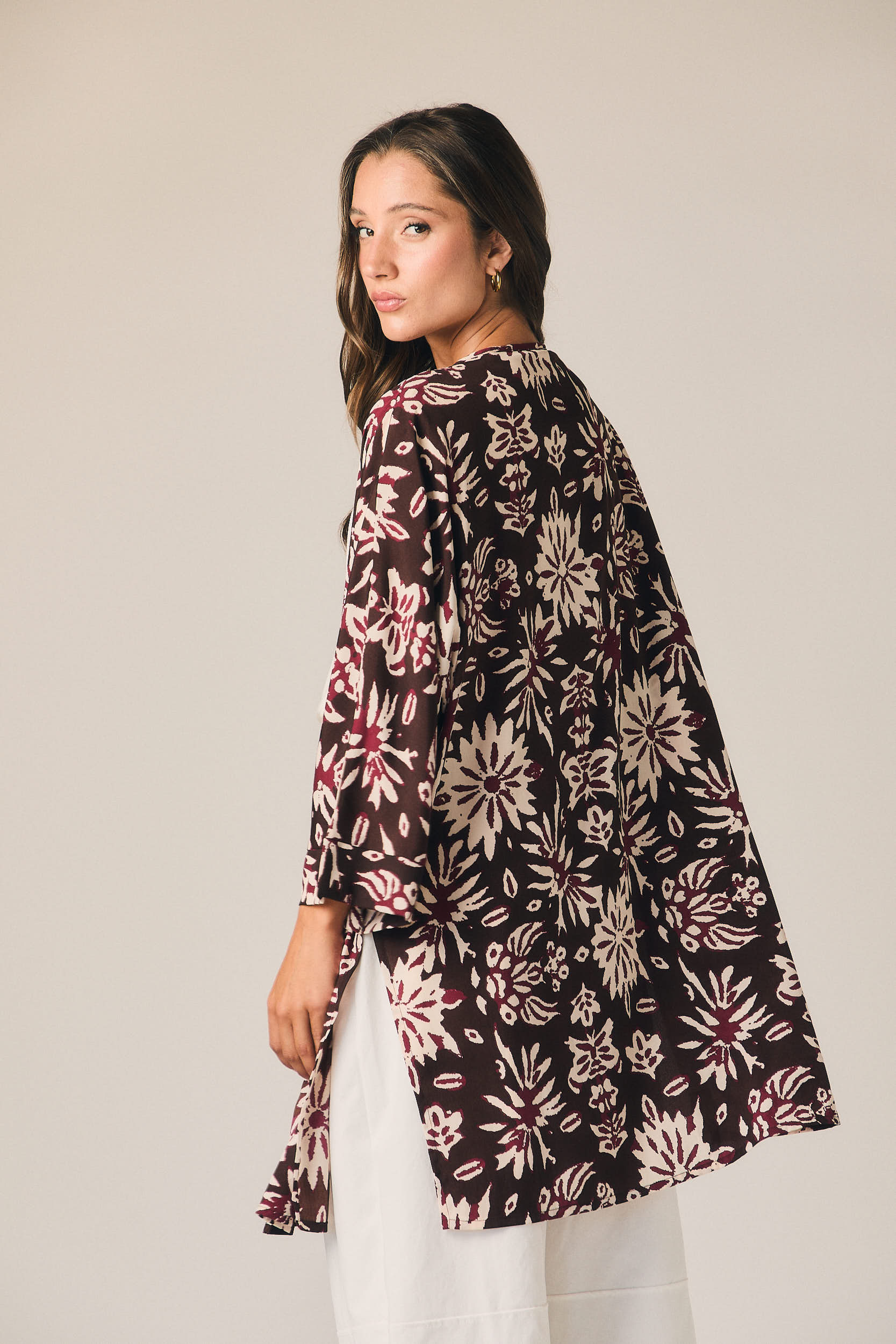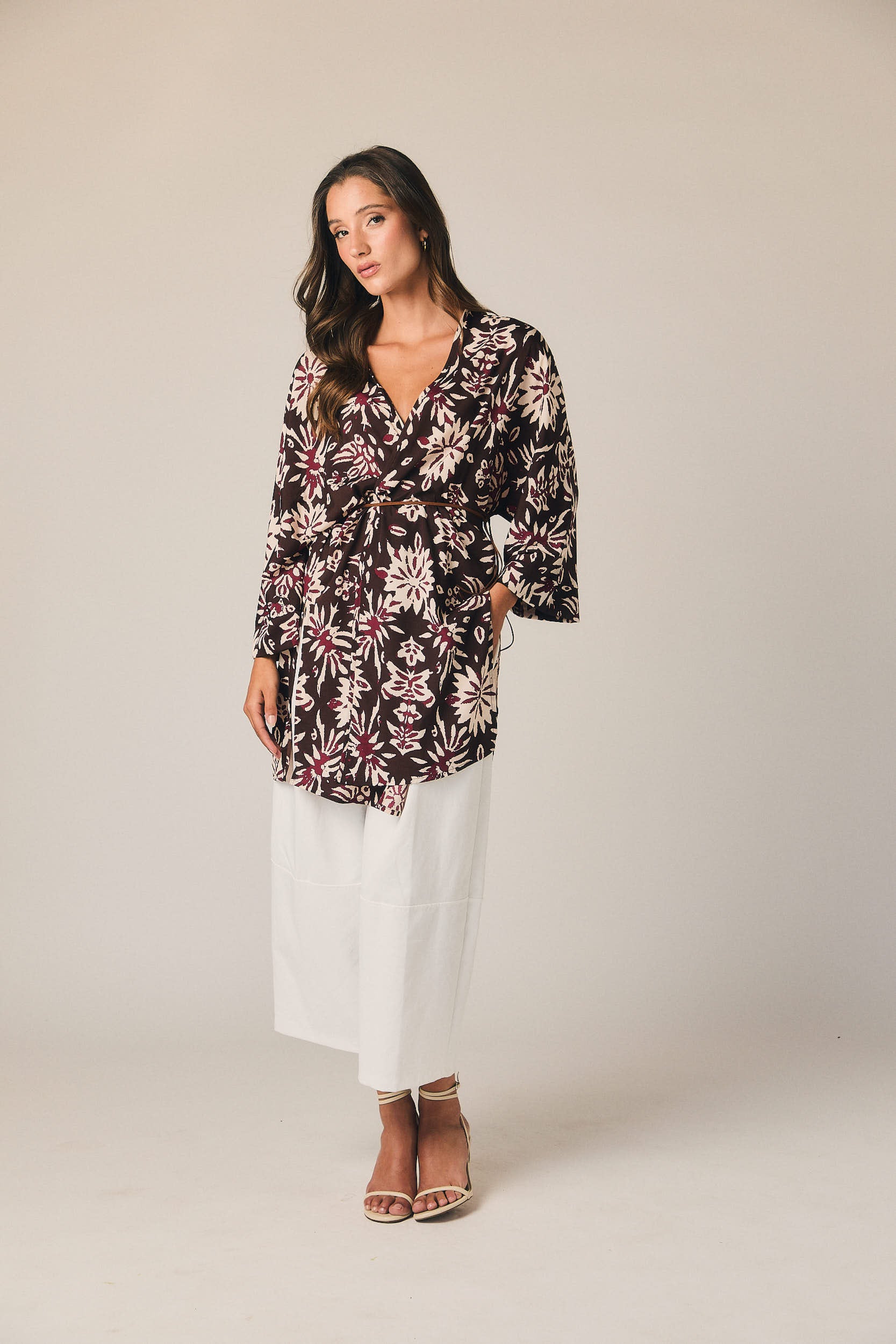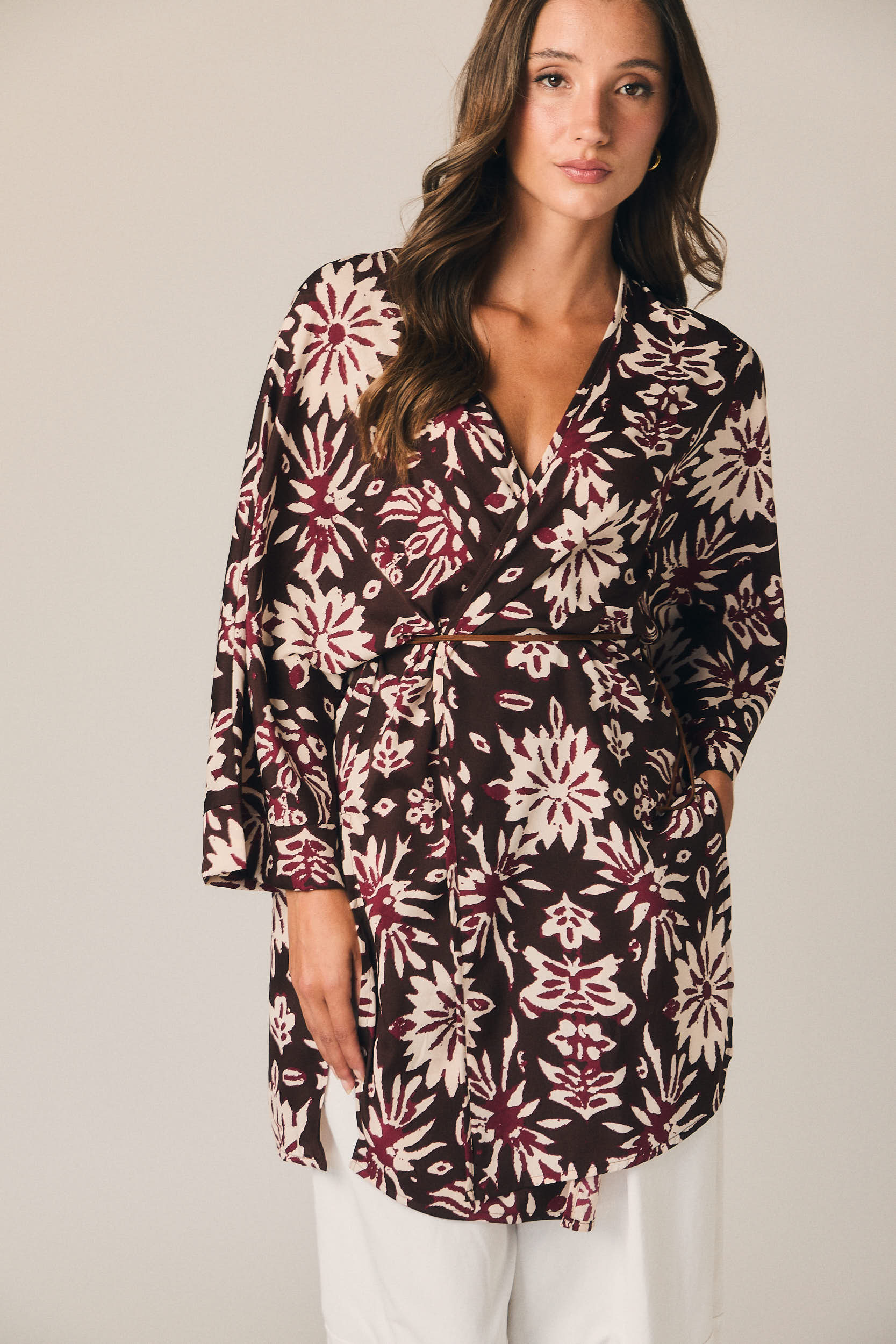 Kimono largo de corte recto y silueta fluida. Diseño abierto con escote en pico cruzado y manga amplia tres cuartos. Incluye cinturón fino para ajustar a la cintura. Estampado floral en contraste sobre fondo marrón con detalles en tonos burdeos y crudo.