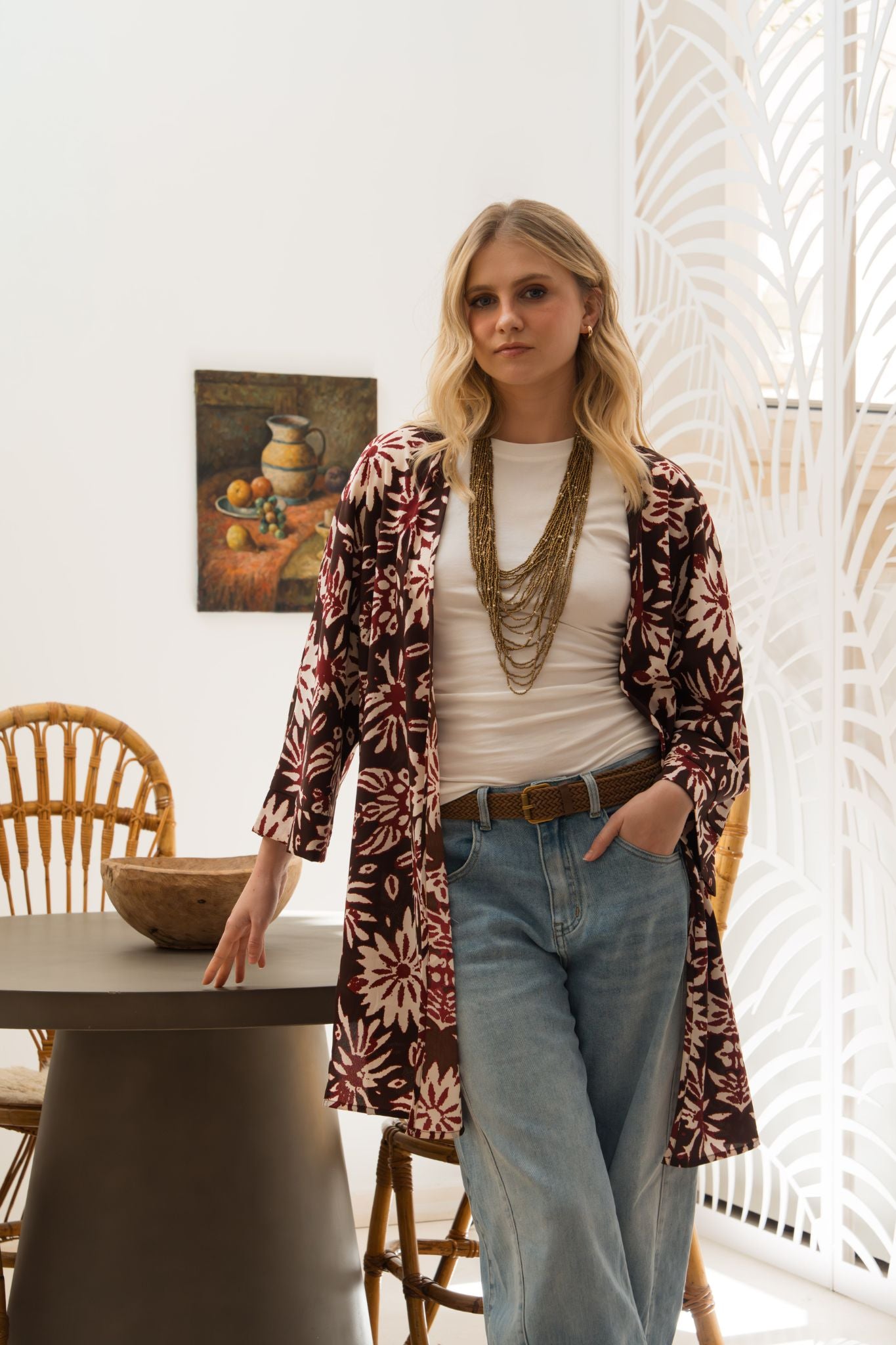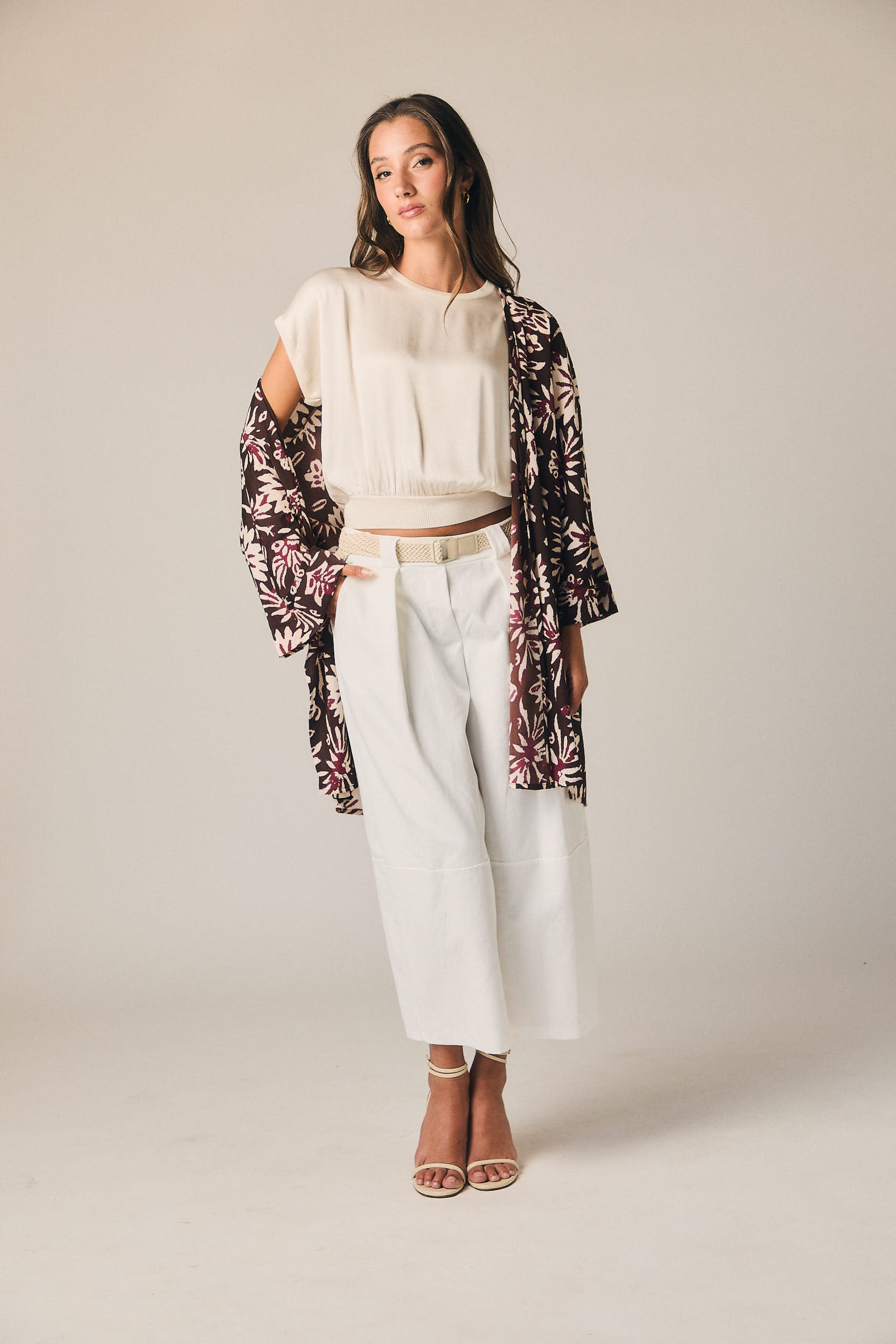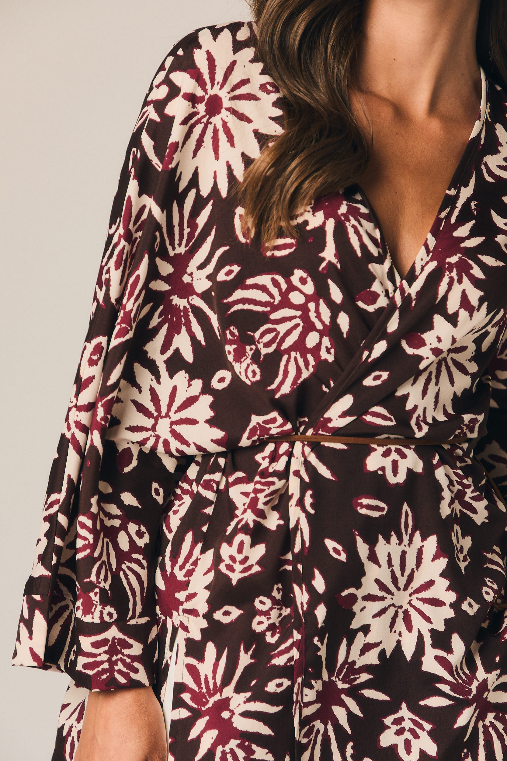 Kimono largo de corte recto y silueta fluida. Diseño abierto con escote en pico cruzado y manga amplia tres cuartos. Incluye cinturón fino para ajustar a la cintura. Estampado floral en contraste sobre fondo marrón con detalles en tonos burdeos y crudo.