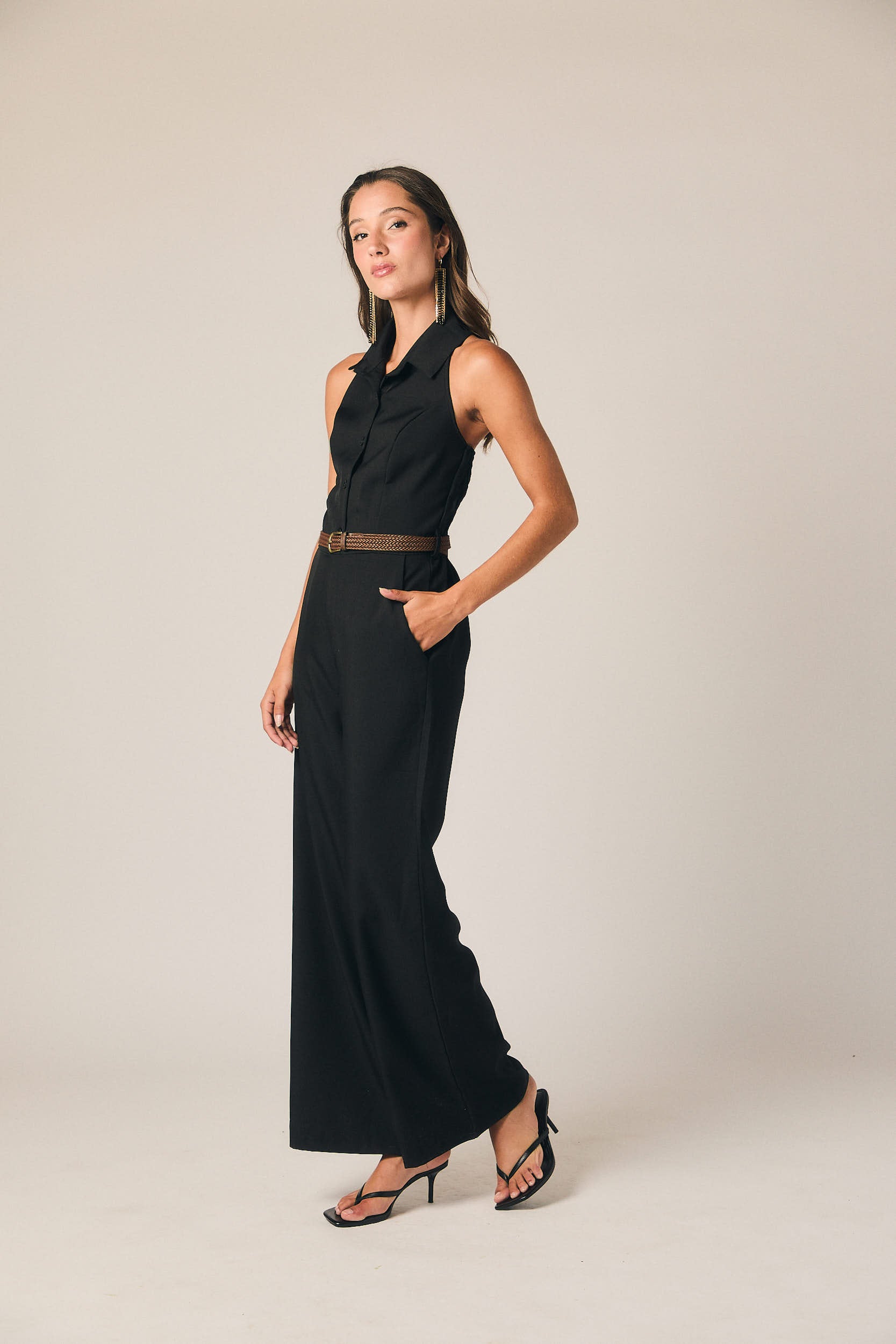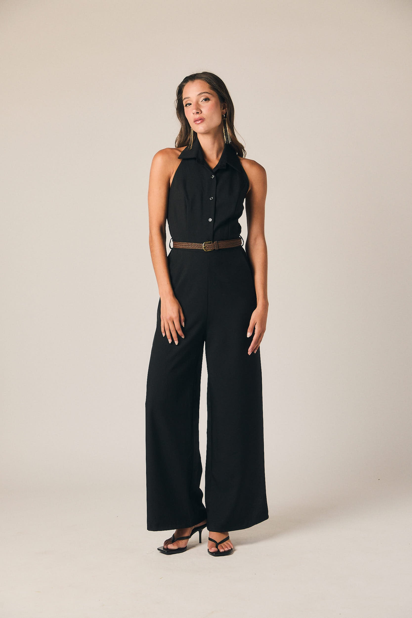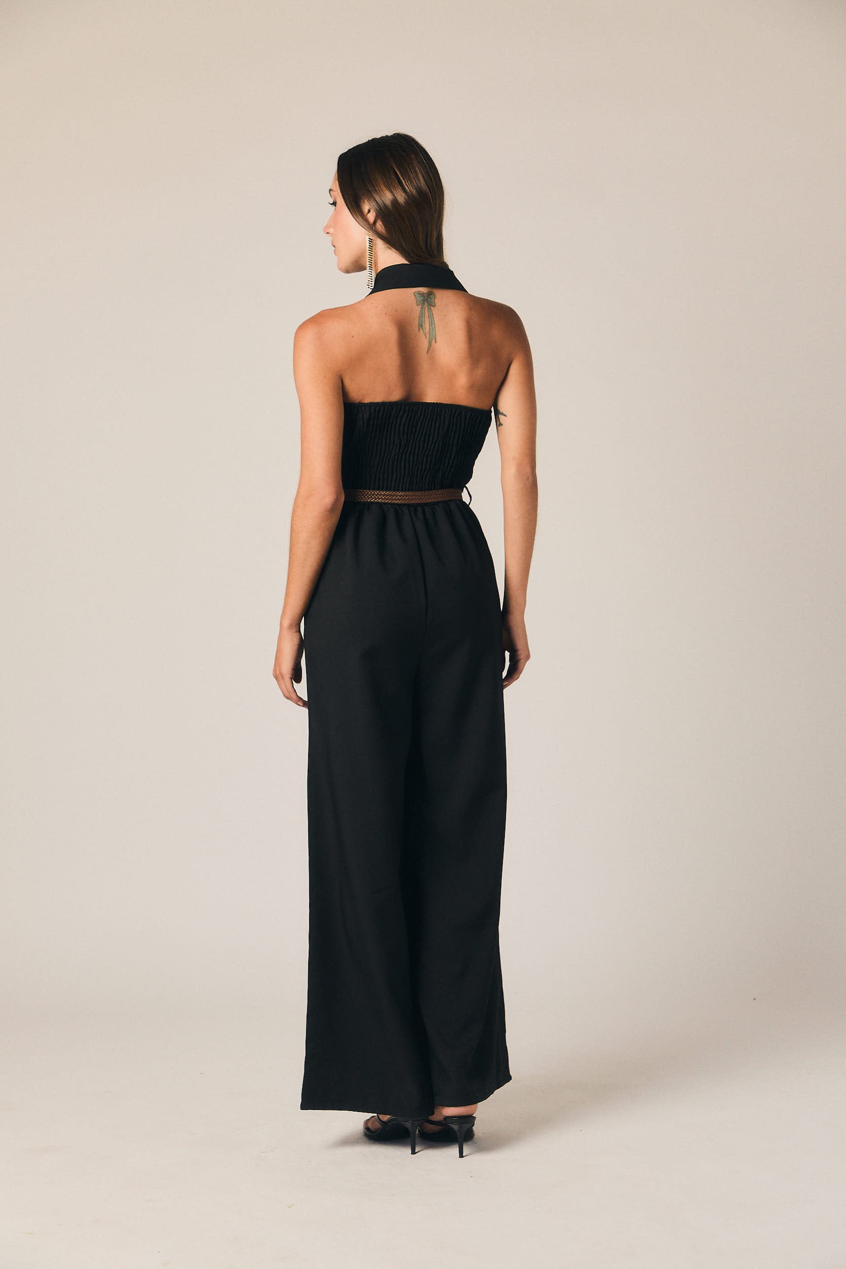 Mono largo en color negro con cuello halter y cuello camisero. Cierre frontal de botones y corte recto con pierna ancha. Espalda descubierta con panel fruncido elástico que se adapta al cuerpo y aporta comodidad.