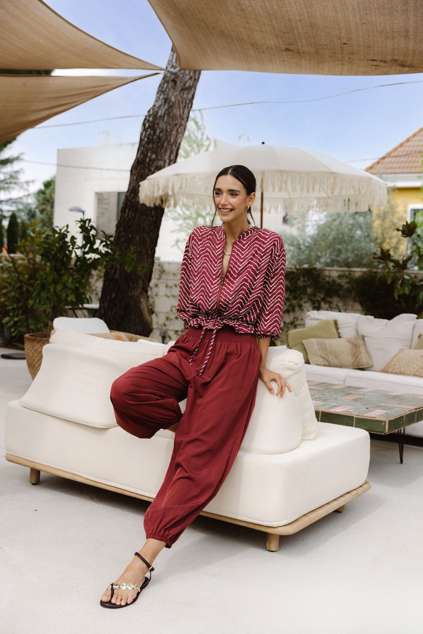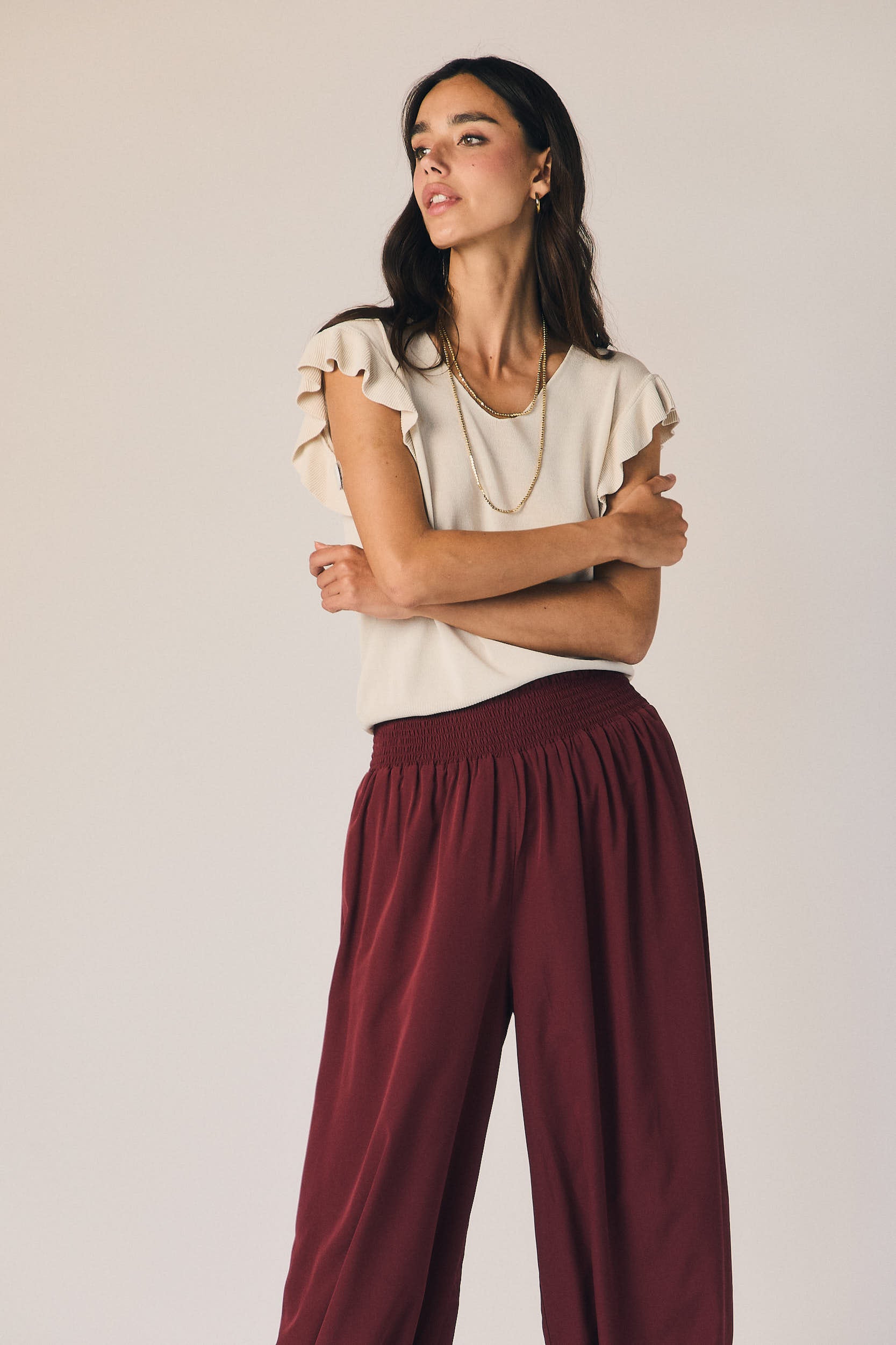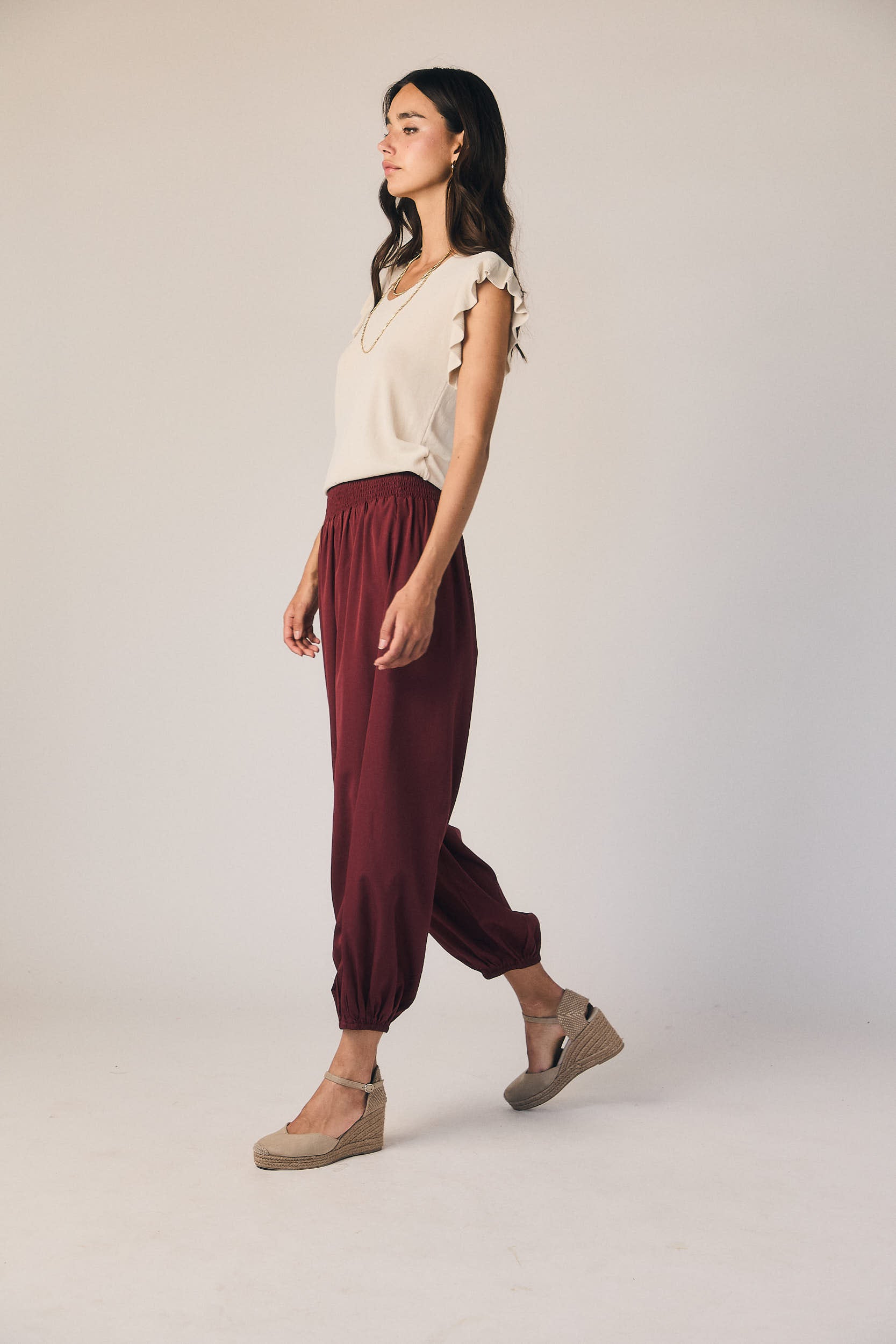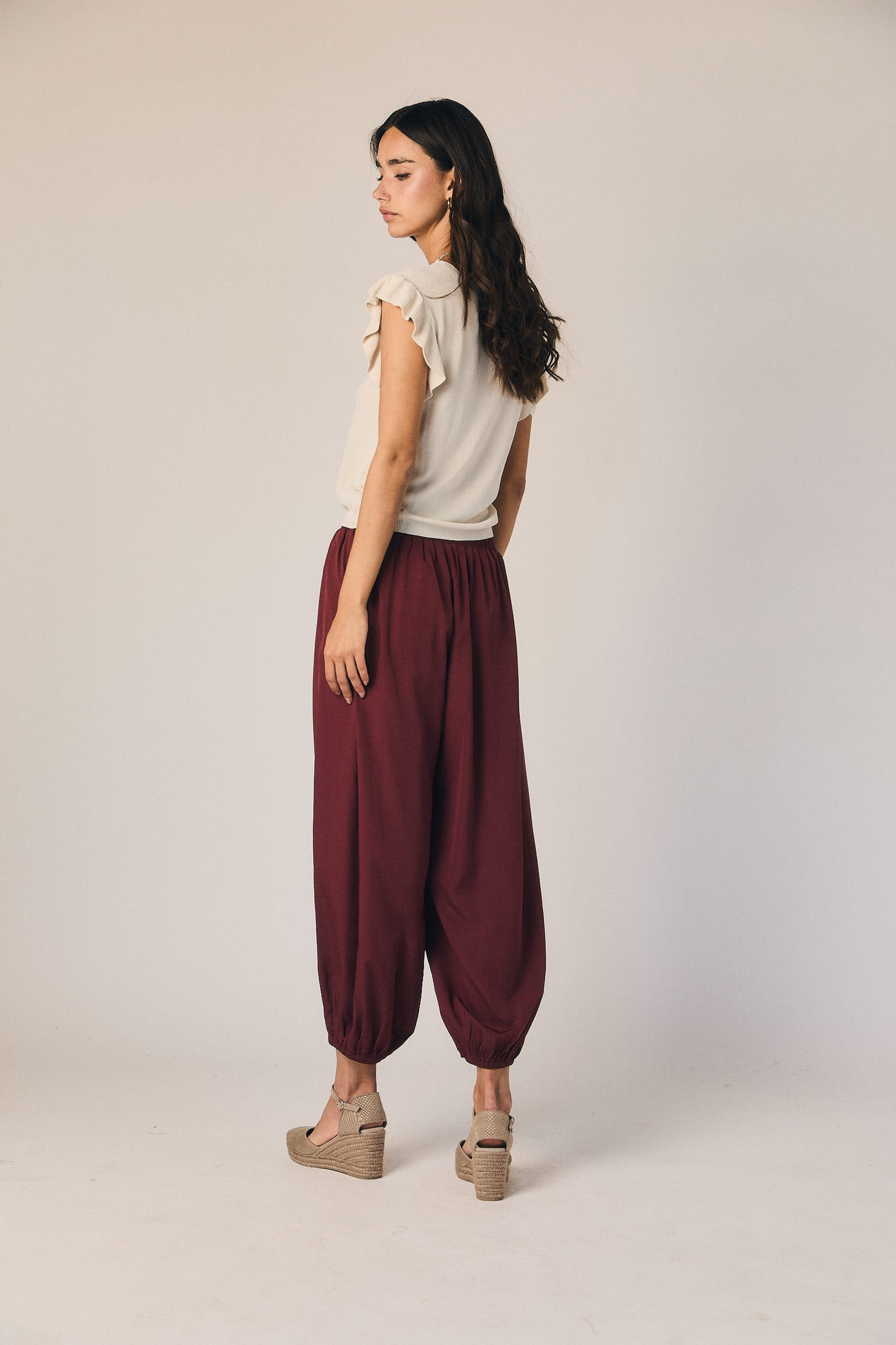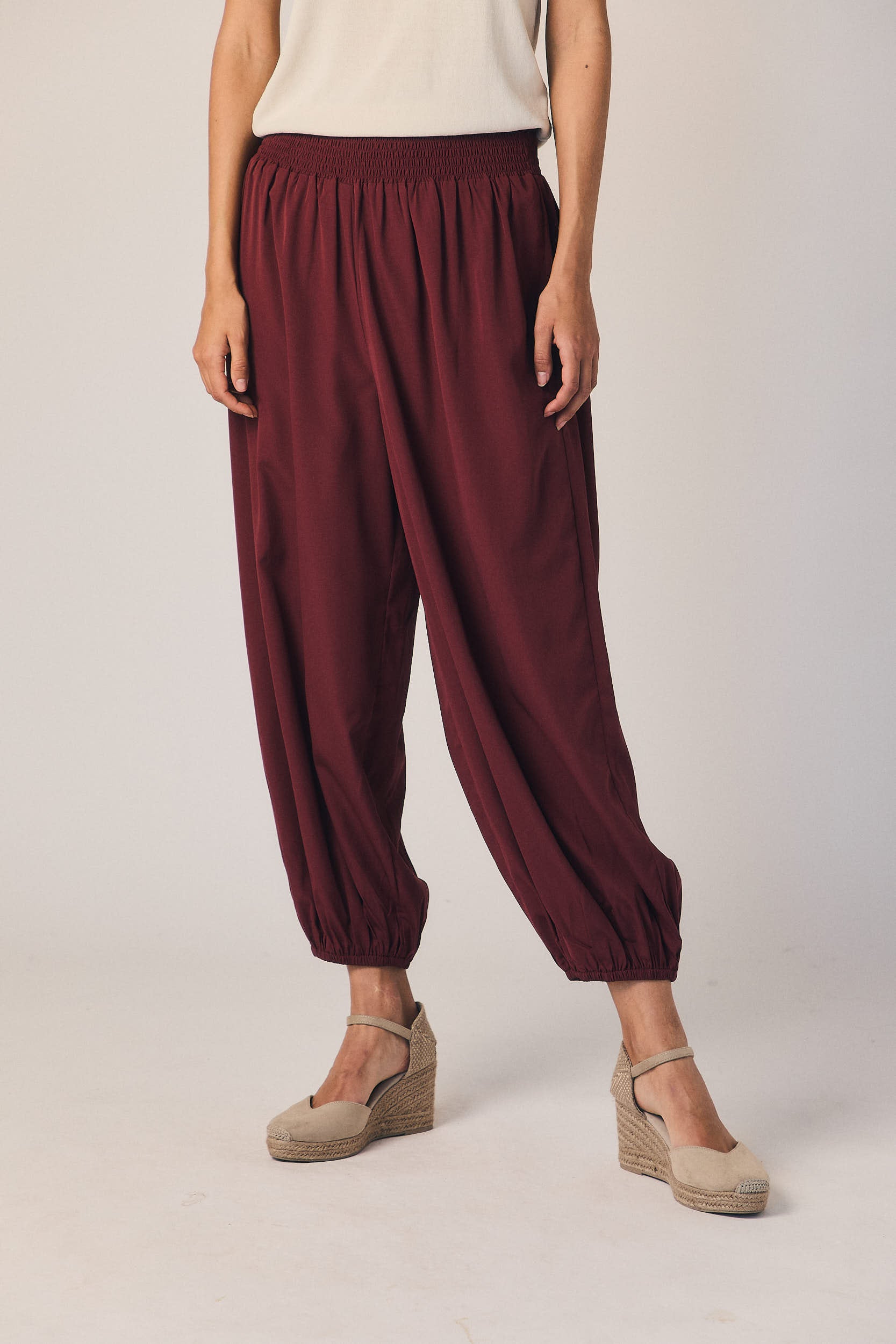 Pantalón tipo bombacho en granate. Cintura alta con nido de abeja elástico y volumen amplio en pierna que se ajusta en el bajo con goma. Caída fluida que aporta movimiento.
